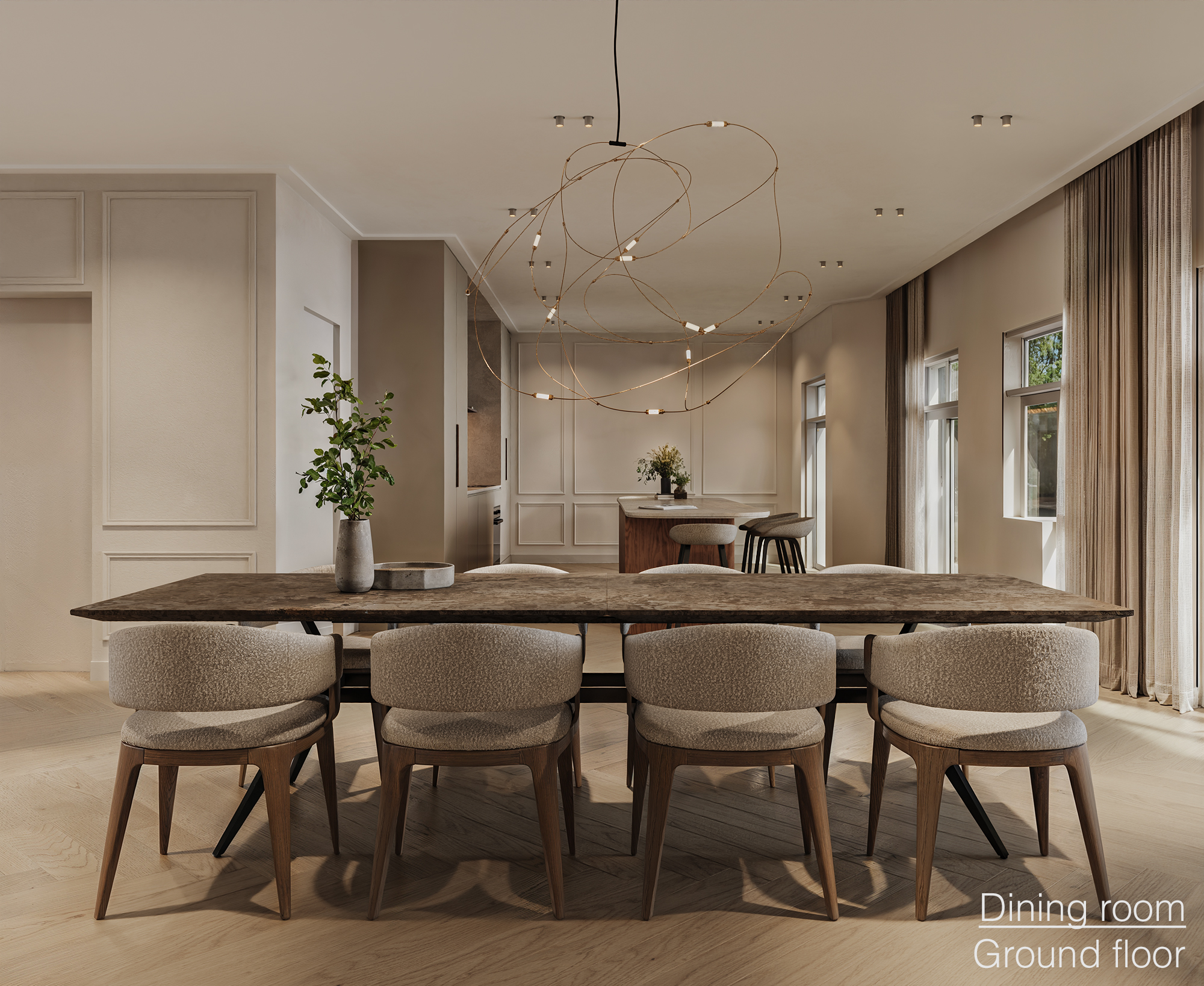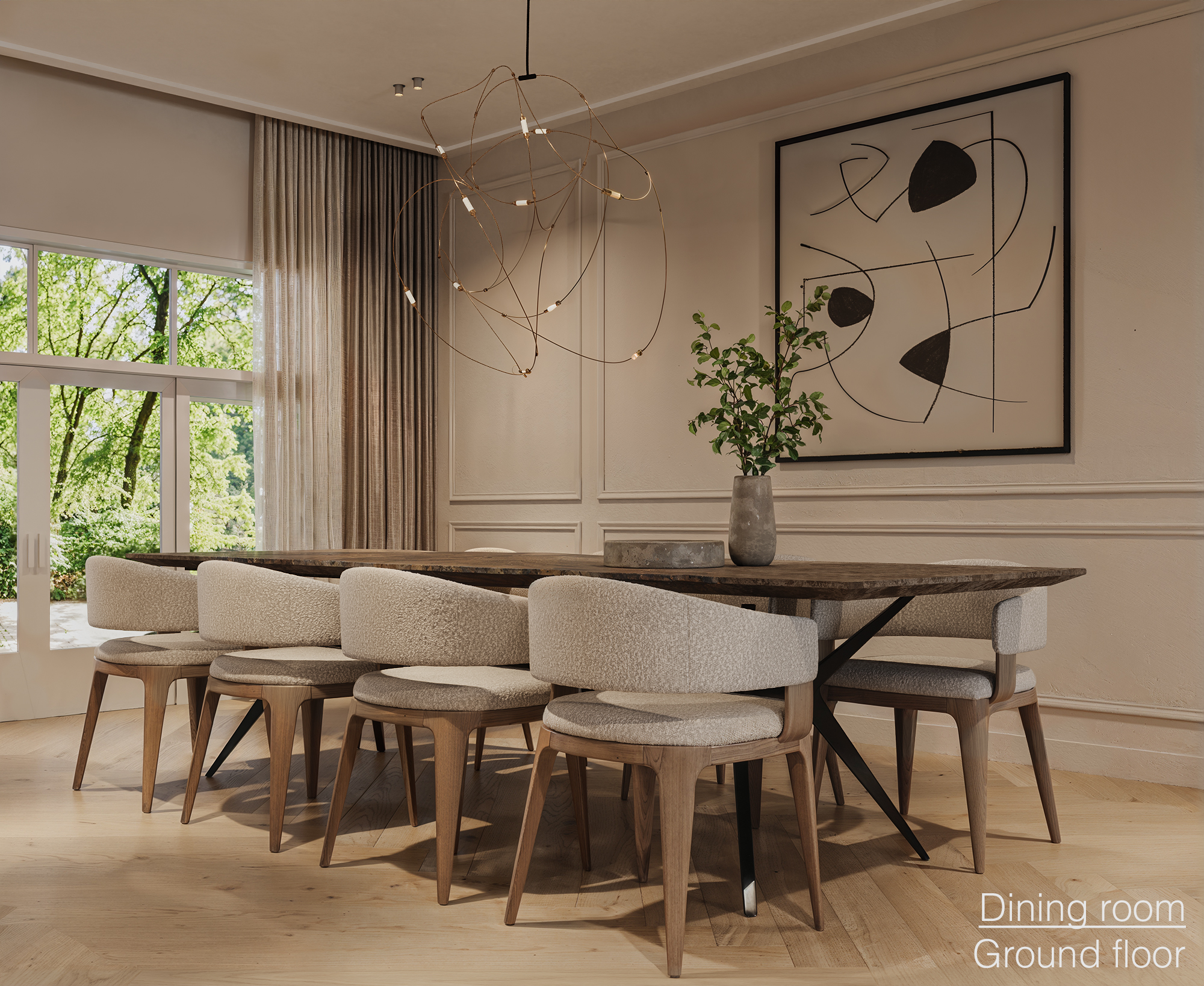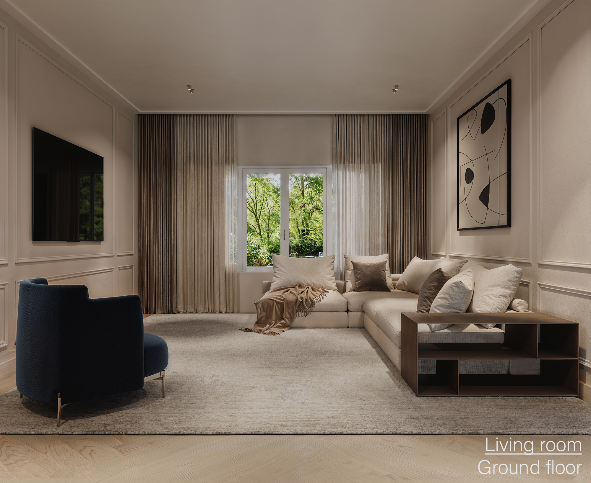 Aan de rechterzijde bevindt zich de royale, langgerekte doorzonwoonkamer die zich uitstrekt van de voor- tot de achterzijde van de woning. Dankzij de grote raampartijen aan beide kanten wordt de ruimte overspoeld met natuurlijk daglicht, wat zorgt voor een lichte en aangename leefomgeving.