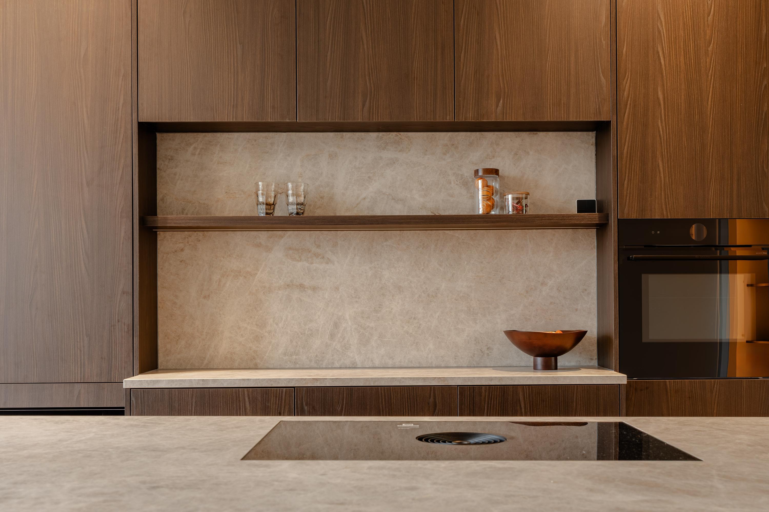 Το σαλόνι, με ύψος ταβανιού 3,28 μέτρα, ανοίγει σε μπαλκόνι με πρόσοψη και συνδέεται μέσω κομψών συρόμενων θυρών με την ειδικά σχεδιασμένη κουζίνα και τον χώρο τραπεζαρίας. Έπιπλα κατά παραγγελία ενσωματώνουν διακριτικά τους αποθηκευτικούς χώρους, ενώ το νησί της κουζίνας – εξοπλισμένο με επαγωγική εστία και Quooker – αποτελεί το επίκεντρο τόσο της καθημερινής ζωής όσο και της φιλοξενίας. Η ενδοδαπέδια θέρμανση εκτείνεται σε όλο το σπίτι, συνοδευόμενη από υψηλών προδιαγραφών μόνωση και διπλά τζάμια, εξασφαλίζοντας ενεργειακή απόδοση κλάσης Α.