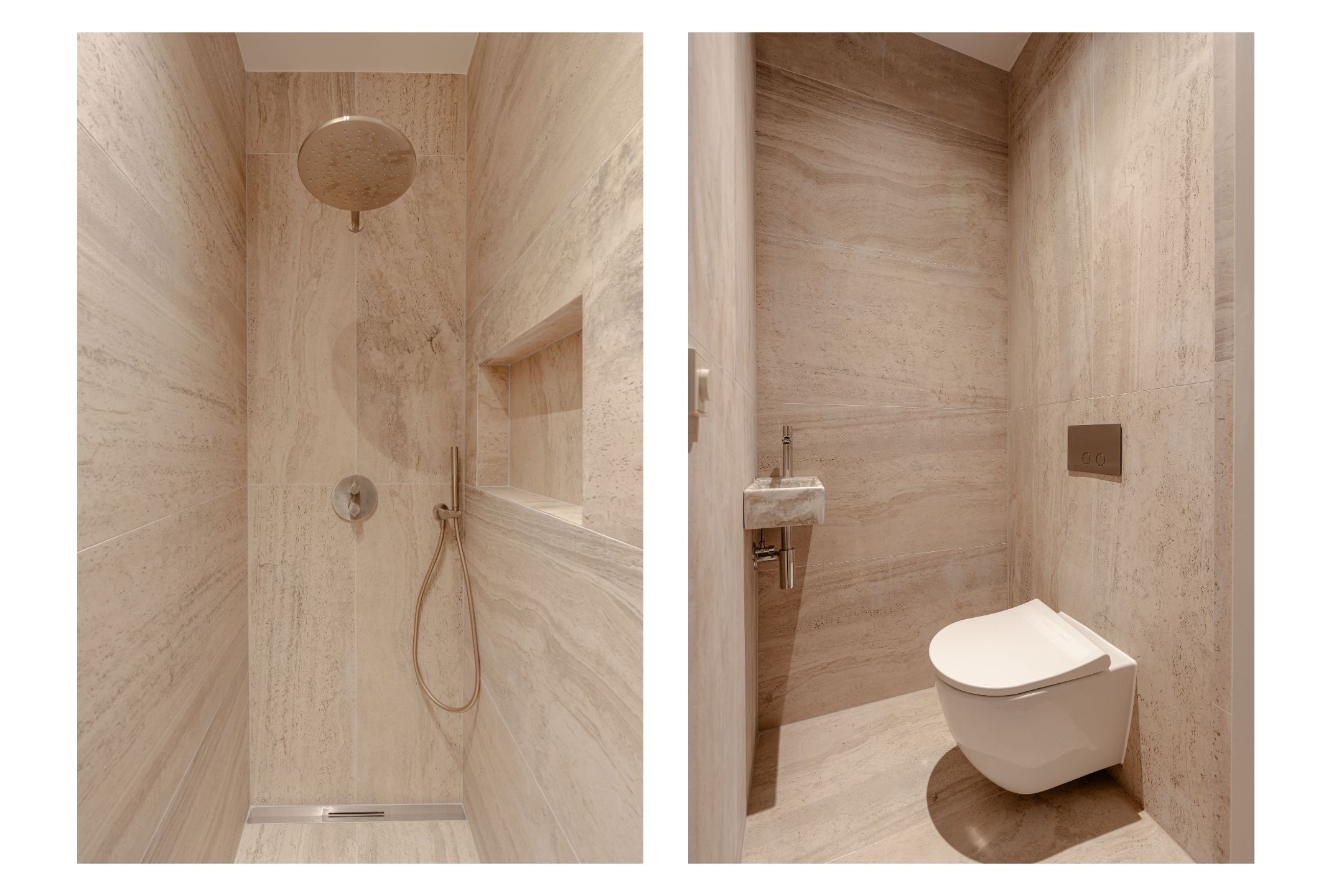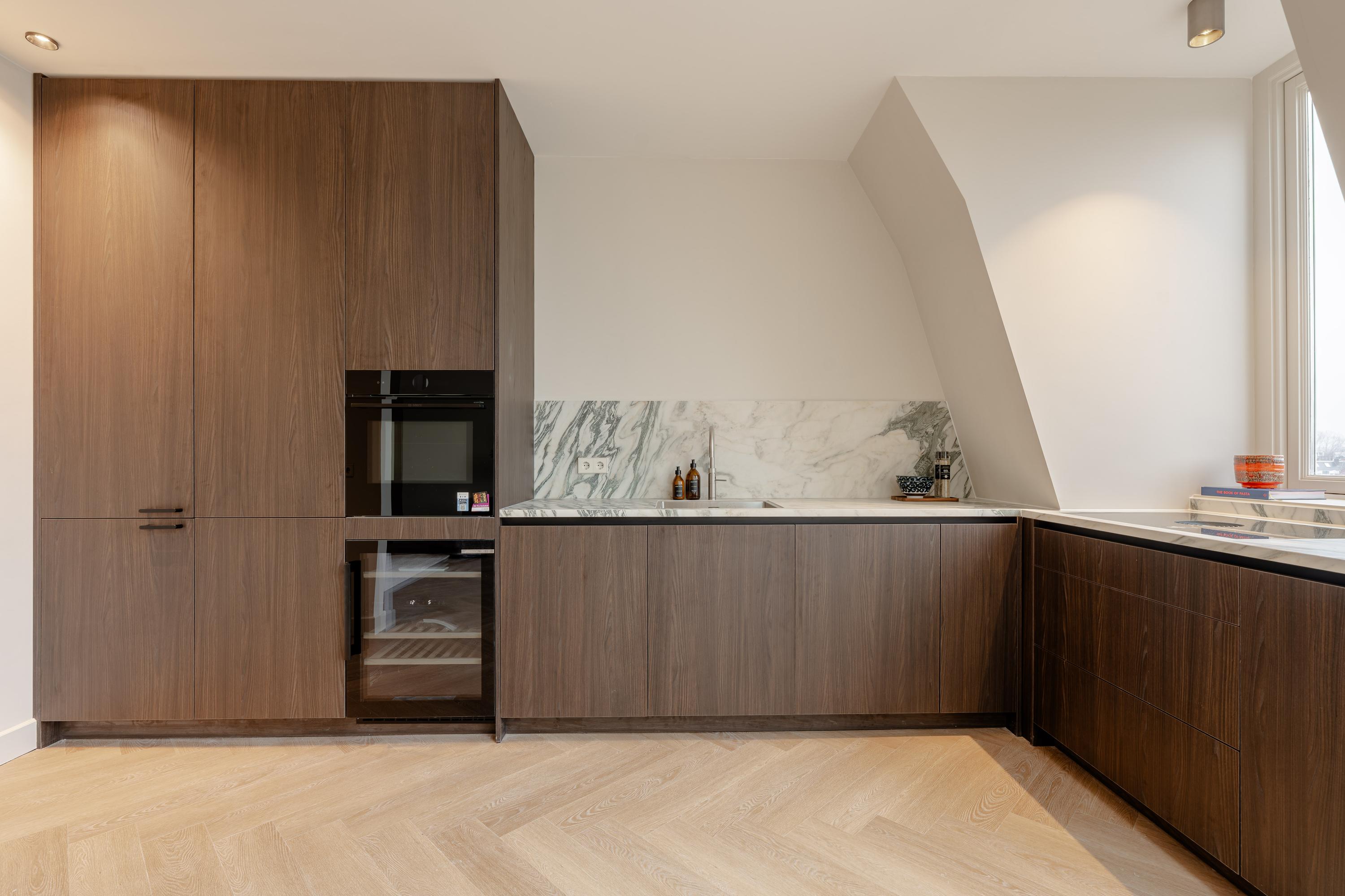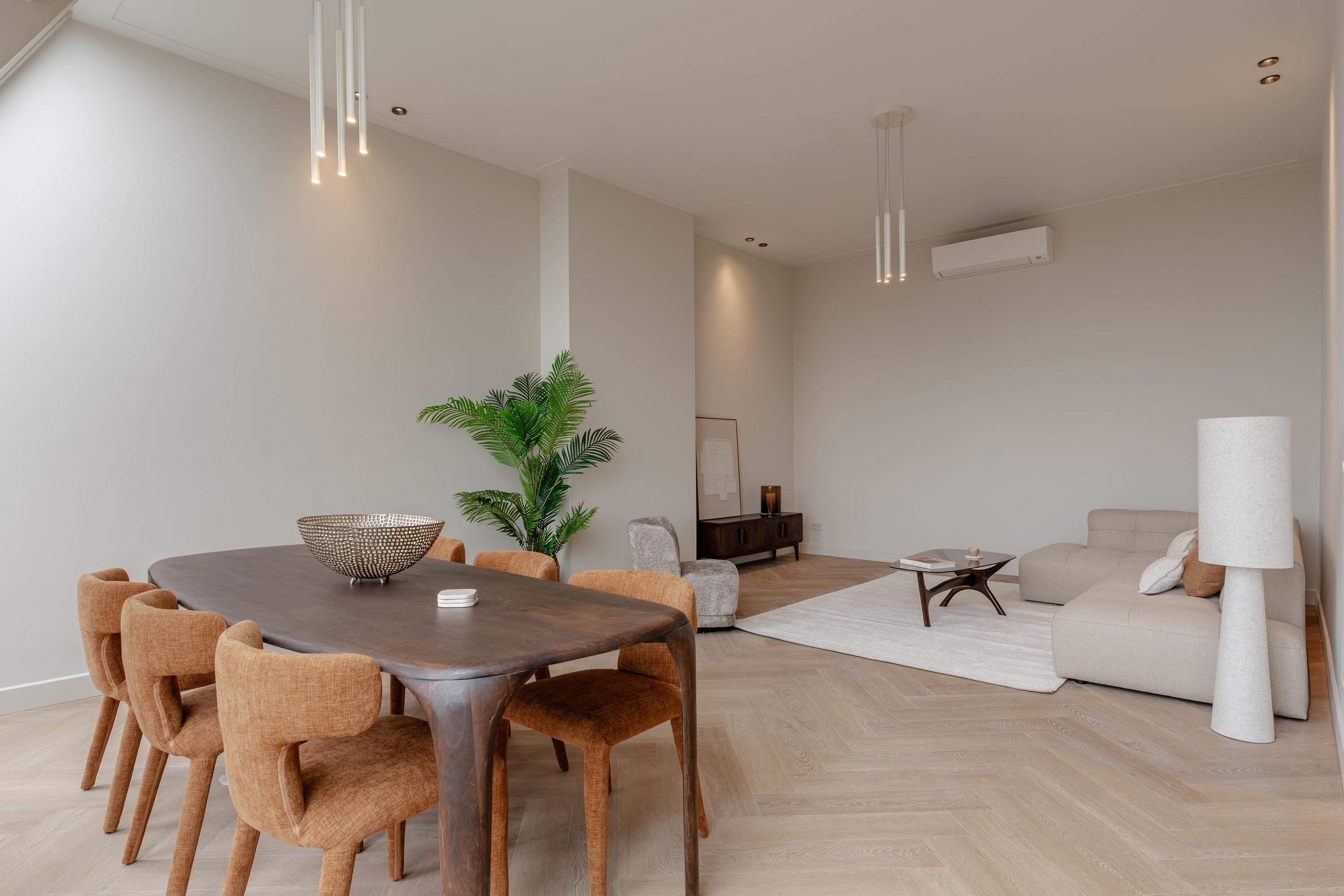 Το ευρύχωρο σαλόνι και η κουζίνα βρίσκονται στο πίσω μέρος, σχηματίζοντας μια ενιαία επιφάνεια, ιδανική τόσο για φιλοξενία όσο και για ήσυχα βράδια. Οι επιφάνειες είναι κομψές και διαχρονικές, ενώ το διαμέρισμα διαθέτει επαγωγική εστία, βρύση Quooker, φούρνο combi, ντουλάπα κλιματισμού και άφθονο αποθηκευτικό χώρο για μια άνετη καθημερινή ζωή. Δύο καλά διαμορφωμένα υπνοδωμάτια προσφέρουν ιδιωτικότητα και ησυχία, με τη master σουίτα να διαθέτει ιδιωτικό μπάνιο, ντους walk-in και διπλό νιπτήρα.