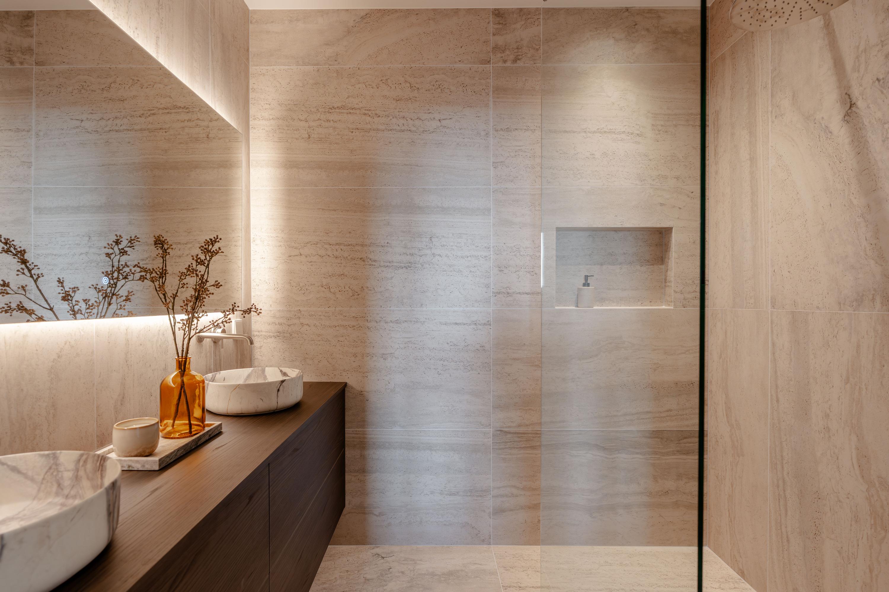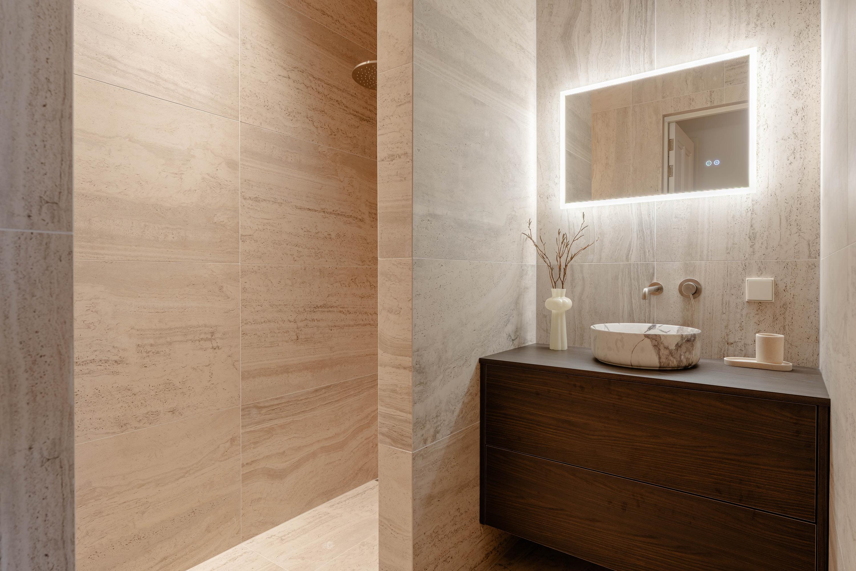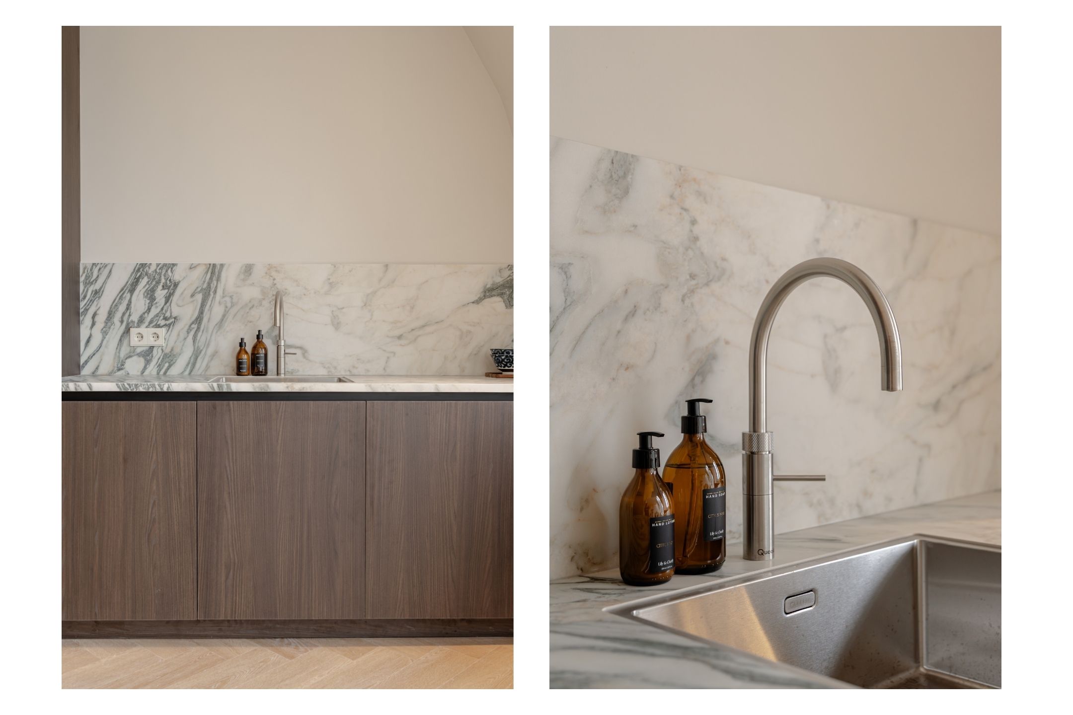 Το ευρύχωρο σαλόνι και η κουζίνα βρίσκονται στο πίσω μέρος, σχηματίζοντας μια ενιαία επιφάνεια, ιδανική τόσο για φιλοξενία όσο και για ήσυχα βράδια. Οι επιφάνειες είναι κομψές και διαχρονικές, ενώ το διαμέρισμα διαθέτει επαγωγική εστία, βρύση Quooker, φούρνο combi, ντουλάπα κλιματισμού και άφθονο αποθηκευτικό χώρο για μια άνετη καθημερινή ζωή. Δύο καλά διαμορφωμένα υπνοδωμάτια προσφέρουν ιδιωτικότητα και ησυχία, με τη master σουίτα να διαθέτει ιδιωτικό μπάνιο, ντους walk-in και διπλό νιπτήρα.