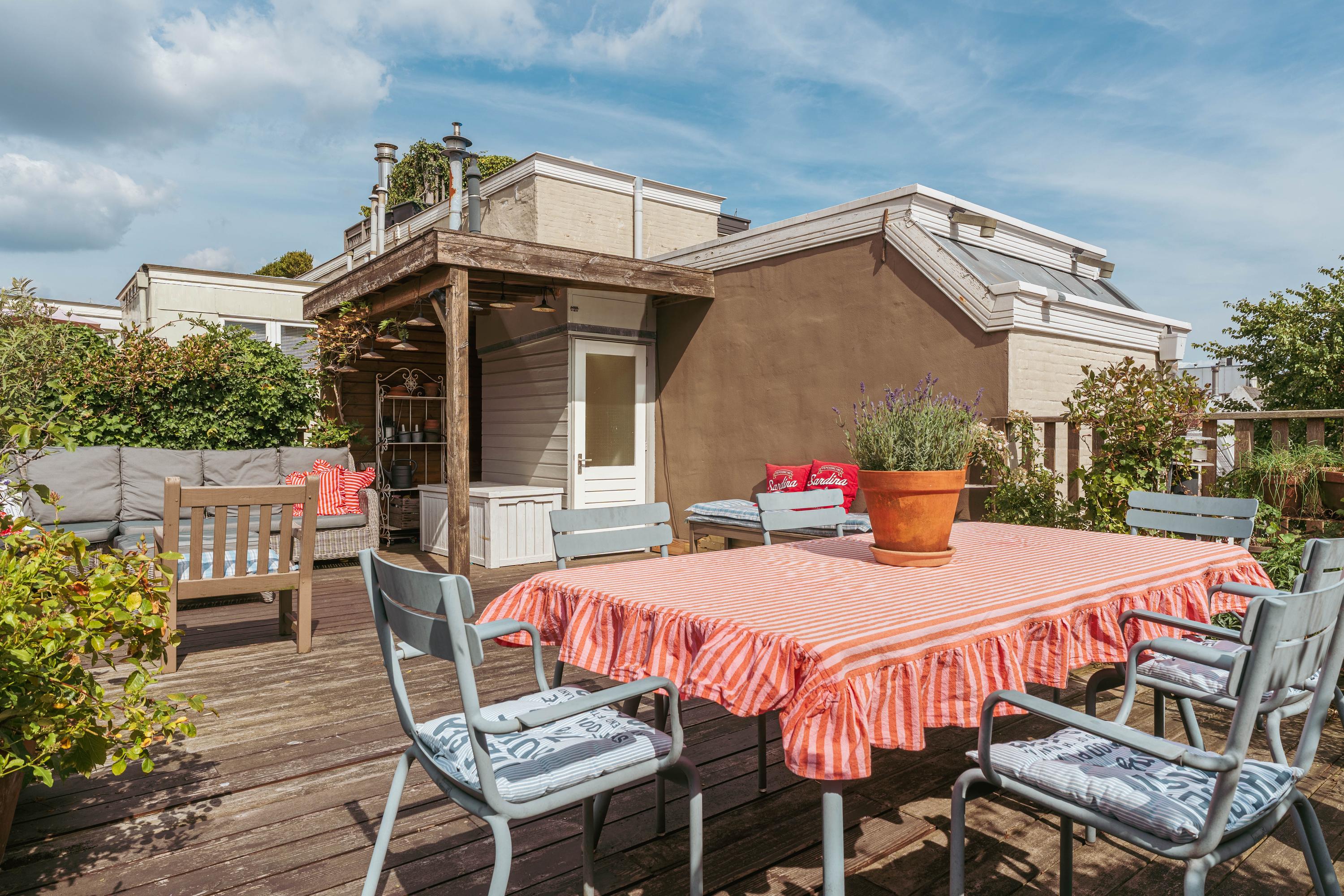 Η νότια βεράντα, επιμελώς διακοσμημένη με ξύλο και πράσινο, προσφέρει ιδιωτικό καταφύγιο πάνω από την πολύβουη καρδιά του Άμστερνταμ. Εδώ, το δείπνο και η χαλάρωση απολαμβάνονται όλο τον χρόνο, με πανοραμική θέα στις στέγες που επιβεβαιώνει τη μοναδική θέση του σπιτιού.