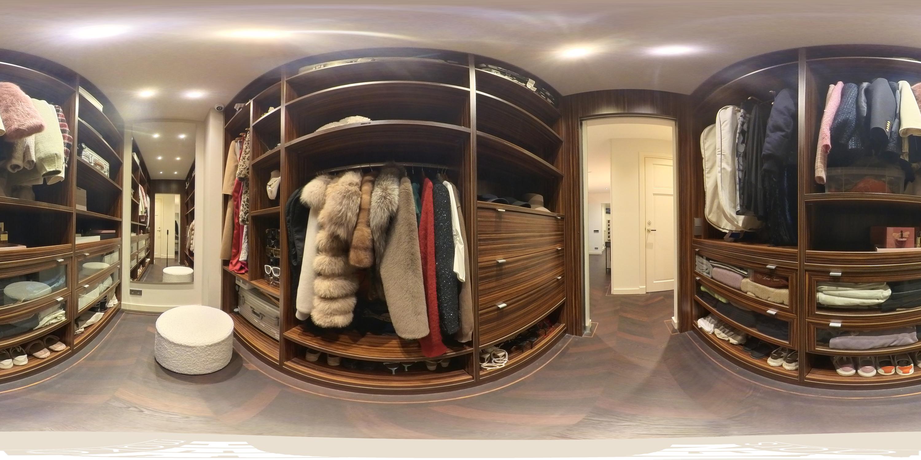 At the quiet rear of the apartment are three well-proportioned bedrooms and the modern bathroom. The master bedroom features built-in wardrobes, air conditioning, and electrically operated windows that allow natural light to fill the room. The second bedroom, also equipped with air conditioning, includes a custom-designed loft bed with integrated storage and a matching built-in desk. The third bedroom is ideal as a children’s room, guest room, or home office. All bedrooms offer access to the exceptionally wide balcony. A true eye-catcher is the generous walk-in closet, accessible via automatically controlled glass doors and executed in a luxurious, tailored design. Centrally located is the modern bathroom, equipped with a spacious bathtub, double washbasin with cabinet, and a large rain shower fitted with Axor taps. The designer radiator by Thermic adds both comfort and elegance. The lighting throughout the home is controlled via a Lutron system, developed in collaboration with Bang & Olufsen. The entire apartment features a beautiful and solid Wenge hardwood floor.