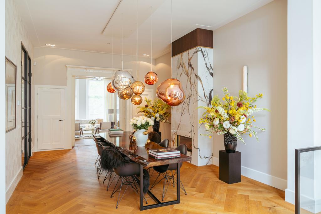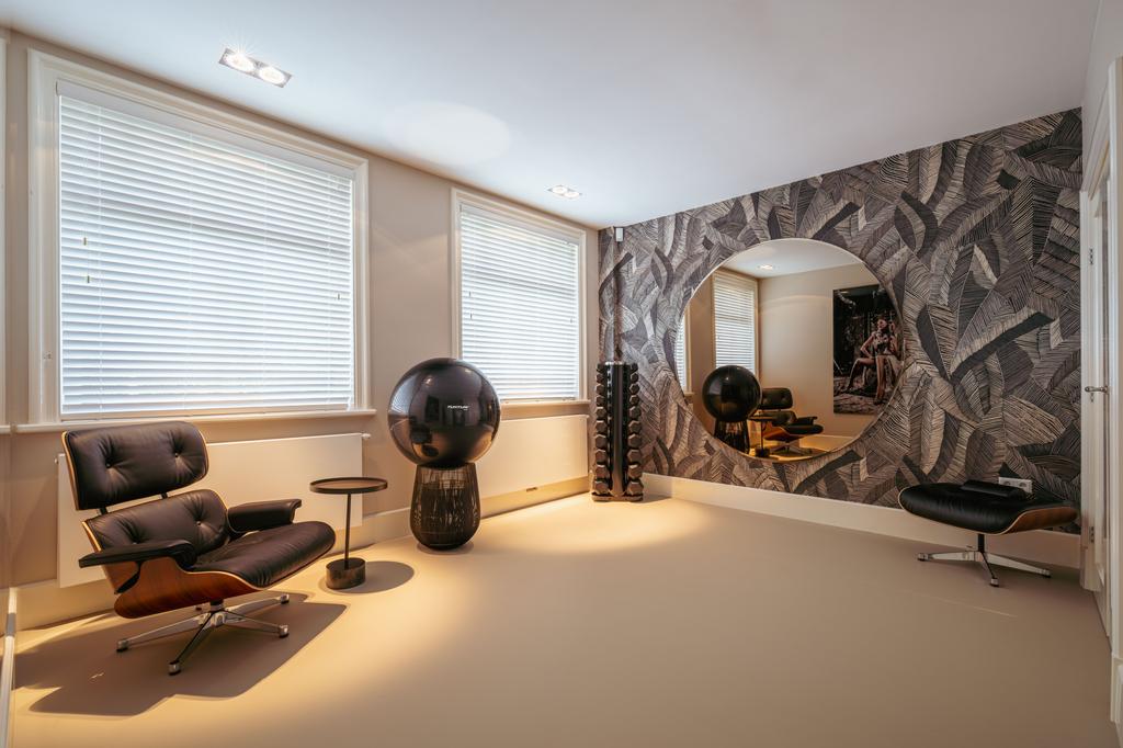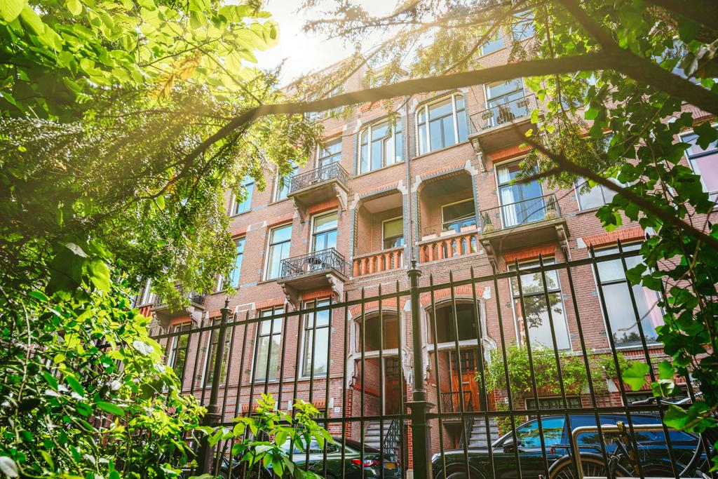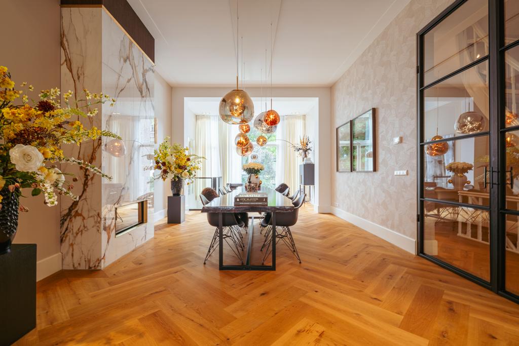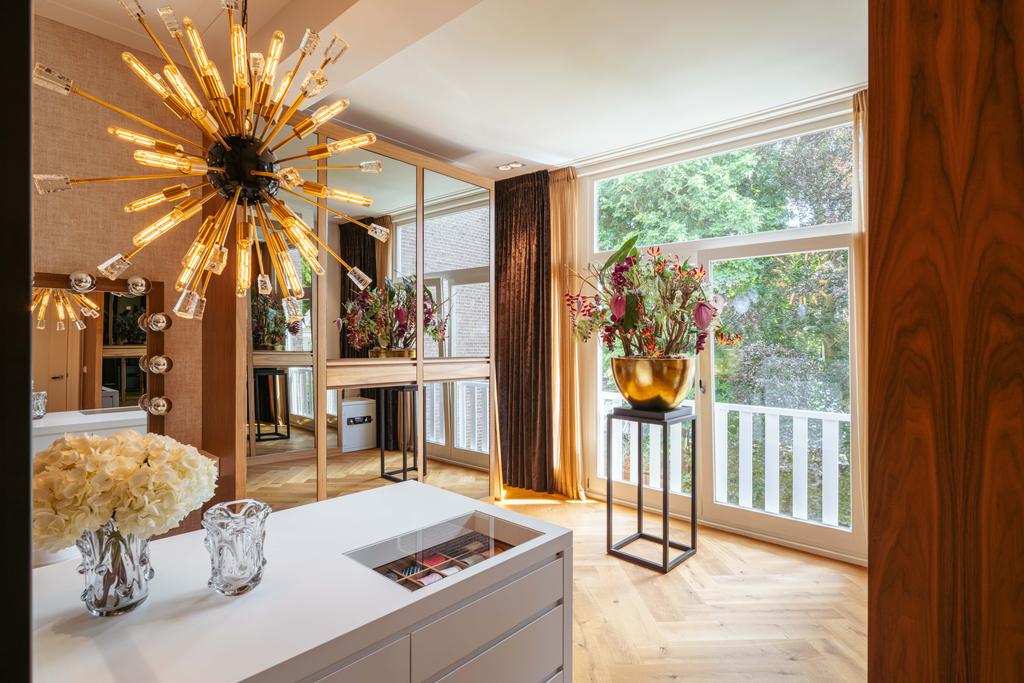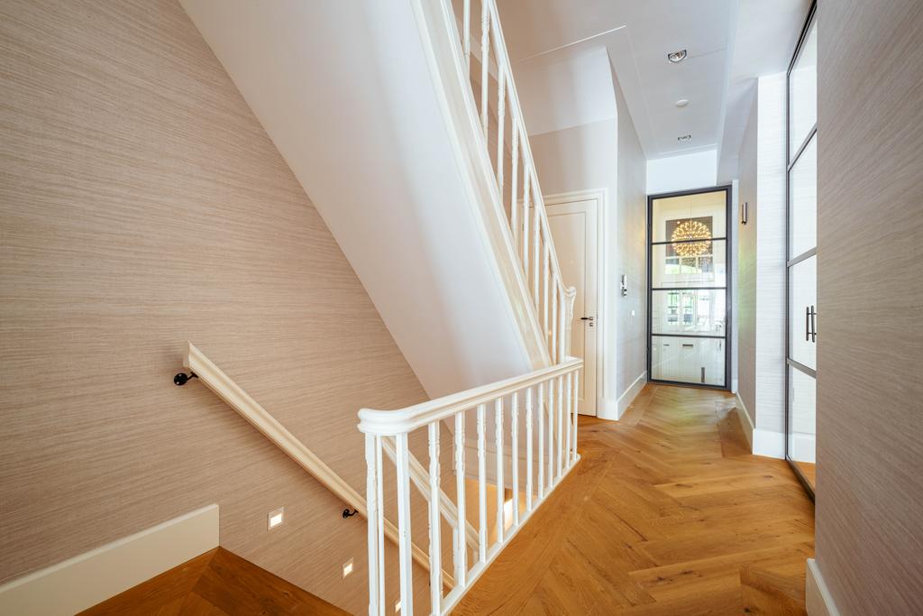 Μέσα από ένα προθάλαμο με επένδυση από μάρμαρο, το φως και η ατμόσφαιρα μεταβάλλονται χάρη στα ξύλινα πατώματα ψαροκόκαλου, τις ατσάλινες περιστρεφόμενες πόρτες και τις μαρμάρινες λεπτομέρειες. Ο κύριος χώρος υποδοχής, διακριτός με αυθεντικές εσωτερικές πόρτες και εντοιχισμένες βιβλιοθήκες, βλέπει στο Vondelpark και πλημμυρίζει από φυσικό φως. Διαθέτοντας έξι υπνοδωμάτια και τέσσερα μπάνια, συμπεριλαμβανομένης μιας φωτεινής master σουίτας και ενός ευέλικτου δωματίου φιλοξενίας ή γραφείου, το ακίνητο προσφέρει ιδιωτικότητα χωρίς να αποκόπτεται από τον παλμό της πόλης.