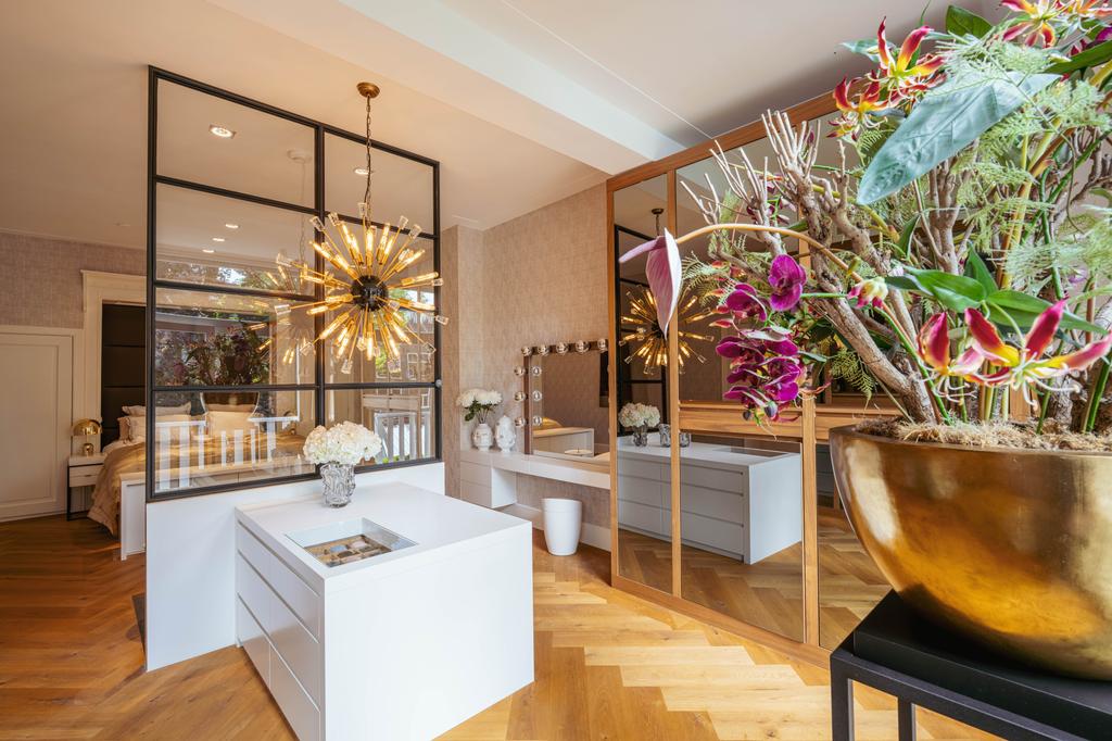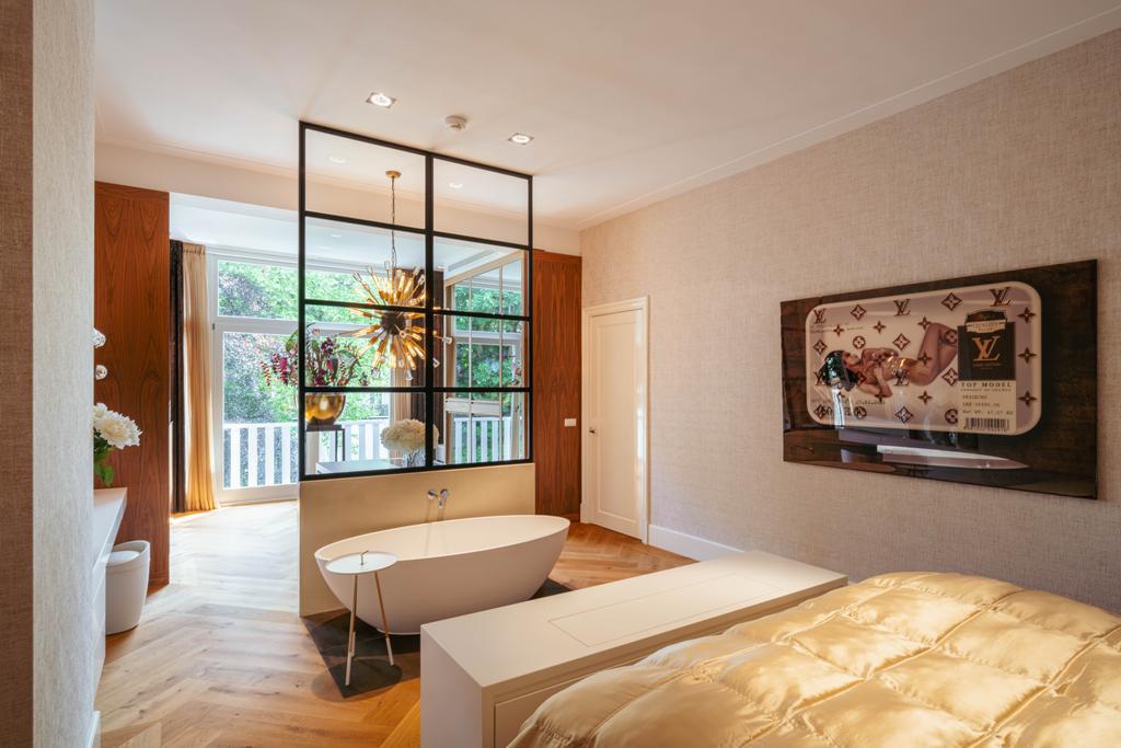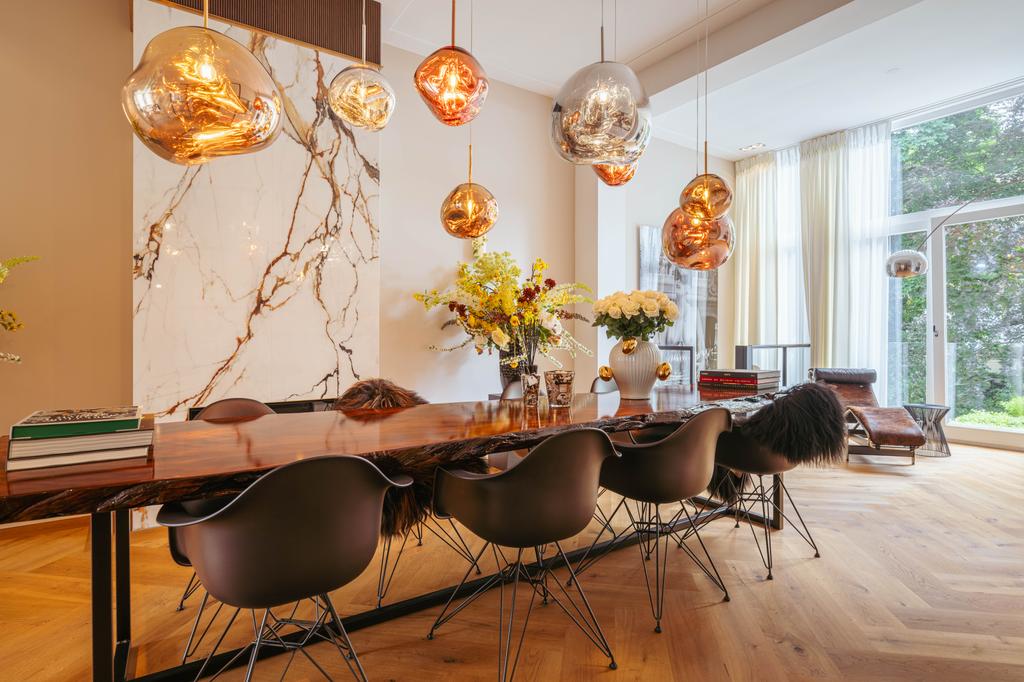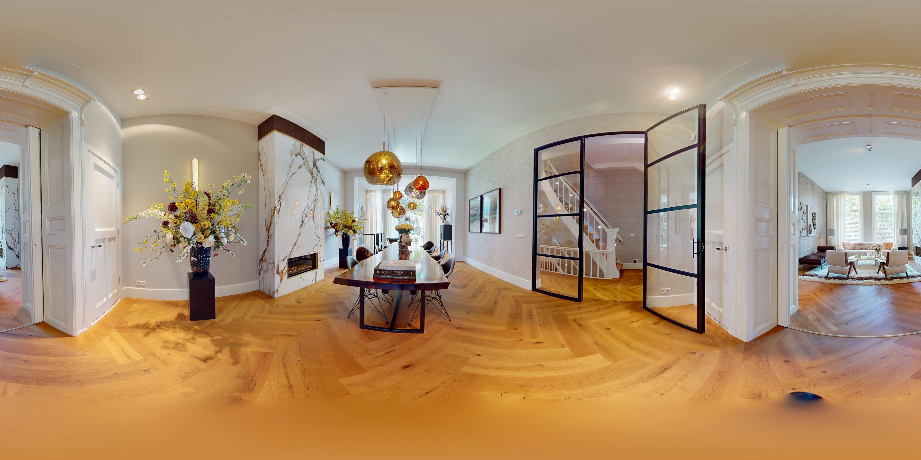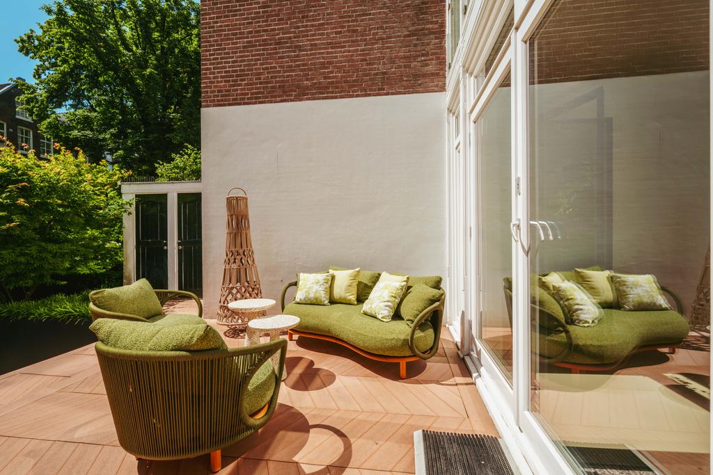 Μέσα από ένα προθάλαμο με επένδυση από μάρμαρο, το φως και η ατμόσφαιρα μεταβάλλονται χάρη στα ξύλινα πατώματα ψαροκόκαλου, τις ατσάλινες περιστρεφόμενες πόρτες και τις μαρμάρινες λεπτομέρειες. Ο κύριος χώρος υποδοχής, διακριτός με αυθεντικές εσωτερικές πόρτες και εντοιχισμένες βιβλιοθήκες, βλέπει στο Vondelpark και πλημμυρίζει από φυσικό φως. Διαθέτοντας έξι υπνοδωμάτια και τέσσερα μπάνια, συμπεριλαμβανομένης μιας φωτεινής master σουίτας και ενός ευέλικτου δωματίου φιλοξενίας ή γραφείου, το ακίνητο προσφέρει ιδιωτικότητα χωρίς να αποκόπτεται από τον παλμό της πόλης.