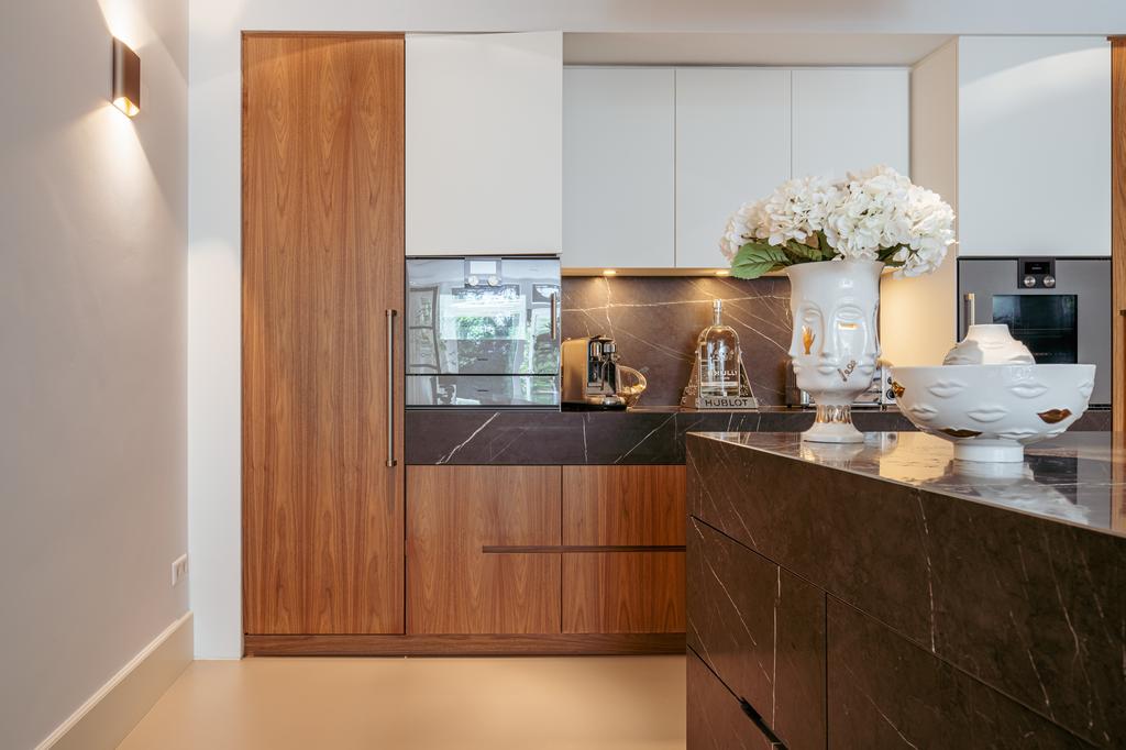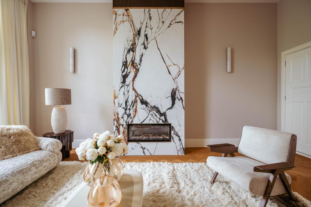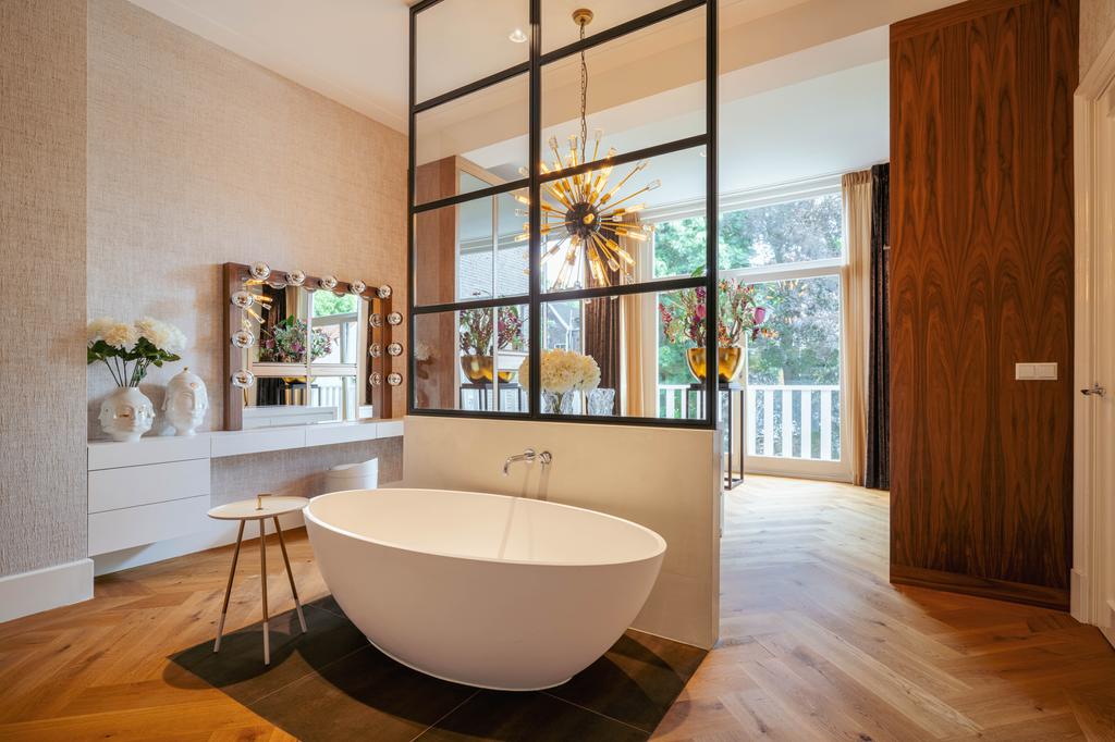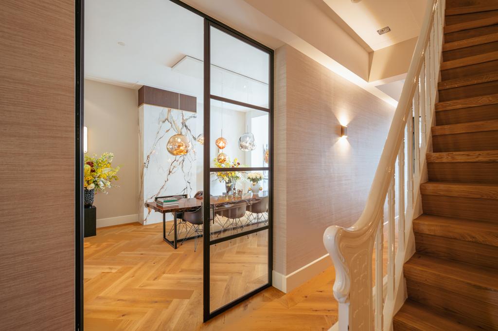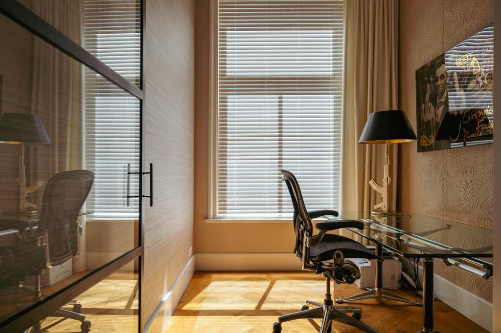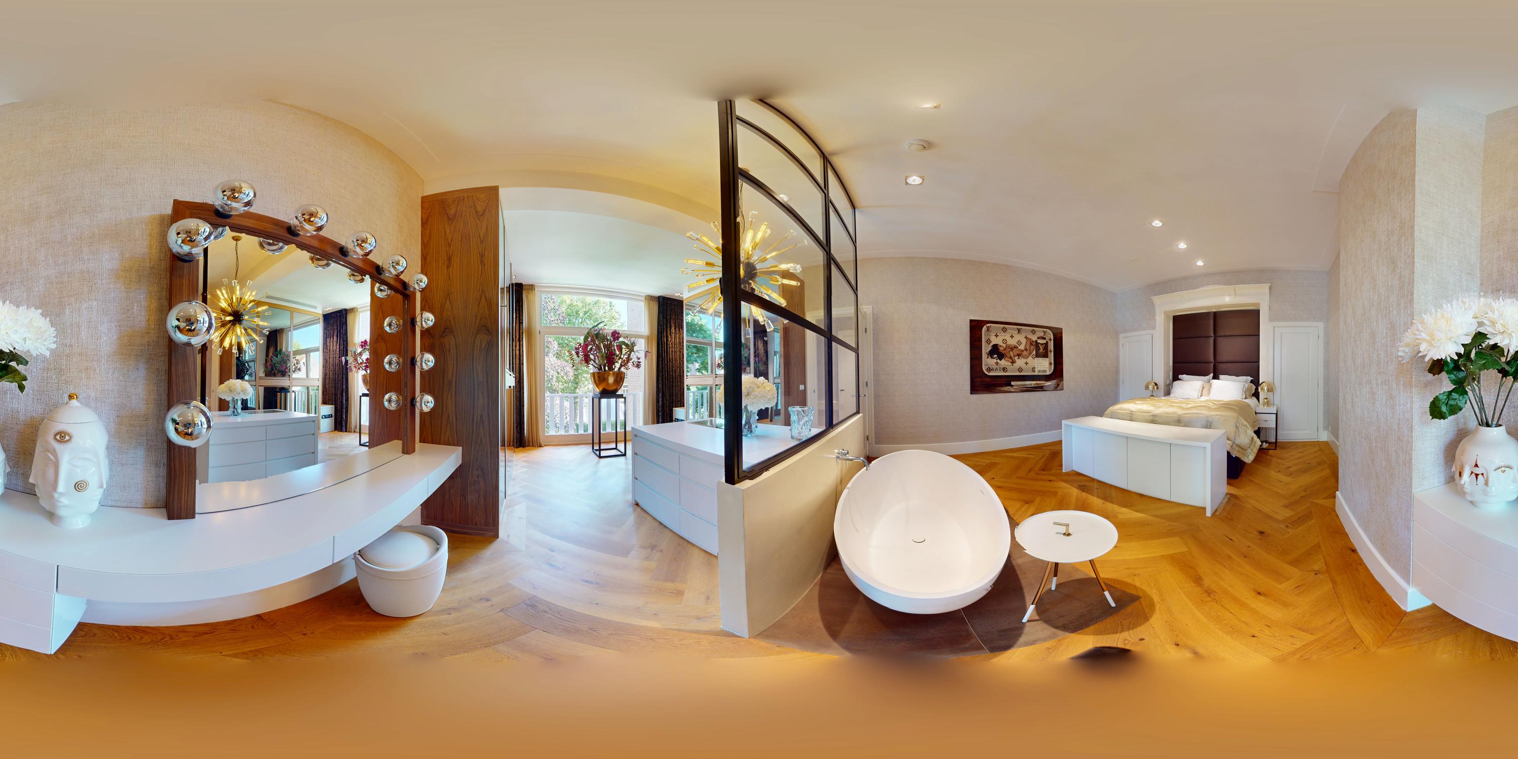Μέσα από ένα προθάλαμο με επένδυση από μάρμαρο, το φως και η ατμόσφαιρα μεταβάλλονται χάρη στα ξύλινα πατώματα ψαροκόκαλου, τις ατσάλινες περιστρεφόμενες πόρτες και τις μαρμάρινες λεπτομέρειες. Ο κύριος χώρος υποδοχής, διακριτός με αυθεντικές εσωτερικές πόρτες και εντοιχισμένες βιβλιοθήκες, βλέπει στο Vondelpark και πλημμυρίζει από φυσικό φως. Διαθέτοντας έξι υπνοδωμάτια και τέσσερα μπάνια, συμπεριλαμβανομένης μιας φωτεινής master σουίτας και ενός ευέλικτου δωματίου φιλοξενίας ή γραφείου, το ακίνητο προσφέρει ιδιωτικότητα χωρίς να αποκόπτεται από τον παλμό της πόλης.