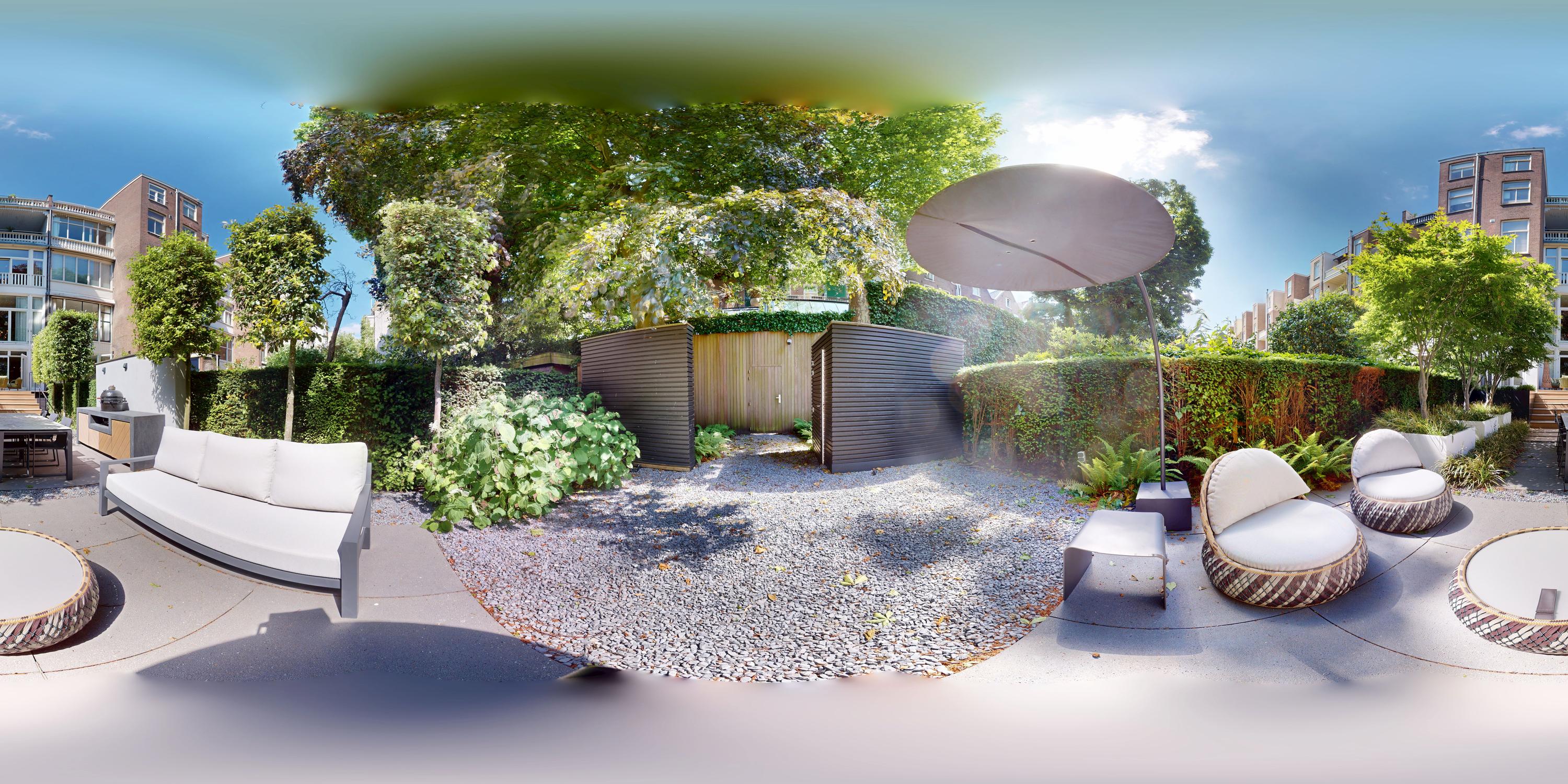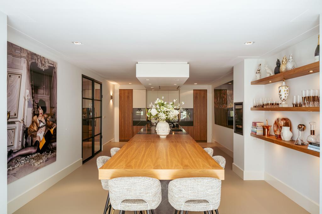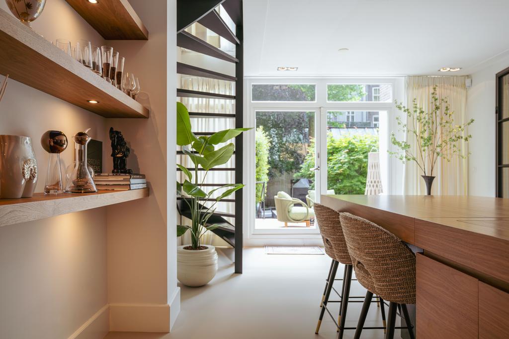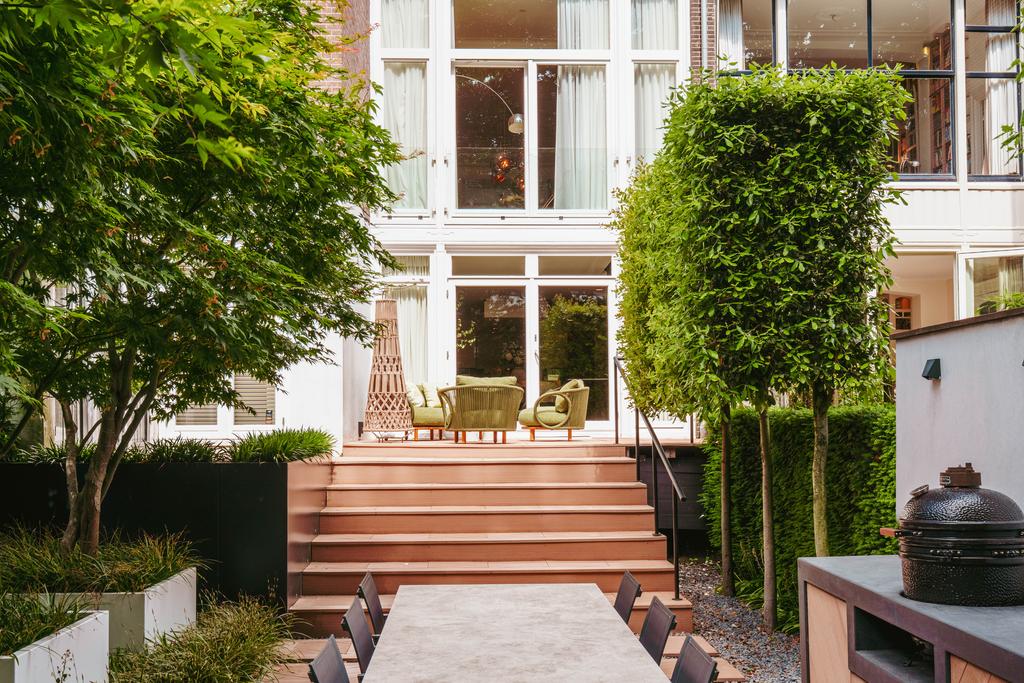 Η ανοιχτή κουζίνα στο χαμηλότερο επίπεδο, εξοπλισμένη με συσκευές Gaggenau και πάγκο από συμπαγή πέτρα, αποτελεί το επίκεντρο της καθημερινής ζωής. Γαλλικές πόρτες οδηγούν σε ευρύχωρη βεράντα και στον νότιο κήπο των 157 τ.μ., σχεδιασμένο από τον Erik van Gelder, με εξωτερική κουζίνα—μια σπάνια όαση με ιδιωτική πρόσβαση από τη Schapenburgerpad. Σε κάθε όροφο, ο προσεγμένος σχεδιασμός αναβαθμίζει τη λειτουργικότητα: ασανσέρ, μερική ενδοδαπέδια θέρμανση και πολλαπλά τζάκια υγραερίου εξασφαλίζουν άνεση όλο τον χρόνο.