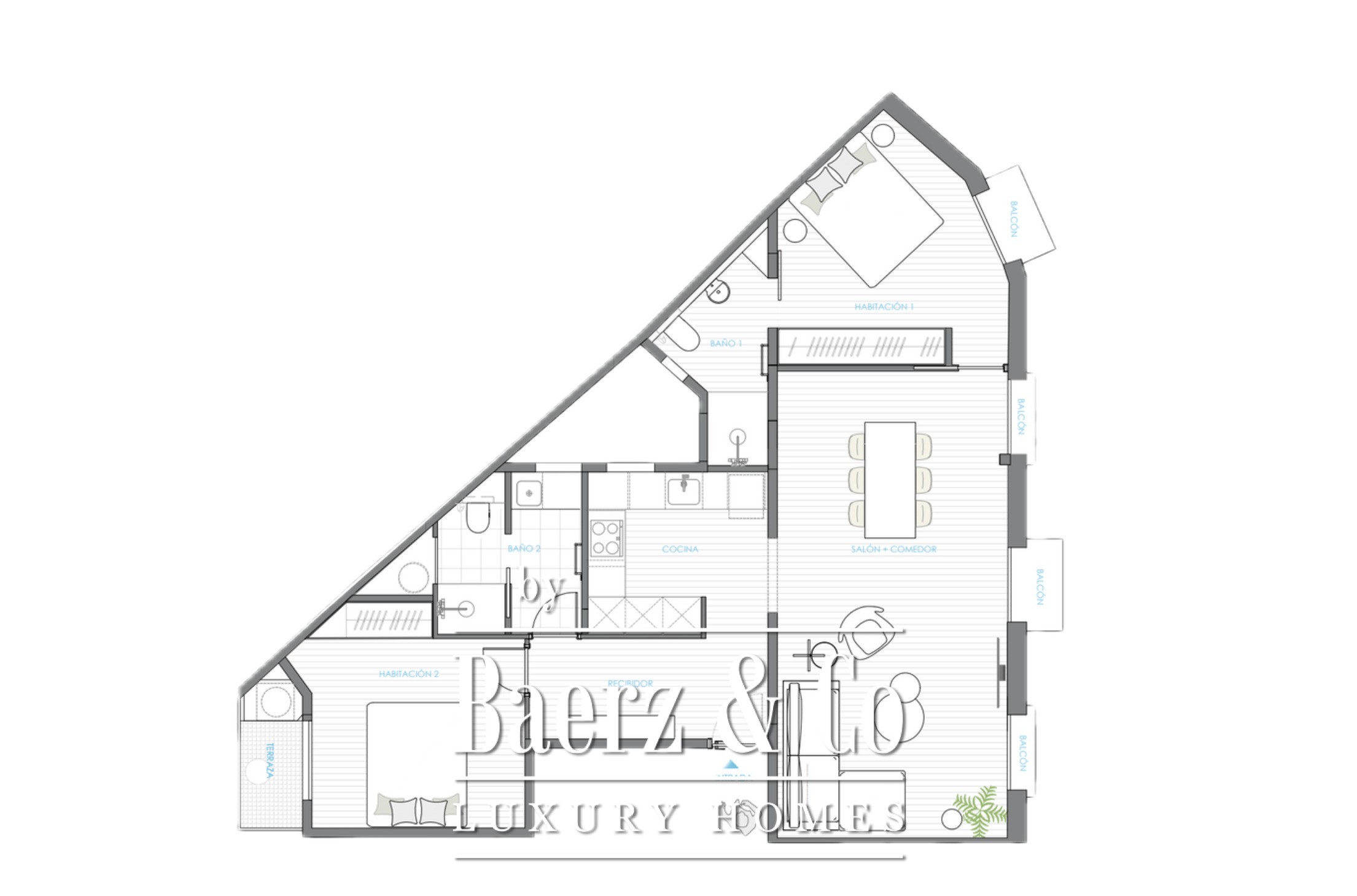 Η σύγχρονη διαρρύθμιση του διαμερίσματος εκτείνεται από το φωτεινό καθιστικό και την τραπεζαρία έως την πλήρως εξοπλισμένη μοντέρνα κουζίνα, κάθε χώρος λούζεται από το άπλετο φυσικό φως που προσφέρουν τρία εξωτερικά μπαλκόνια των 3,38 τ.μ. το καθένα. Δύο ευρύχωρα υπνοδωμάτια και δύο κομψά μπάνια προσφέρουν ιδιωτικότητα και άνεση, ενώ τα προσεκτικά αποκατεστημένα αρχιτεκτονικά στοιχεία διατηρούν τον αυθεντικό χαρακτήρα του κτιρίου.
