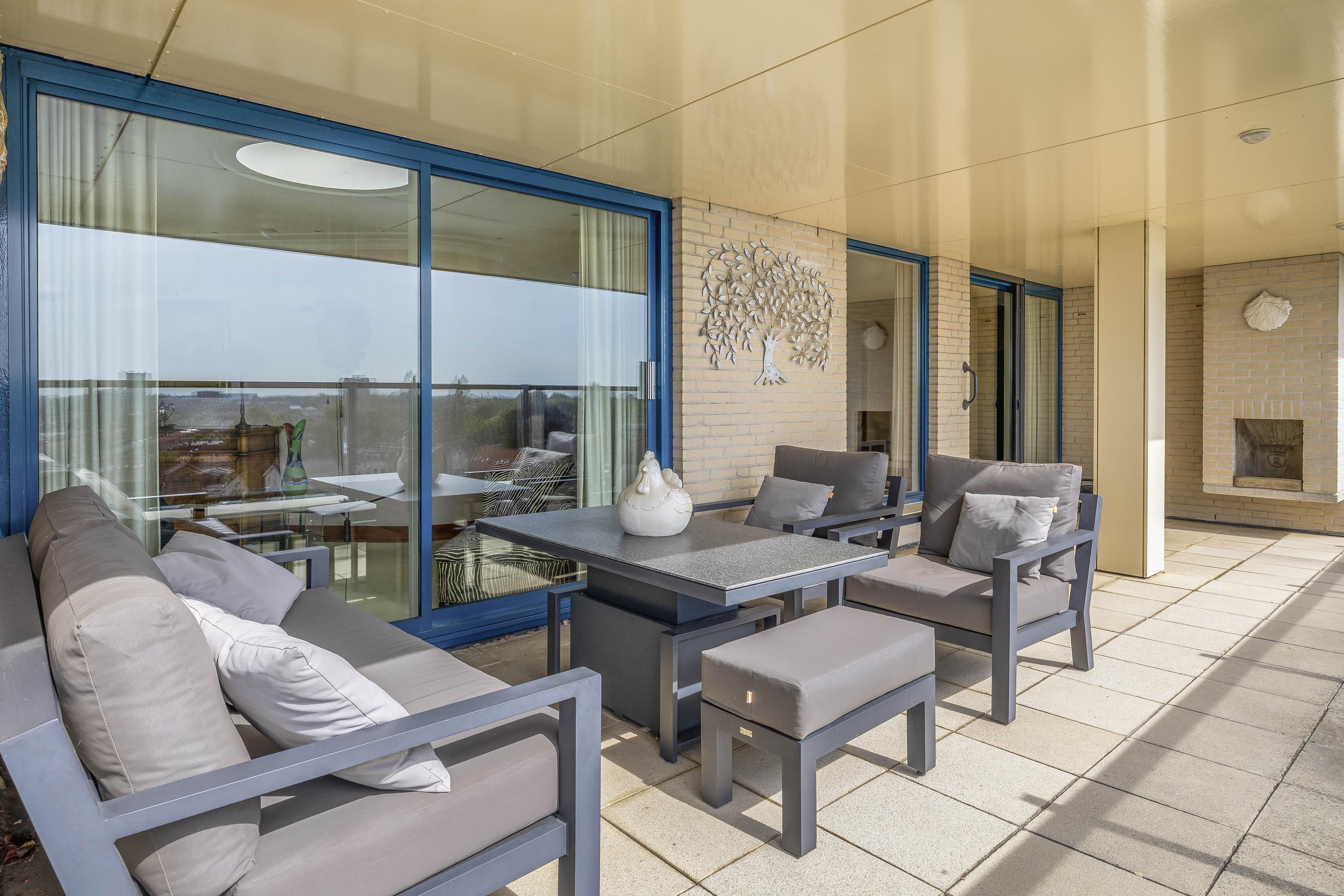 Το σαλόνι περιβάλλεται από παράθυρα από το δάπεδο μέχρι την οροφή, πλημμυρίζοντας τον χώρο με φυσικό φως και προσφέροντας άμεση πρόσβαση σε βεράντα 78 τ.μ.. Εδώ, η θέα προς τον ποταμό και το τοπίο της Krimpenerwaard παραμένει ανεμπόδιστη, ενώ το υπαίθριο τζάκι προσκαλεί σε διαχρονική υπαίθρια διαβίωση. Η μπροστινή βεράντα πλαισιώνει το πανόραμα της πόλης του Capelle aan den IJssel, παρέχοντας εναλλαγή ανάμεσα σε ήλιο ή σκιά όλο τον χρόνο.
