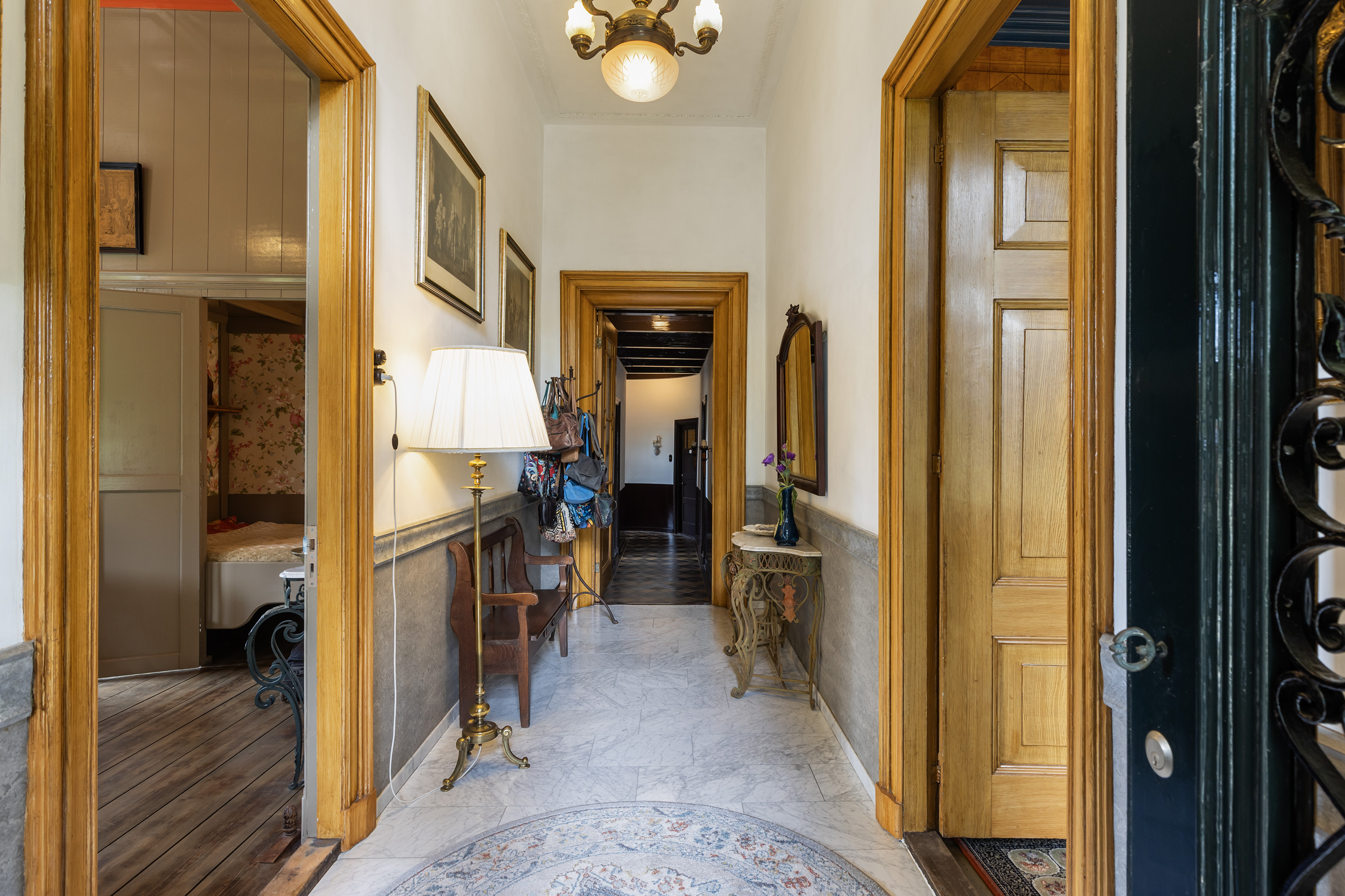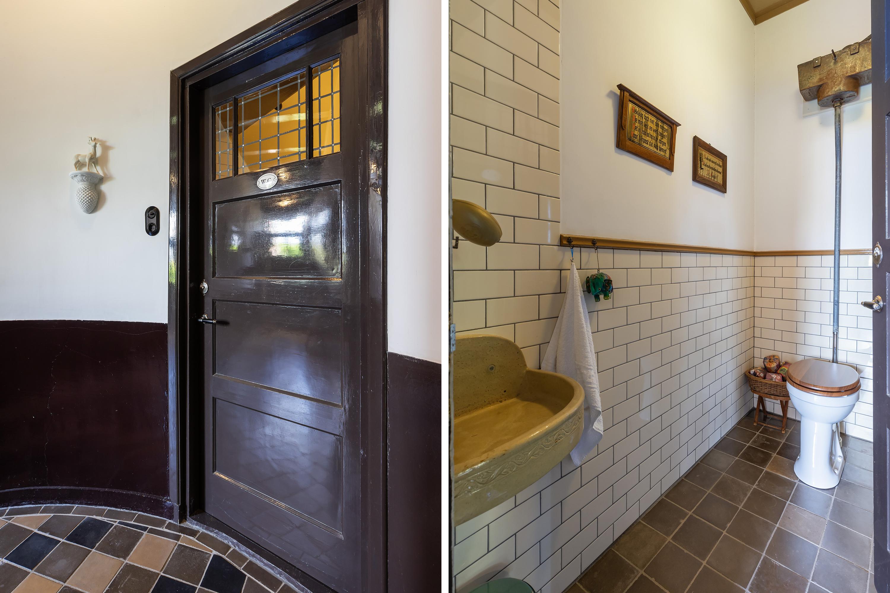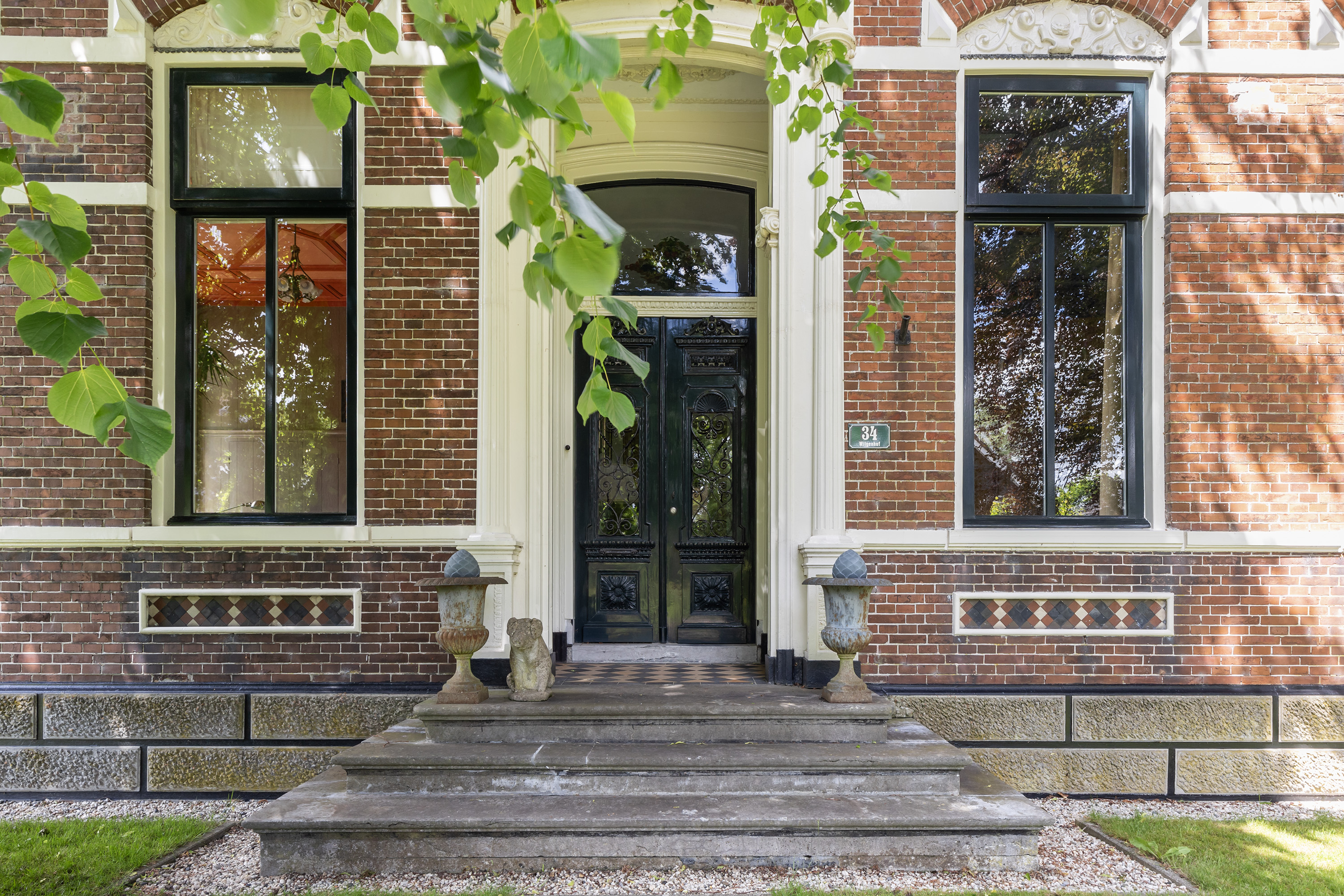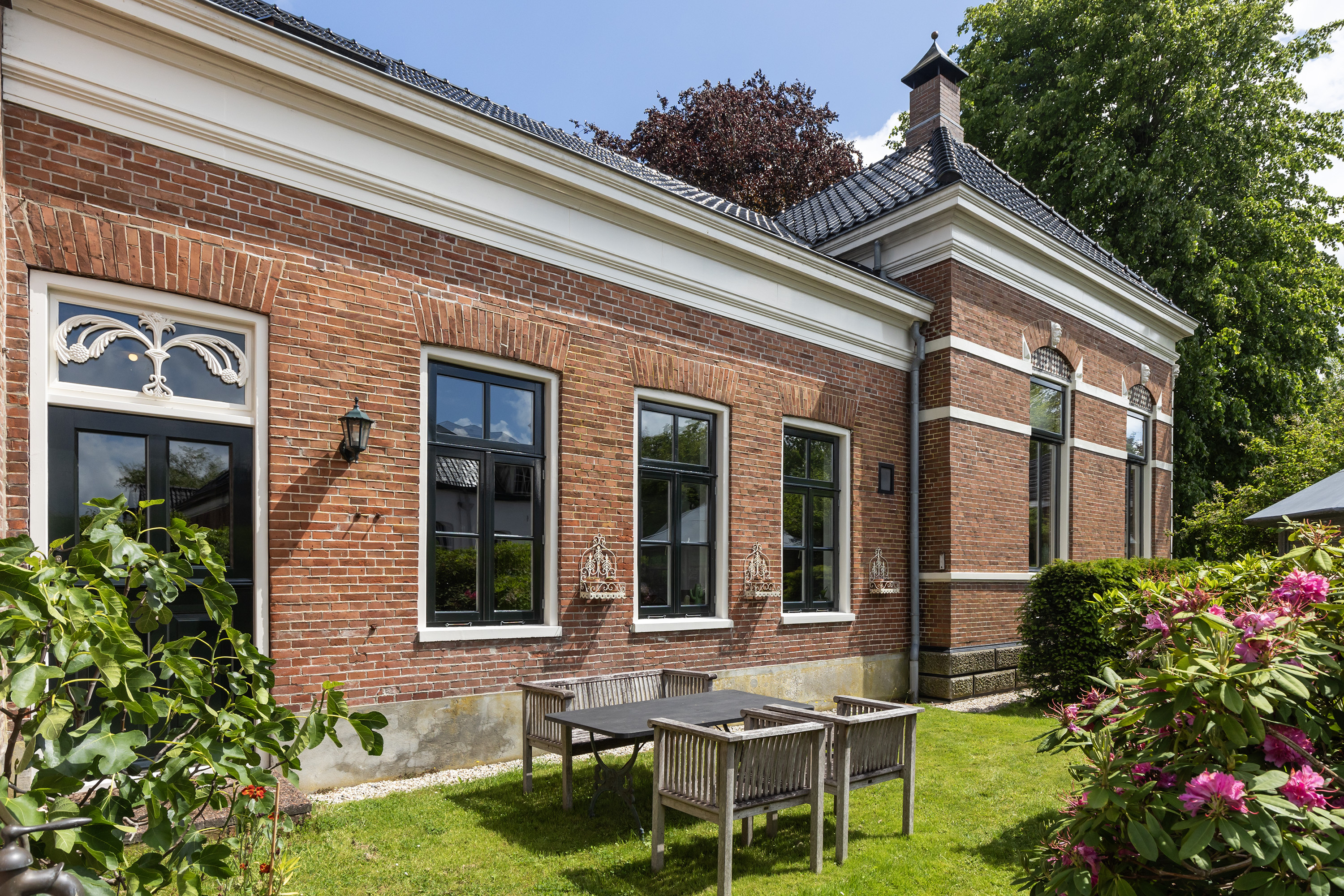 Η κύρια πρόσοψη, με σκαλοπάτια από φυσική πέτρα και διακοσμητική τοιχοποιία, αντικατοπτρίζει την κλασική αρχιτεκτονική του Groningen. Στο εσωτερικό, αποκατεστημένα αυθεντικά στοιχεία—μαρμάρινα δάπεδα, ψηλά παράθυρα, περίτεχνες ξυλουργικές εργασίες—ορίζουν μια ακολουθία επιβλητικών χώρων υποδοχής και ήρεμων ιδιωτικών δωματίων. Η κουζίνα διακρίνεται για τα πέτρινα δάπεδα και την παραδοσιακή κουζίνα AGA, ενώ τα ευρύχωρα μπάνια διαθέτουν επενδύσεις από πέτρα και ξύλο κάτω από φεγγίτες. Ο πρώτος όροφος φιλοξενεί ήσυχα υπνοδωμάτια, γραφείο και ένα γαλήνιο μπάνιο με φως από Velux φεγγίτες και θερμαινόμενο με υβριδική αντλία θερμότητας.