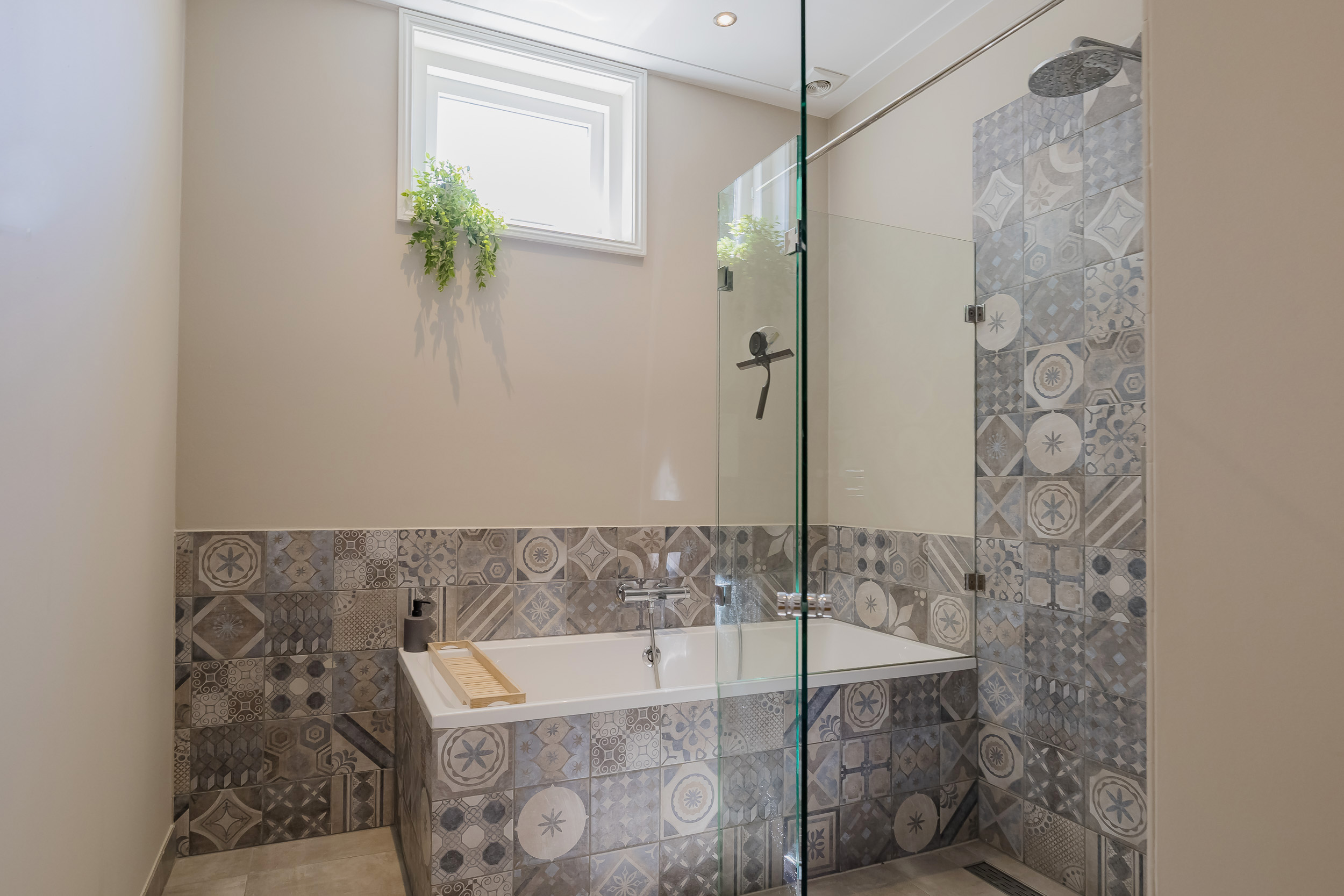 Ο πρώτος όροφος διαθέτει τρία ευρύχωρα υπνοδωμάτια, ένα πολυτελές μπάνιο με ντουζιέρα, ανεξάρτητη μπανιέρα και διπλούς νιπτήρες, καθώς και έναν ευέλικτο χώρο πλυντηρίου ή γραφείου. Ολόκληρος ο επάνω όροφος λειτουργεί ως γαλήνια master σουίτα με λότζια δυτικής όψης, γκαρνταρόμπα και δεύτερο ιδιωτικό μπάνιο.