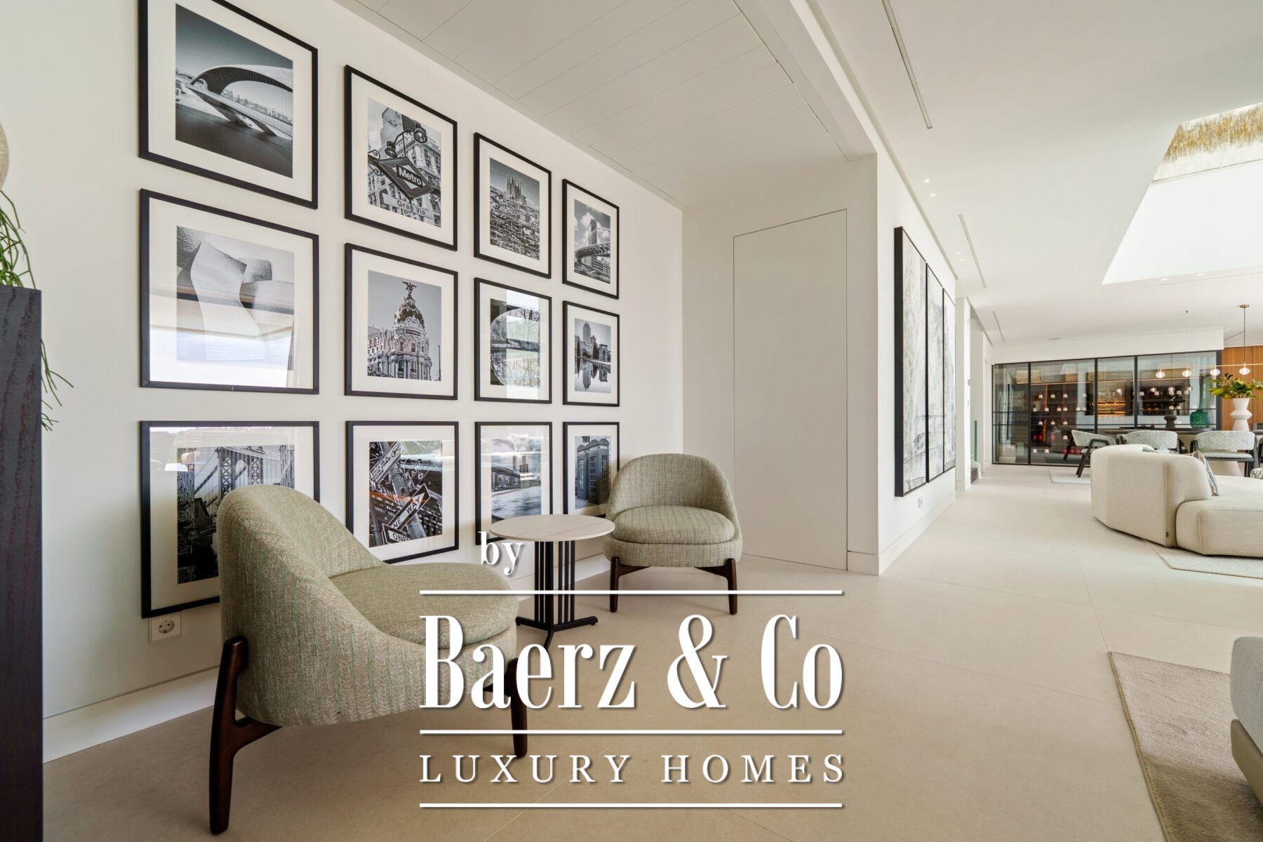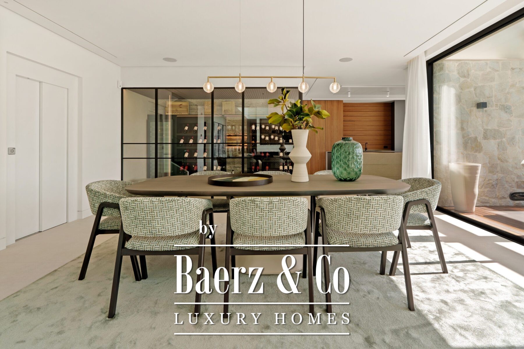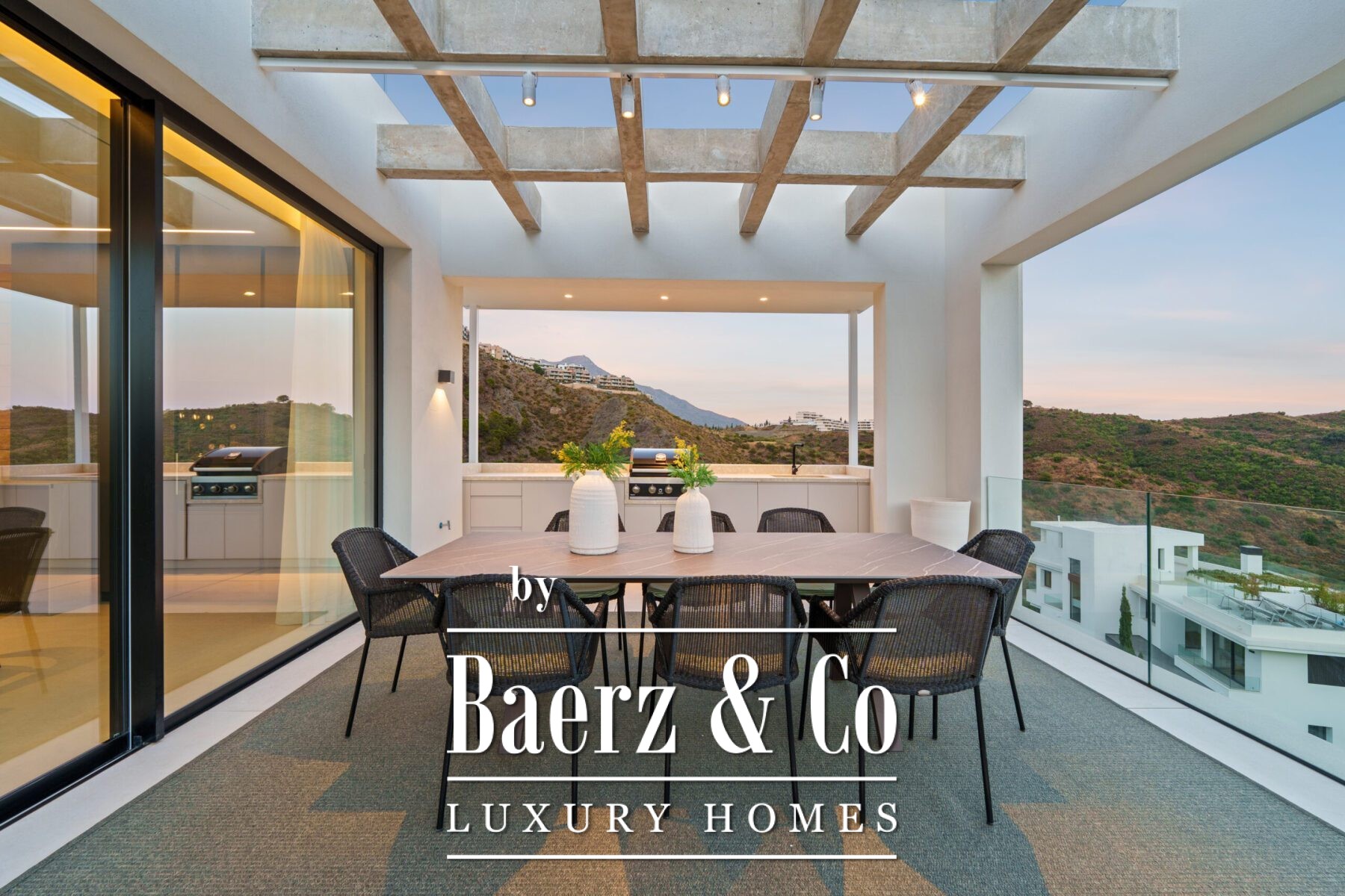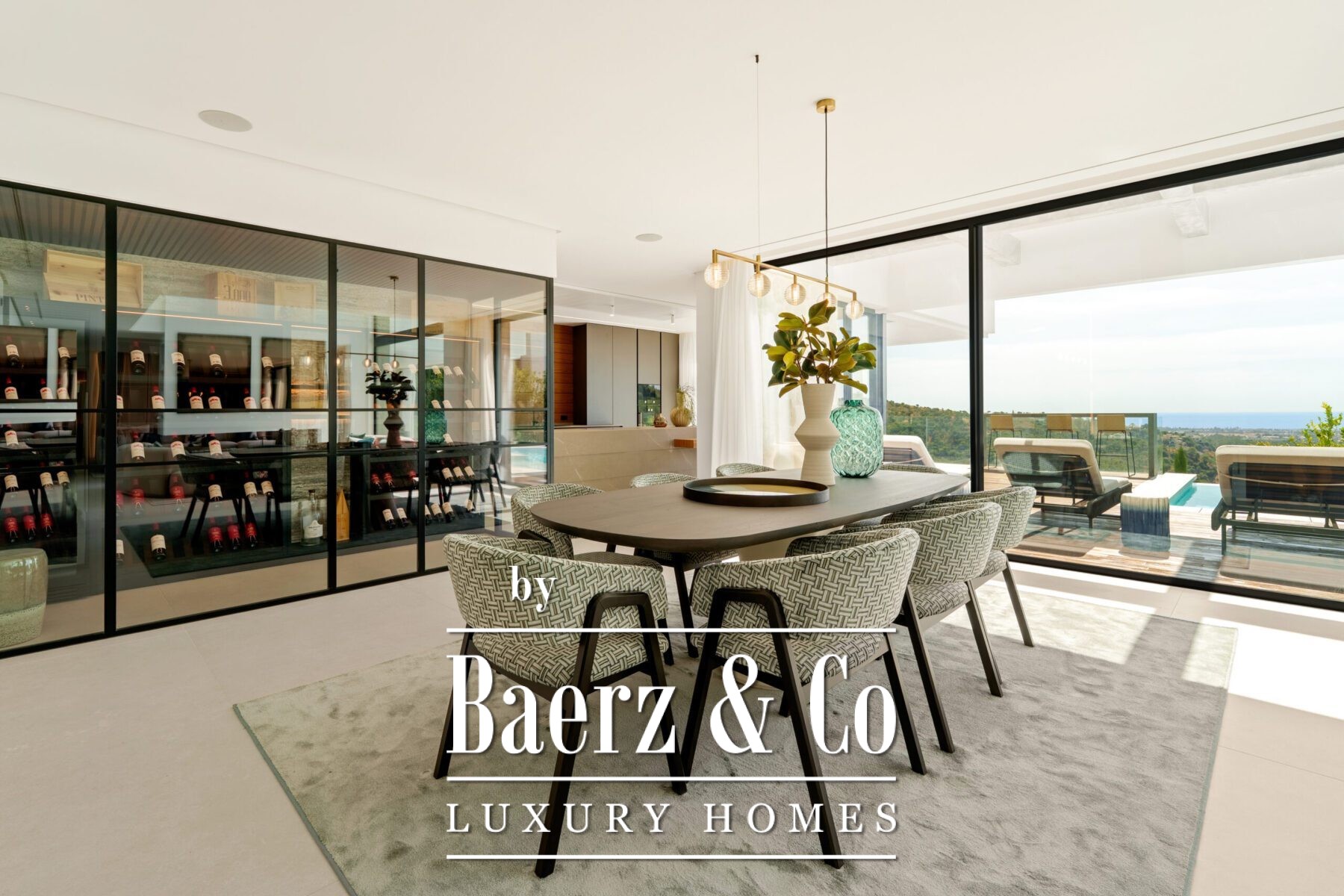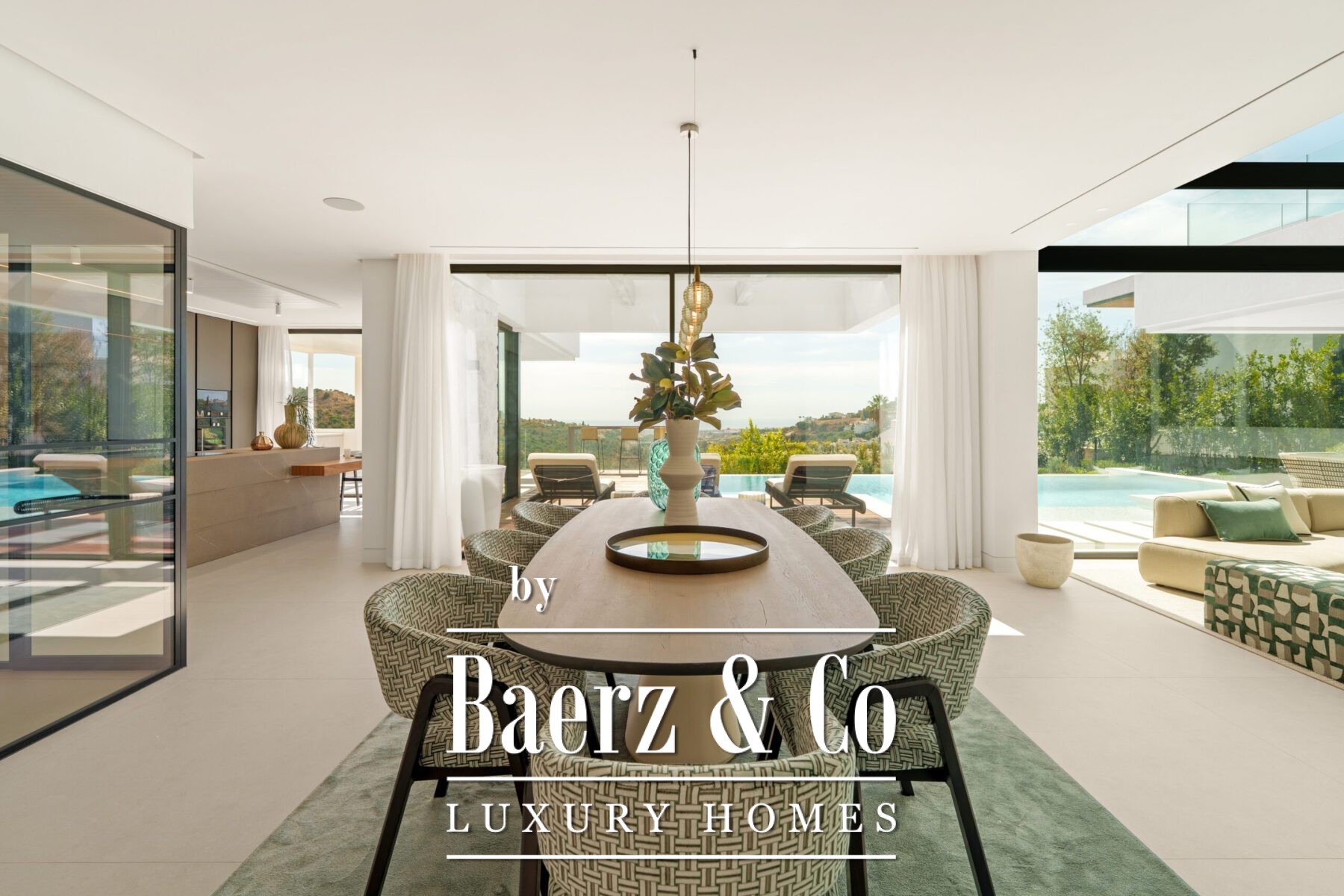 Η σύγχρονη βίλα Marbella αποτελεί τη βασική φράση-κλειδί για αυτήν την κατοικία έξι υπνοδωματίων που βρίσκεται στον περιφραγμένο οικισμό La Quinta, στη Marbella. Με εμβαδόν 636m² σε οικόπεδο 1.579m², η βίλα προσφέρει αρχιτεκτονική ακρίβεια προσαρμοσμένη στο τοπίο, προσφέροντας πανοραμική θέα στη Μεσόγειο και τα βουνά από ιδιωτική, υπερυψωμένη θέση. Οι κύριοι χώροι διαβίωσης διαθέτουν ανοιχτή διαρρύθμιση, όπου τα όρια μεταξύ εσωτερικών και εξωτερικών χώρων εξαφανίζονται μέσω υαλοπετασμάτων από το δάπεδο έως την οροφή. Το φως αποτελεί διαρκή παρουσία, πλημμυρίζοντας τους συνδεόμενους χώρους καθιστικού, τραπεζαρίας και κουζίνας καθώς οδηγούν σε εκτεταμένες ταράτσες.