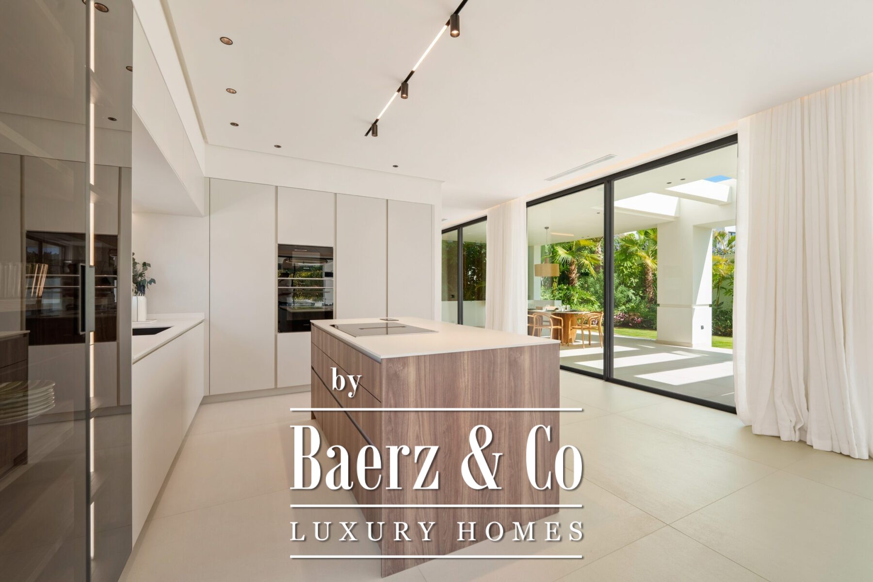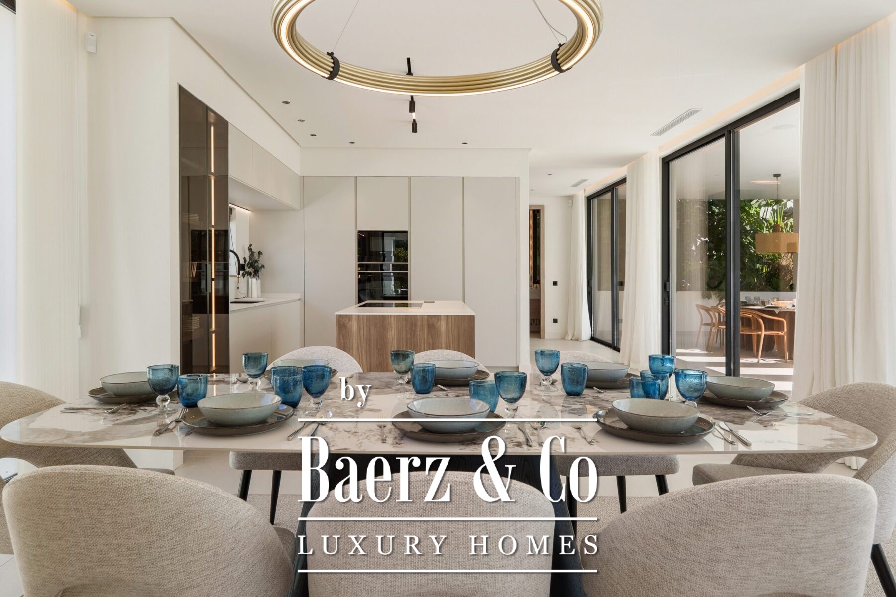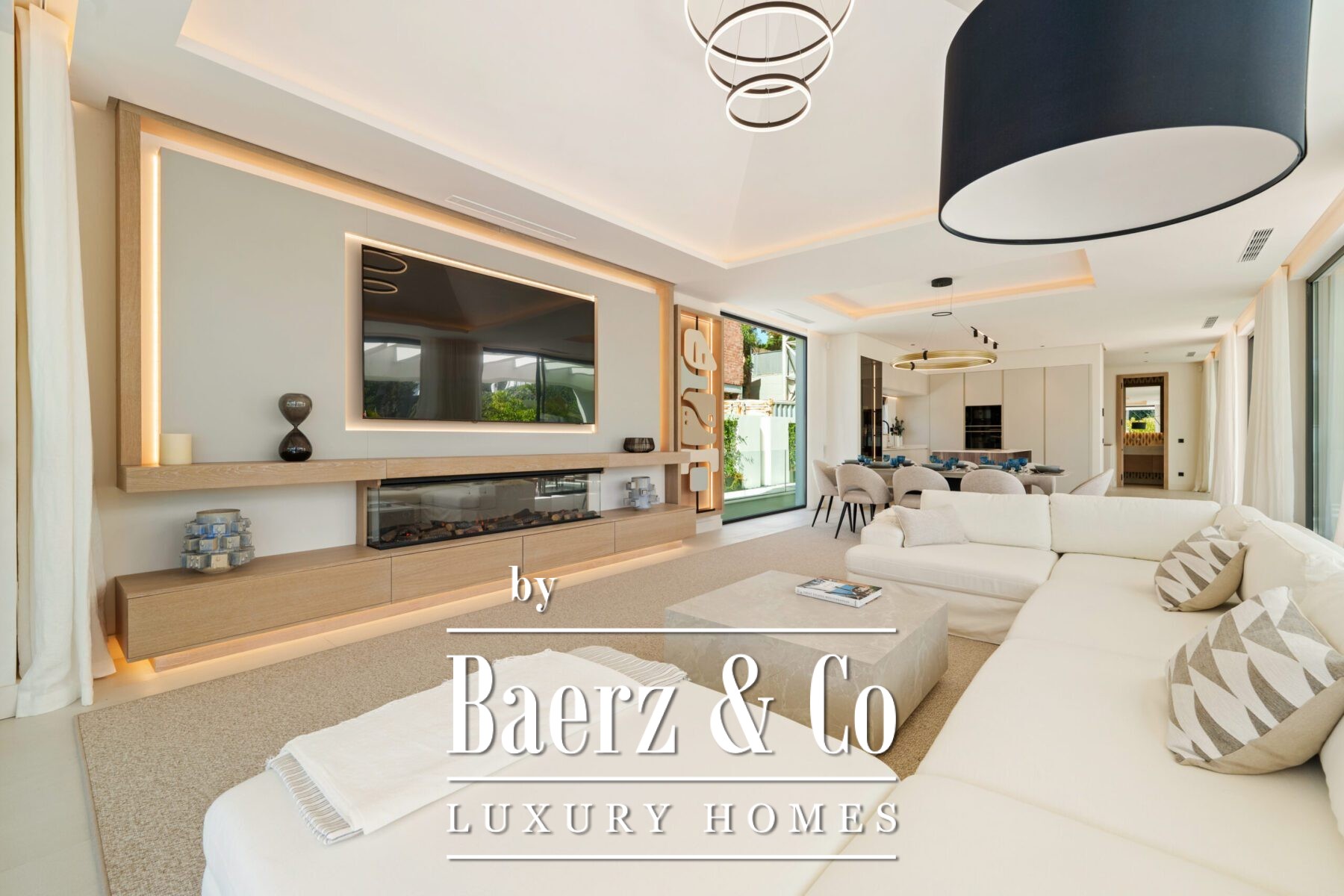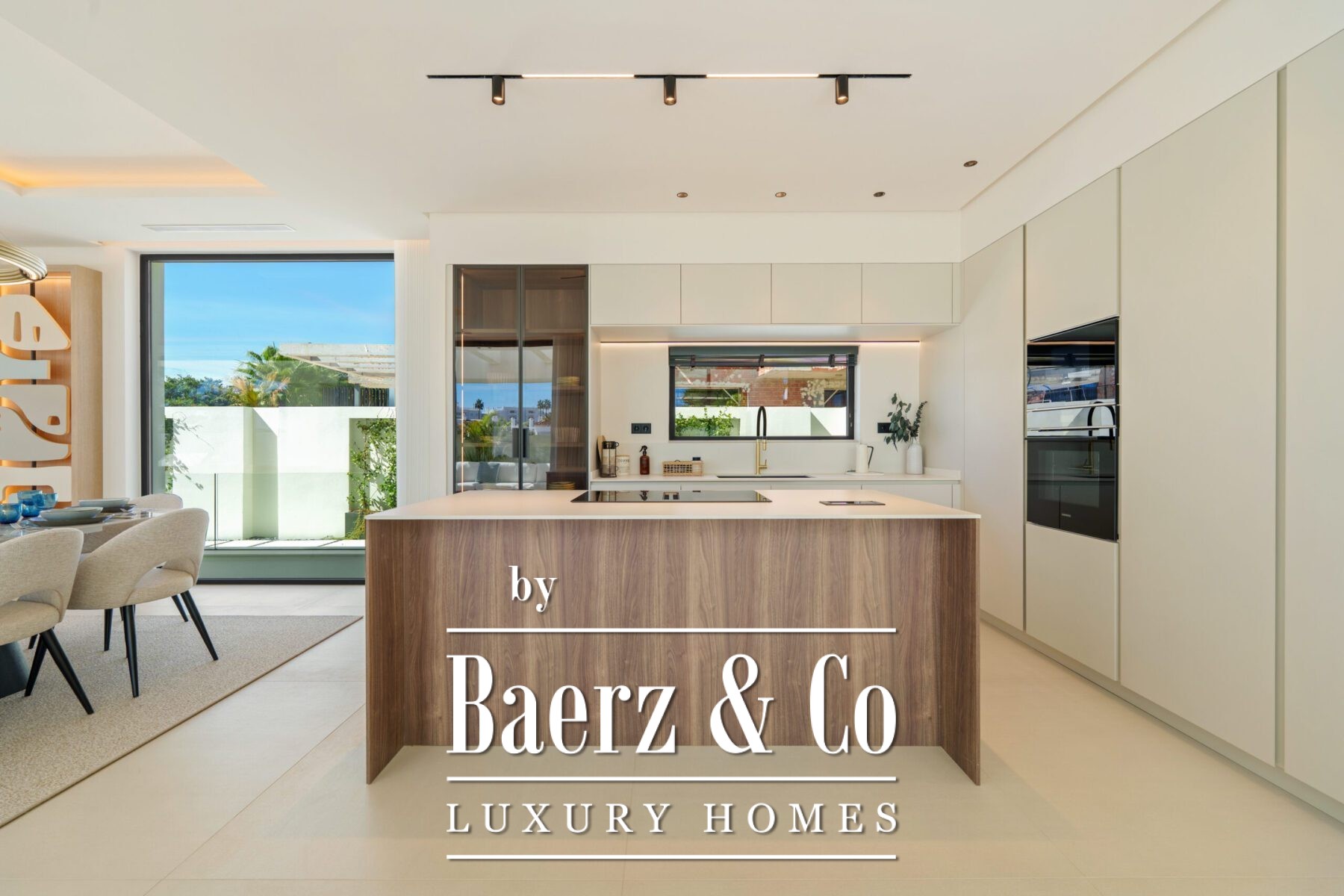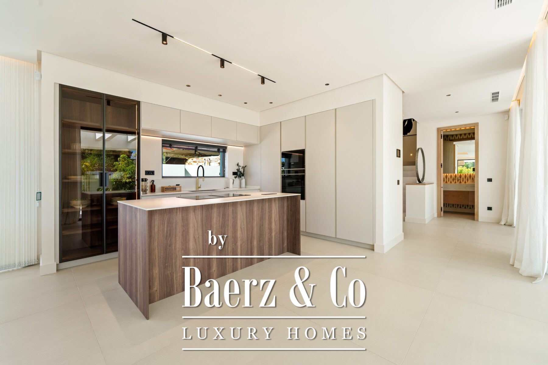 Η ατμόσφαιρα στο εσωτερικό είναι φωτεινή και ισορροπημένη, διαμορφωμένη από απαλές ουδέτερες αποχρώσεις, εντοιχισμένο φωτισμό και μεγάλες τζαμαρίες που καλωσορίζουν το ανδαλουσιανό φως. Ο ανοιχτός χώρος καθιστικού και τραπεζαρίας, πλαισιωμένος από custom τοίχο ψυχαγωγίας και σύγχρονα φωτιστικά, «ρέει» απρόσκοπτα σε μοντέρνα κουζίνα με νησίδα από ξύλο, ενσωματωμένες ηλεκτρικές συσκευές και κομψά ντουλάπια. Αυτή η συνεχής αίσθηση χώρου επεκτείνεται σε τραπεζαρία ιδανική για ιδιαίτερες στιγμές.