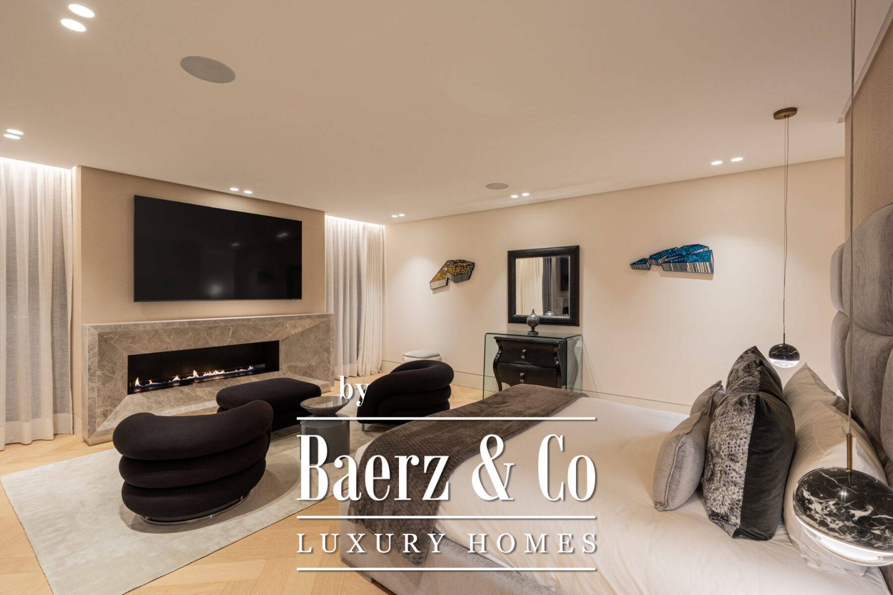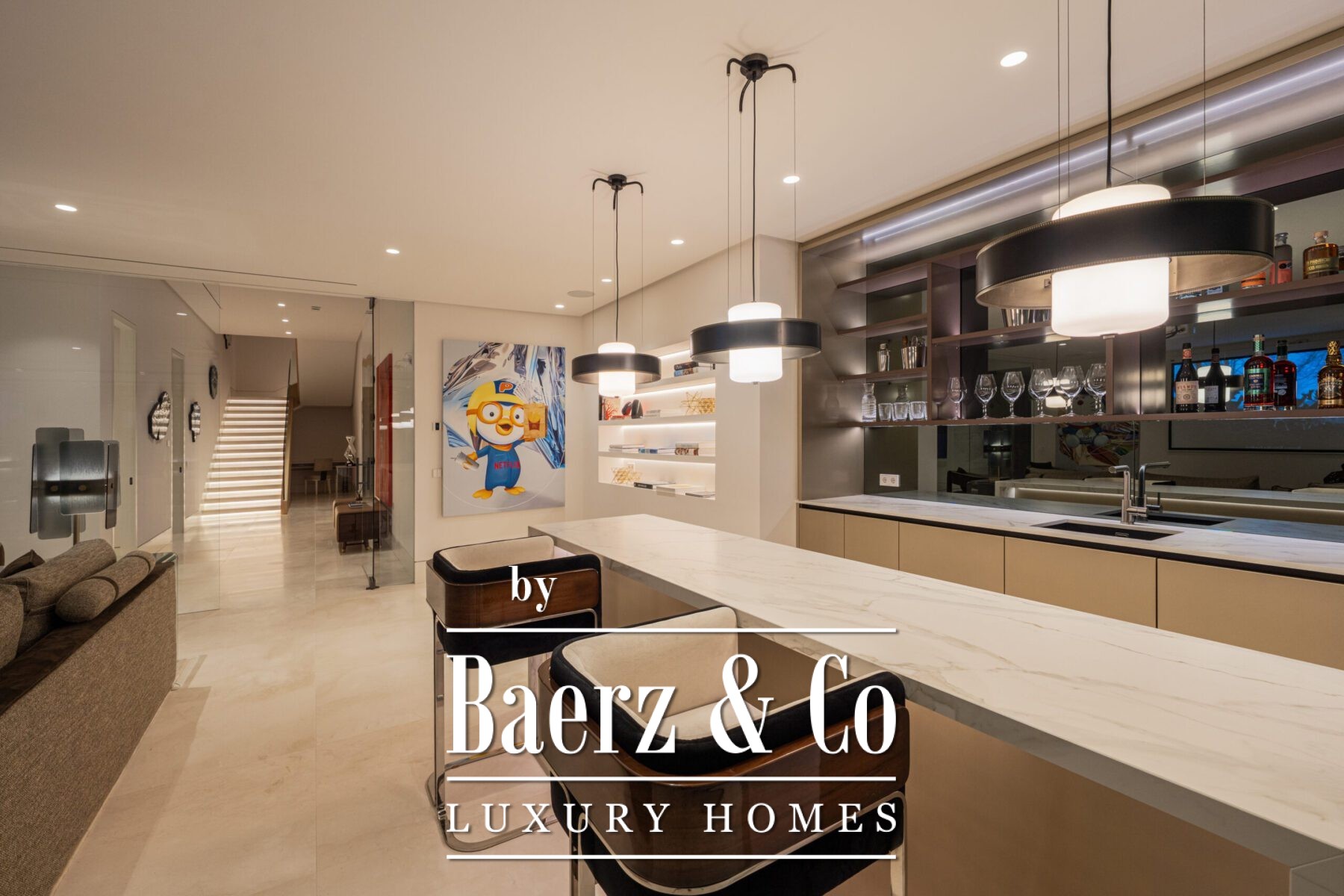 Οι εσωτερικοί χώροι έχουν σχεδιαστεί αποκλειστικά για το συγκεκριμένο ακίνητο, με ήπιες ουδέτερες αποχρώσεις και φυσικά υλικά όπως ξύλο και μάρμαρο να προσδίδουν μια αρμονική αίσθηση πολυτέλειας.