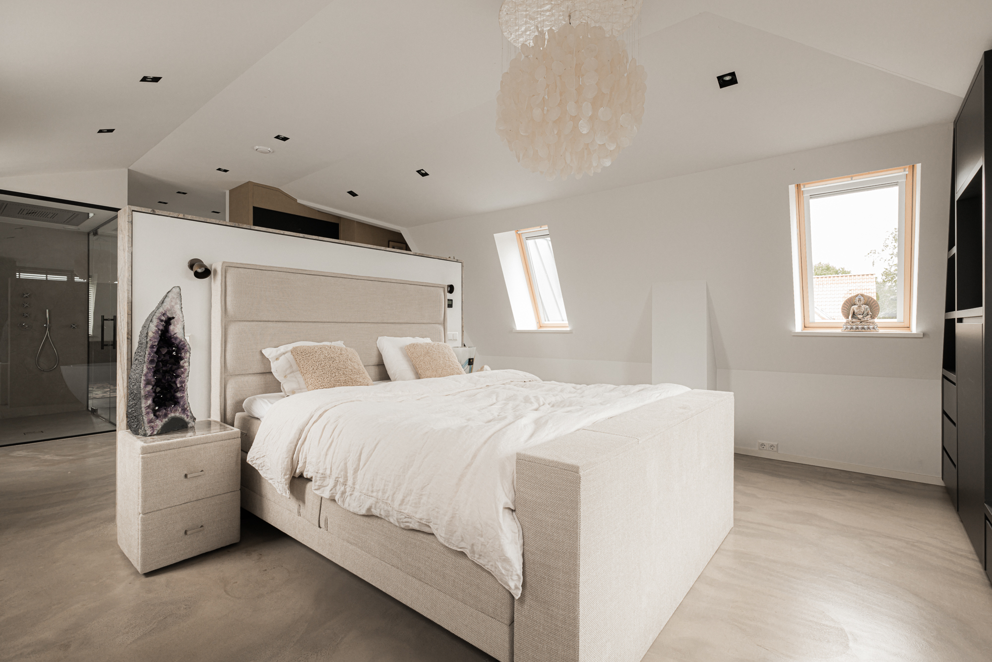 Καθένα από τα υπνοδωμάτια με ιδιωτικό μπάνιο, συμπεριλαμβανομένης της master σουίτας με walk-in closet, έχει σχεδιαστεί με γνώμονα την άνεση και την ιδιωτικότητα. Ο ξενώνας, με το ανοιχτό αίθριο και τη θέα στους υδάτινους όγκους και τα λιβάδια, προσφέρει ευελιξία για ιδιωτικότητα ή οικογενειακές ανάγκες. Παροχές όπως γυμναστήριο, τεχνικοί χώροι, πλυντήριο και ασφαλής στάθμευση για έως δέκα οχήματα αναβαθμίζουν την καθημερινότητα. Ενεργειακή κλάση Α, εξελιγμένη μόνωση και πλήρης ενδοδαπέδια θέρμανση εξασφαλίζουν σταθερό εσωτερικό κλίμα κάθε εποχή.