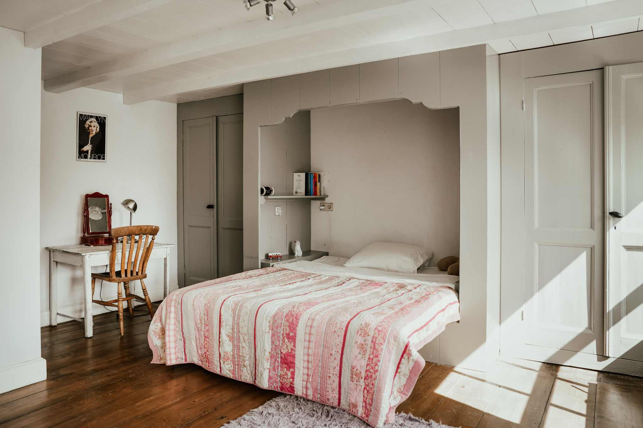 Στον επάνω όροφο, τρία υπνοδωμάτια και δύο μπάνια μοιράζονται τον πρώτο όροφο με ένα φωτεινό γραφείο κάτω από τη στέγη από καλάμια, εξοπλισμένο τόσο για εργασία όσο και για χαλάρωση. Δύο επιπλέον υπνοδωμάτια, τέταρτο μπάνιο και μια σοφίτα-παιδότοπος συμπληρώνουν τους άνω ορόφους, με σύγχρονους inverters για ψύξη ή θέρμανση και προηγμένα συστήματα που εξασφαλίζουν ενεργειακή πιστοποίηση A+.