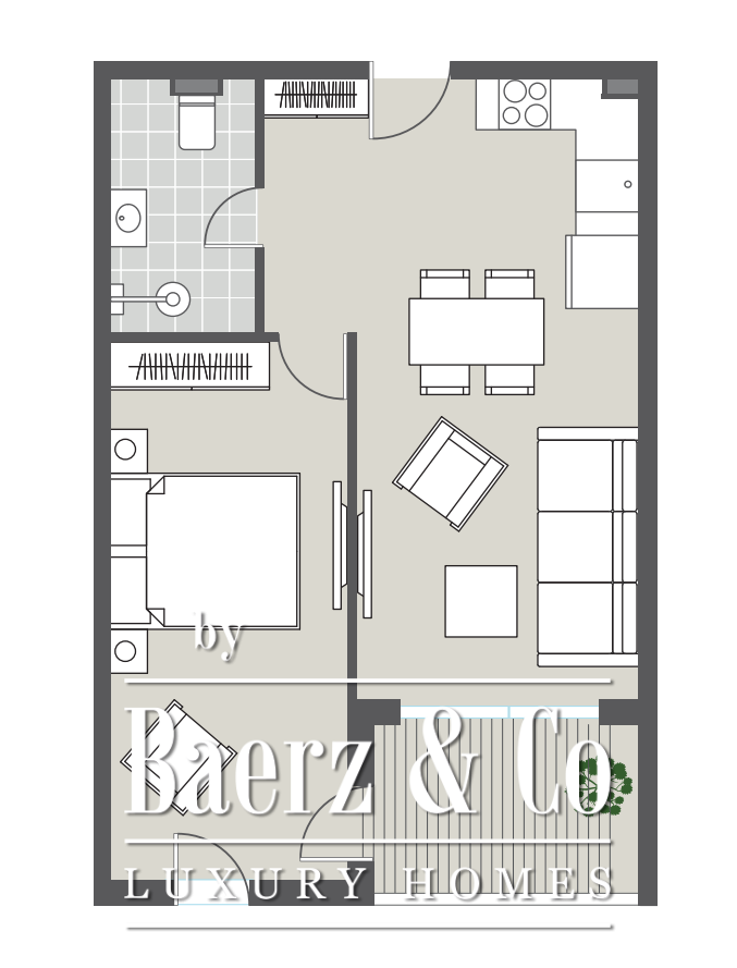 Στον πρώτο όροφο, το διαμέρισμα διαθέτει φωτεινό καθιστικό με κουζίνα και τραπεζαρία, ένα υπνοδωμάτιο, μπάνιο και βεράντα. Η προσέγγιση "με το κλειδί στο χέρι" προσφέρει ειδικά διαμορφωμένους εσωτερικούς χώρους από την ANSER & Partners, επιλεγμένα έπιπλα από την Old Hara καθώς και ενσωματωμένες ηλεκτρικές συσκευές και συστήματα smart home. Κάθε λεπτομέρεια, από τις εγκαταστάσεις Villeroy & Boch έως την κλιματιστική μονάδα Samsung WindFree, έχει σχεδιαστεί για διακριτική άνεση και τεχνολογική ευκολία.