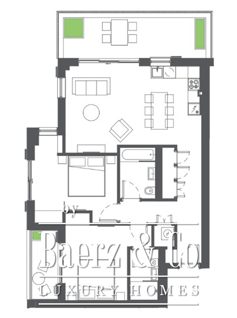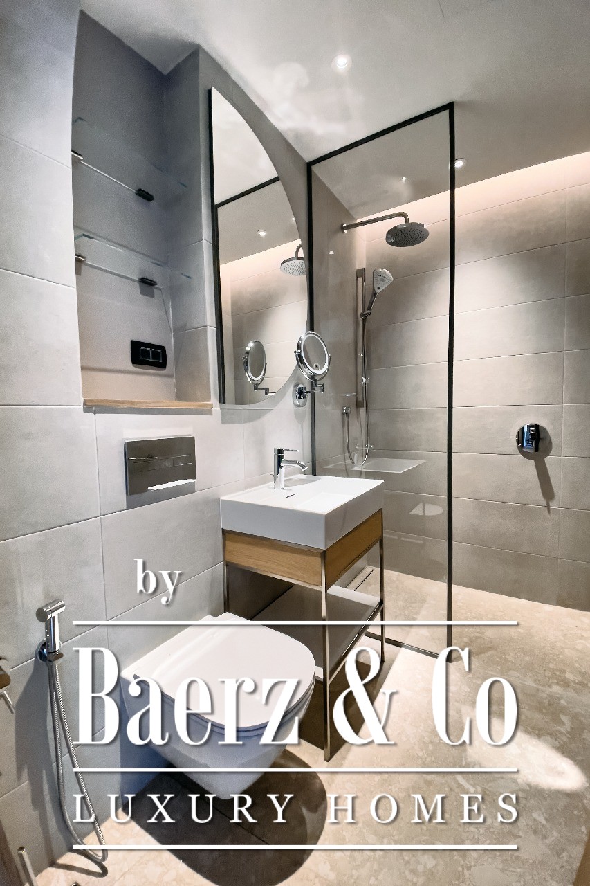 Οι εσωτερικοί χώροι διαθέτουν εξοπλισμένη κουζίνα και μπάνια, έτοιμα δάπεδα, πλακίδια και κλιματισμό. Το διαμέρισμα προσφέρεται χωρίς έπιπλα, προσφέροντας μια ευέλικτη βάση προσωπικής διαμόρφωσης. Η δυναμική τόσο για μακροχρόνια όσο και για βραχυχρόνια μίσθωση ενισχύεται από τη θέση και τη σαφήνεια της αρχιτεκτονικής του.