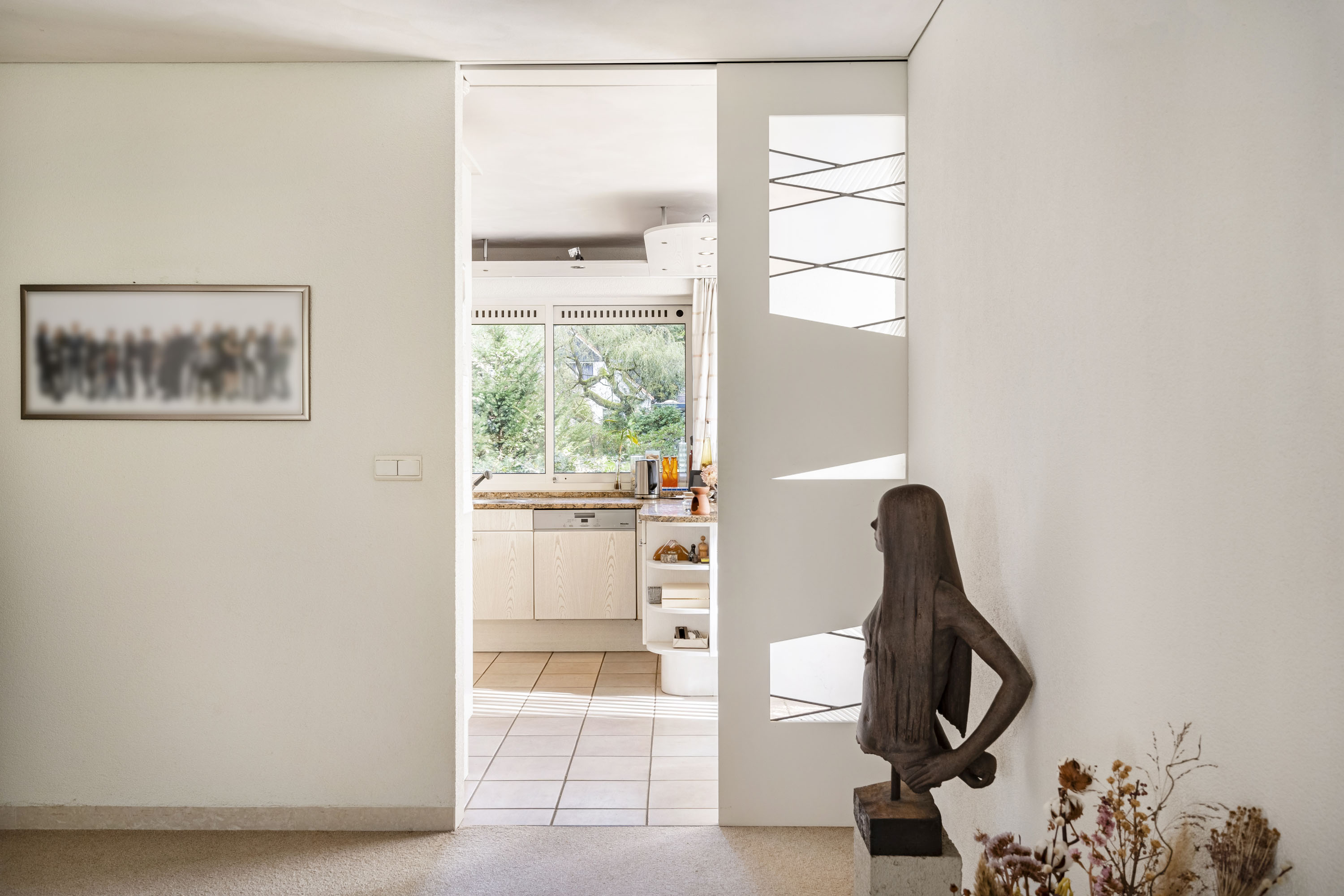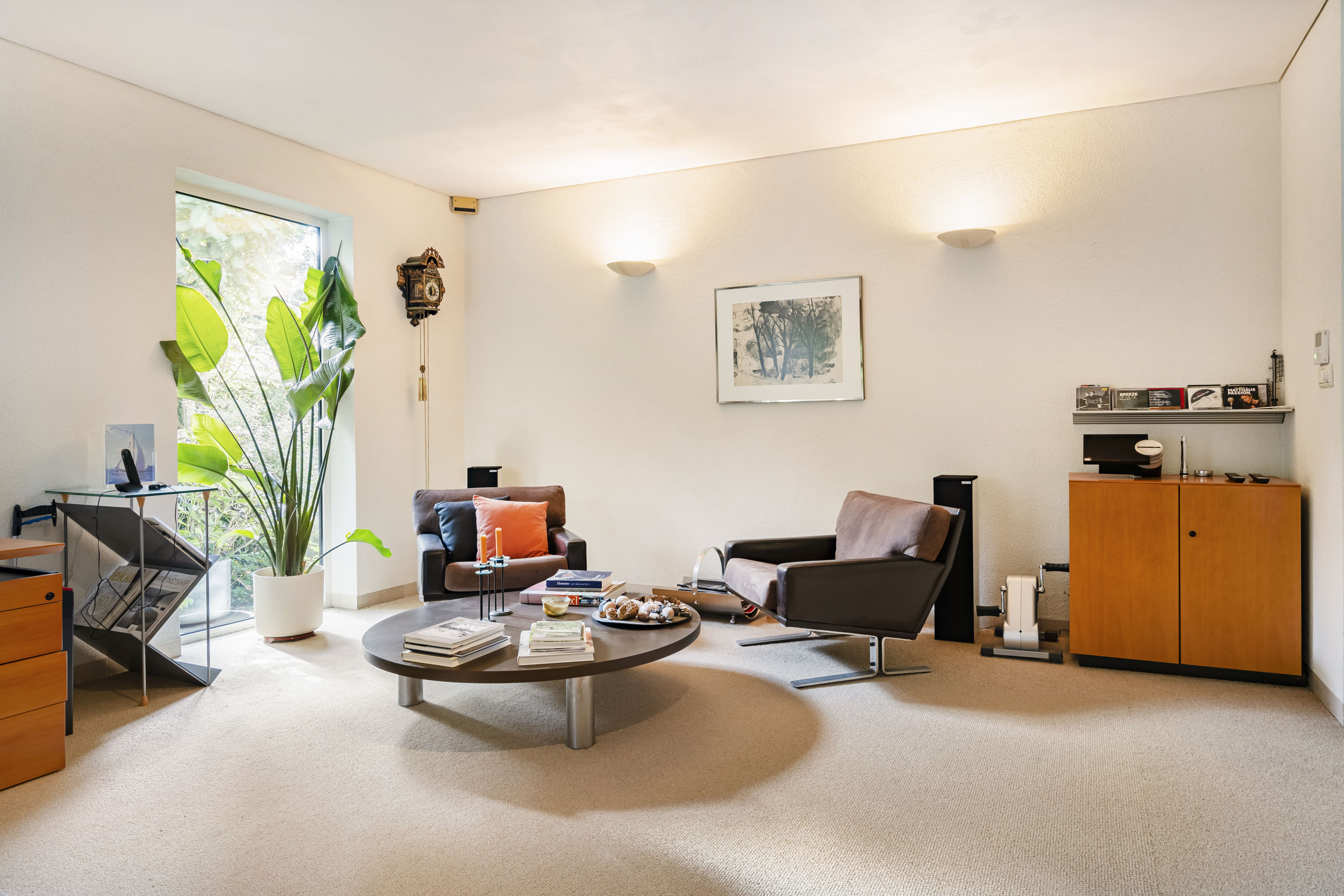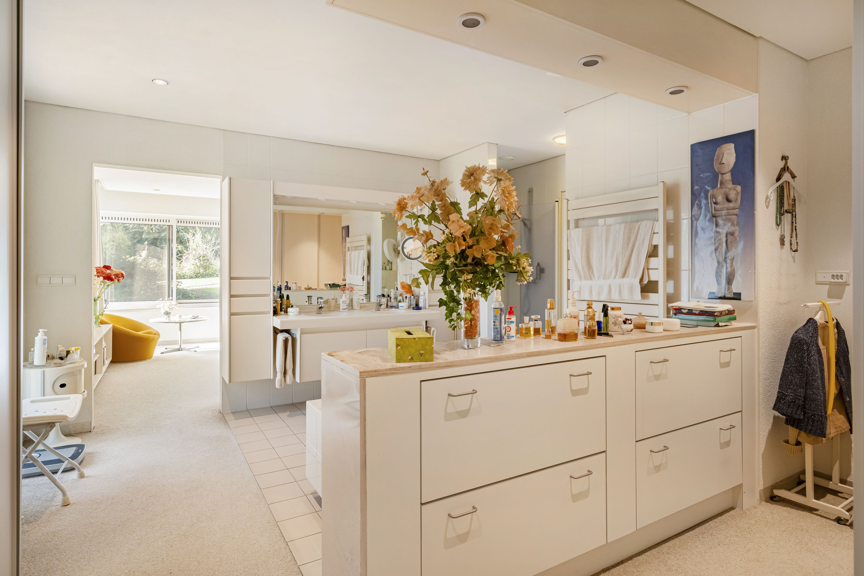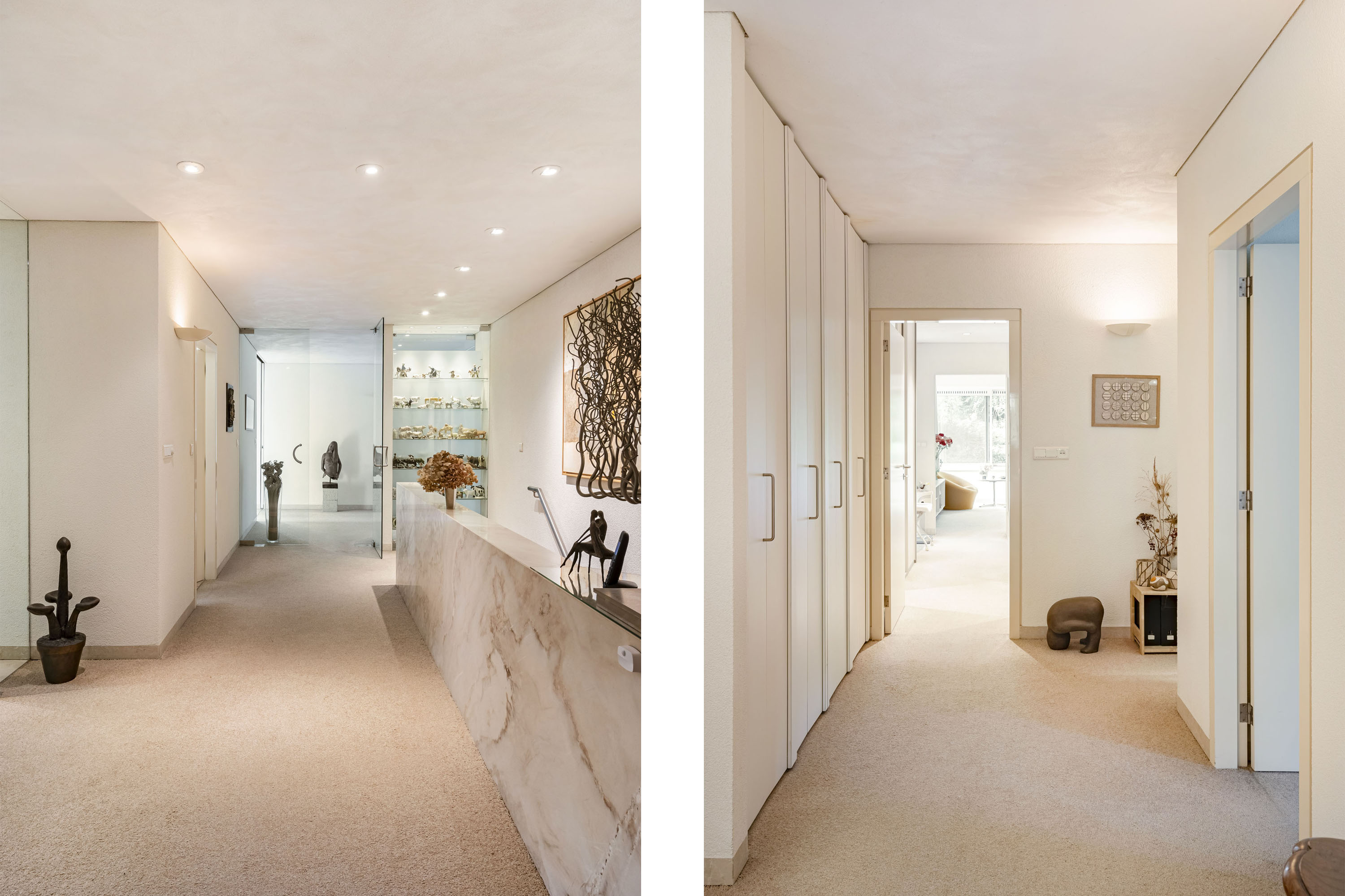 Η έξυπνη διαρρύθμιση περιλαμβάνει μεγάλο σαλόνι, τραπεζαρία με θέα στον κήπο, γραφείο, καθώς και κουζίνα ανοιχτής διάταξης που επικοινωνεί με βοηθητικό χώρο και διακριτικό αναβατόριο. Κομψές συρόμενες πόρτες εξισορροπούν τη διαφάνεια με την ιδιωτικότητα. Η εσωτερική πισίνα, με jet stream και συρόμενες πόρτες που οδηγούν στον κήπο, αποτελεί την επιτομή ευζωίας στο σπίτι. Η κύρια σουίτα διαθέτει κλιματισμό και άμεση πρόσβαση στον κήπο, ενώ τα δύο μπάνια προσφέρουν επιλογή μπανιέρας και ντουζ.