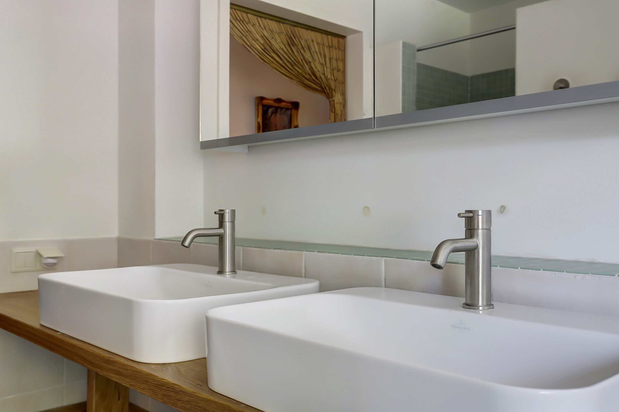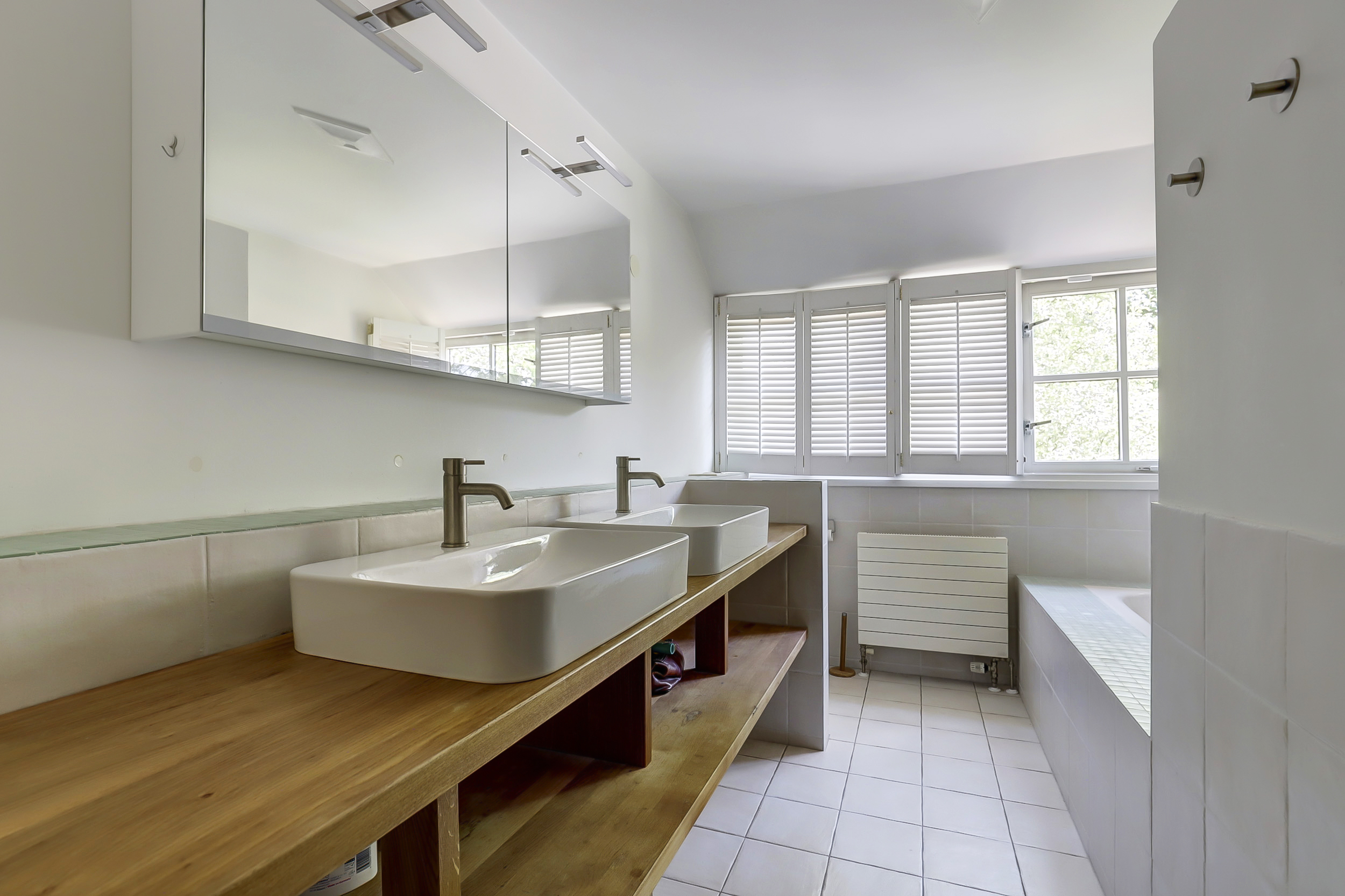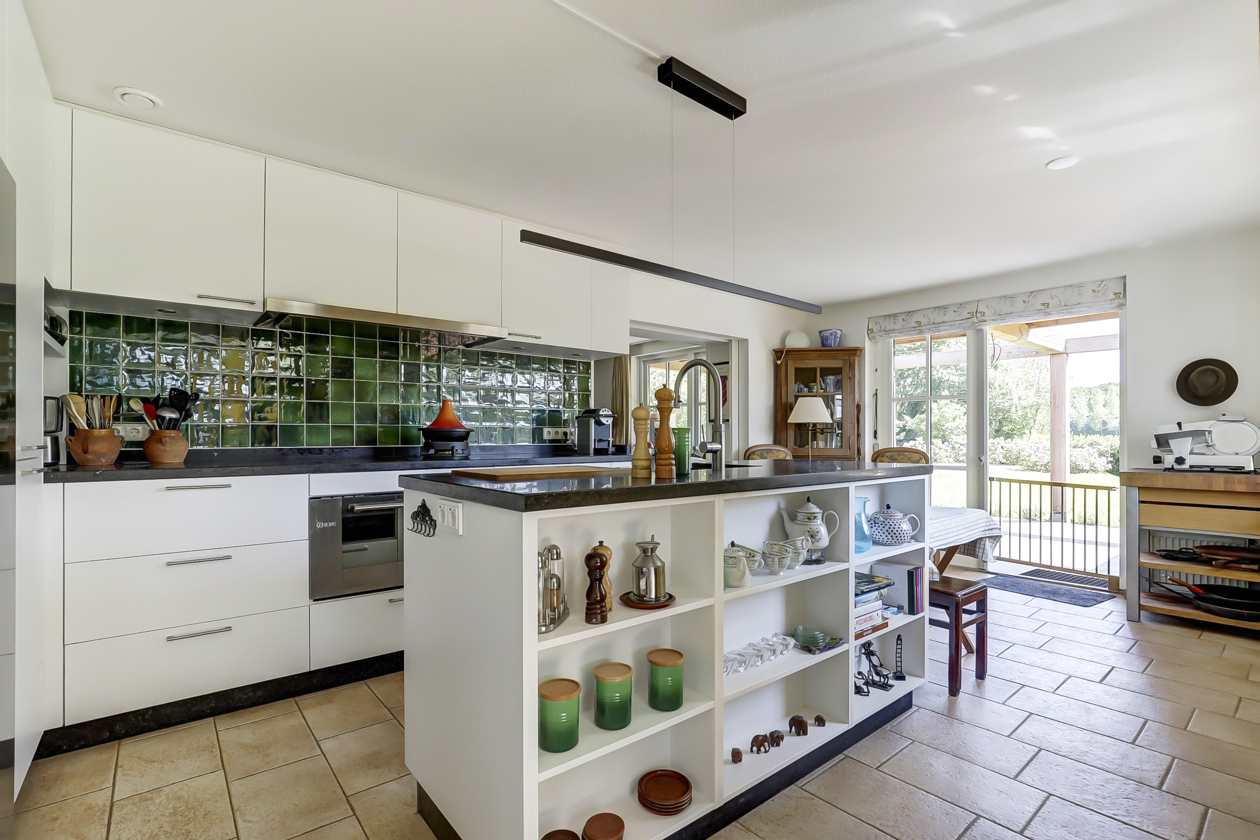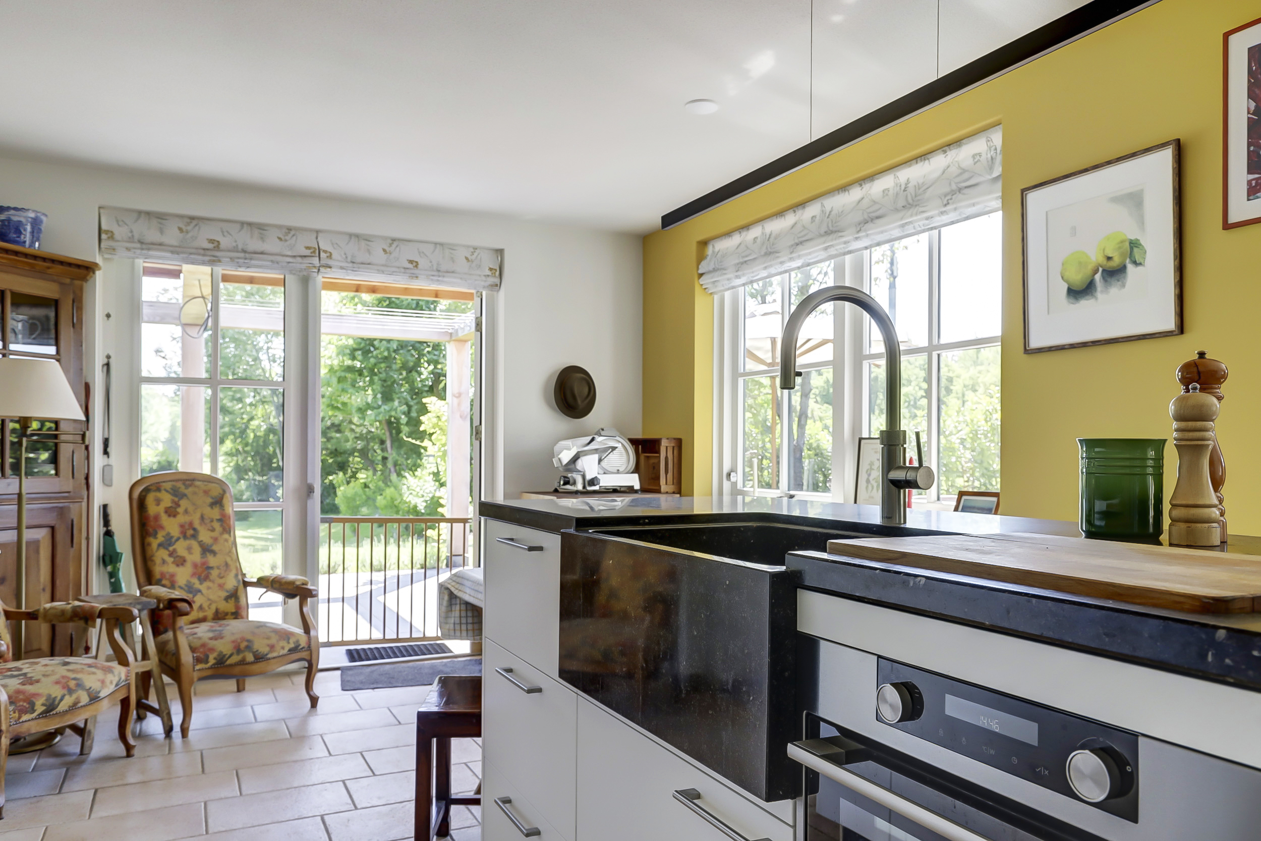 Από το σαλόνι με το ημικυκλικό παράθυρο και το ανοιχτό τζάκι, το φως περνά μέσα από φαρδιές γαλλικές πόρτες σε μια ηλιόλουστη βεράντα και στον κήπο. Η κουζίνα του 2023, με ματ λευκές επιφάνειες και πάγκο από φυσική πέτρα, διαθέτει κλιματιζόμενο ντουλάπι κρασιών, βρύση νερού 4-σε-1 με δυνατότητα βρασμού, επαγωγική εστία και φούρνο κλασικής κυκλοφορίας 90 εκ,, σχεδιασμένα για λειτουργικότητα και συγκρατημένη κομψότητα. Η ενδοδαπέδια θέρμανση του ισογείου και η προσεγμένη κουζίνα με παροχές του ξενώνα δίνουν ευελιξία είτε για φιλοξενία οικογένειας είτε για λειτουργία ως bed and breakfast.