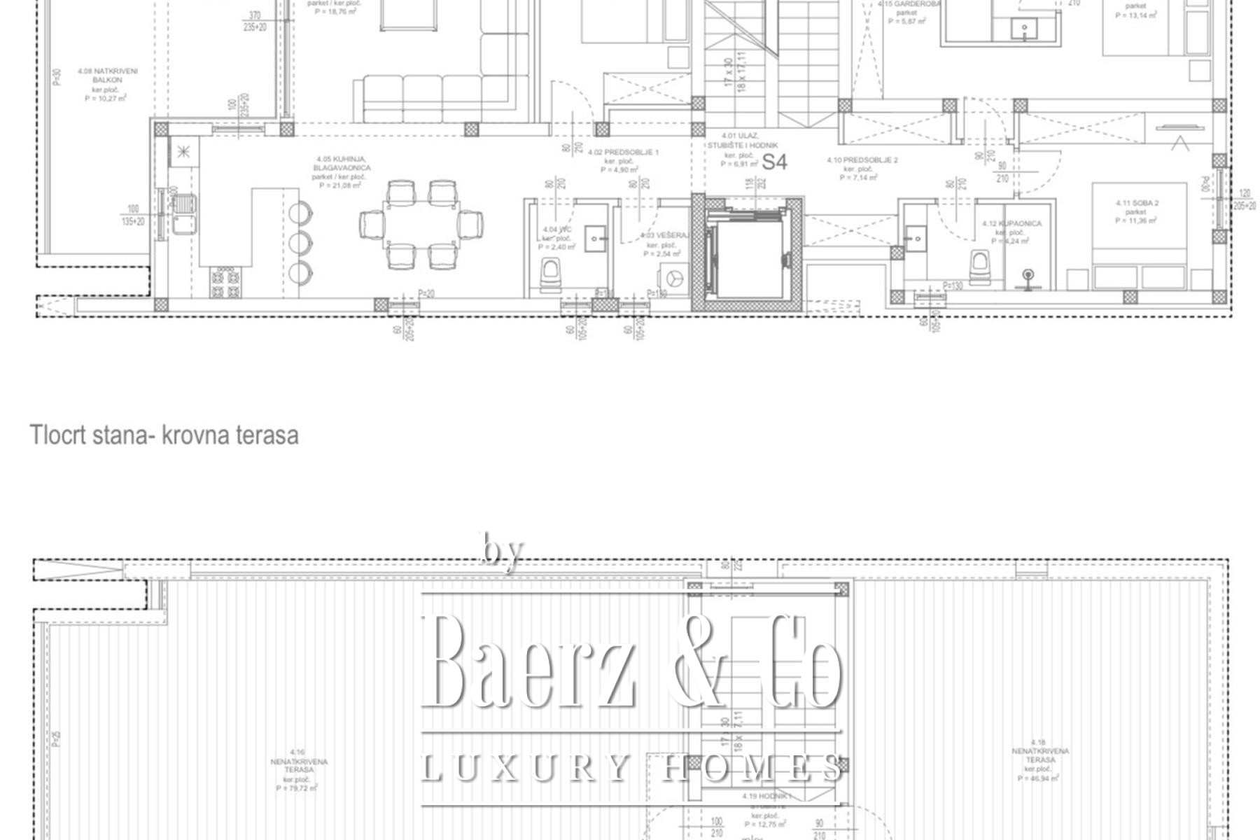 Το αποκορύφωμα αποτελεί η ταράτσα 126 τ.μ. με πανοραμική θέα στην ακτή, ειδικά διαμορφωμένη για απόλαυση και φιλοξενία καθ’ όλη τη διάρκεια του έτους. Τα υλικά και οι επιφάνειες προσεγμένα: αλουμινένια κουφώματα με τριπλά υαλοστάσια IZO, ιταλικές κεραμικές πλακίδια, και άριστης ποιότητας είδη υγιεινής από τις LAUFEN, HANSGROHE και GEBERIT. Η άνεση διασφαλίζεται με κλιματισμό Mitsubishi, ηλεκτρική ενδοδαπέδια θέρμανση και ενεργειακή κλάση Α+. Ανελκυστήρας Schindler οδηγεί απευθείας στο ρετιρέ, ενώ η ασφάλεια και η ηχομόνωση της εισόδου προσδίδουν επιπλέον κύρος. Το Penthouse Zadar - Okolica αποτελεί σπάνια ευκαιρία για όσους εκτιμούν τον σχεδιασμό, την ιδιωτικότητα και την εγγύτητα στο Zadar σε μία διακριτική αδριατική τοποθεσία.