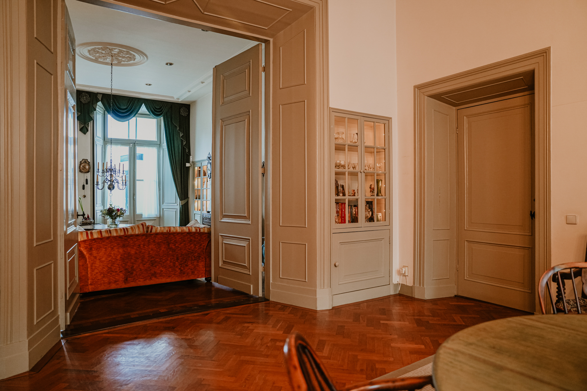 The imposing entrance hall is as large as an average living room. The marble floor continues into an adjoining hallway paved with natural stone. To the left is the expansive living room and en suite, measuring an impressive 70 m². The living room features high stucco ceilings, tall windows with stained glass transoms, two natural stone fireplaces, window seats, interior shutters, fitted cupboards, and herringbone parquet flooring. At the rear, two pairs of French doors open onto the garden.
