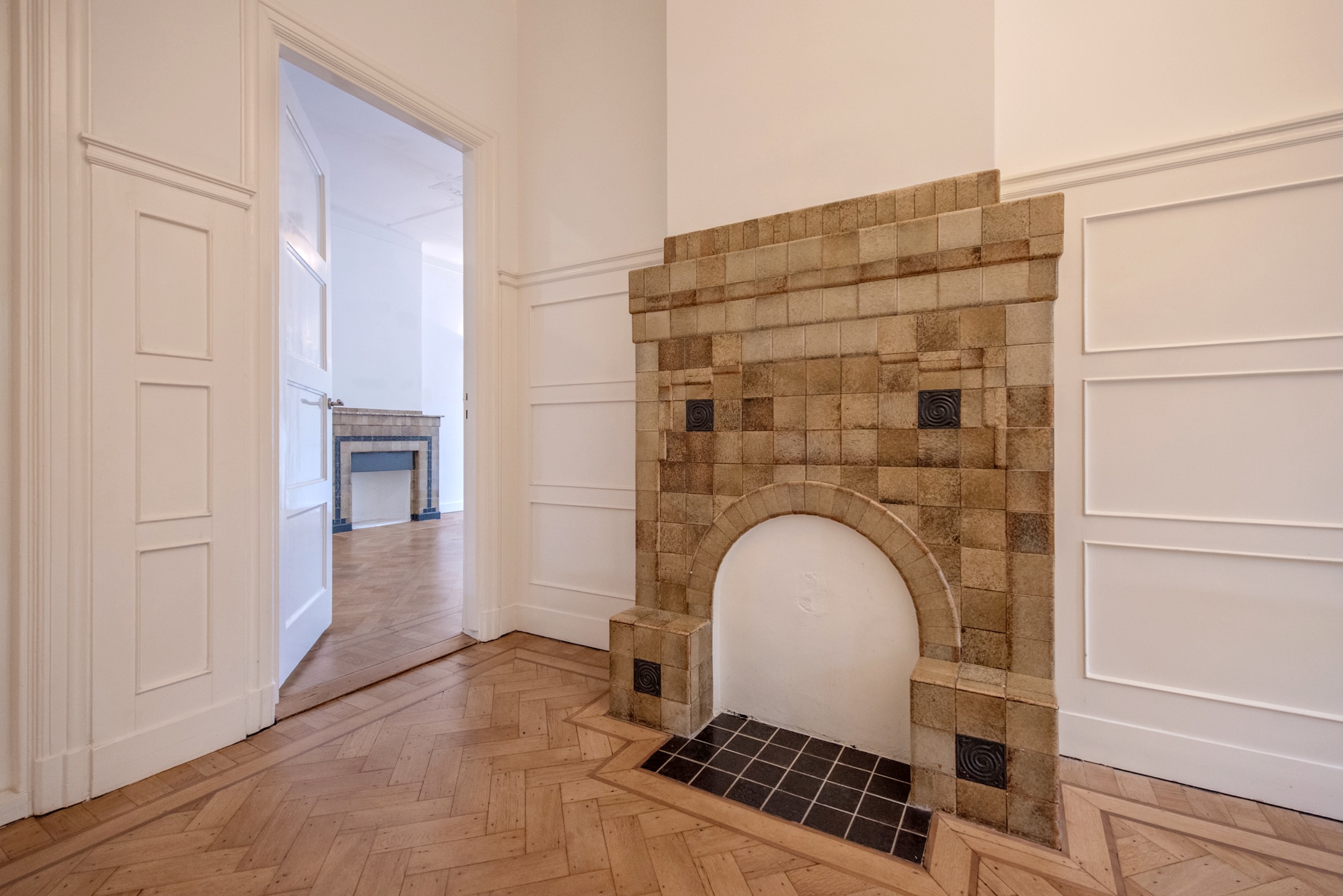 Next to the private parking space is the main entrance. Behind the front door, a spacious vestibule with beautiful original tiling opens into a gracious reception hall with herringbone parquet flooring and elegant double border inlay.
