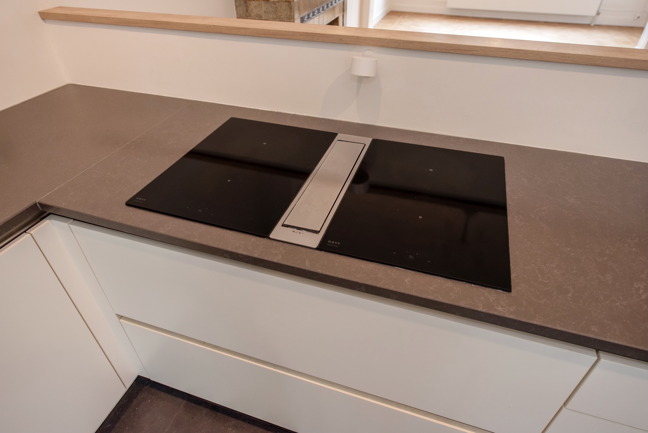 Aan de achterzijde van de woonkamer is een modern open keukeneiland in u-opstelling voorzien van een zwarte betegelde vloer met een witte kastenwand, en een donker aanrechtblad. De keuken heeft een brede inductie-kookplaat met geïntegreerde afzuiging, een hoge inbouw koelkast met een afgescheiden vrieskast, en een oven, magnetron en vaatwasser. Er is een deur naar een fijne achtertuin op het zuiden met voldoende privacy. De achtertuin is eventueel door te trekken naar de zij-tuin. Vanuit de tuin is een trapje naar de extra ruime kelders.