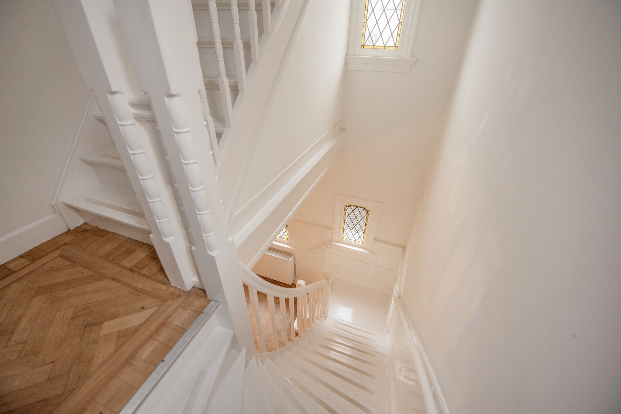 From the reception hall, there is access to a modern toilet and a separate door to the cellar. A beautifully detailed staircase with stained-glass windows leads to the upper floors.