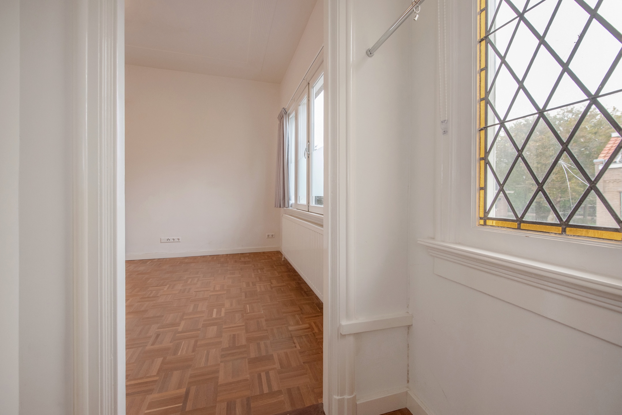 Naast de auto-opstelplaats bevindt zich de entree van de woning. Achter de voordeur bevindt zich een ruime vestibule met fraaie originele betegeling en een deur met glas in roedeverdeling naar een mooie representatieve ontvangsthal, voorzien van een visgraatparketvloer met dubbele bies.