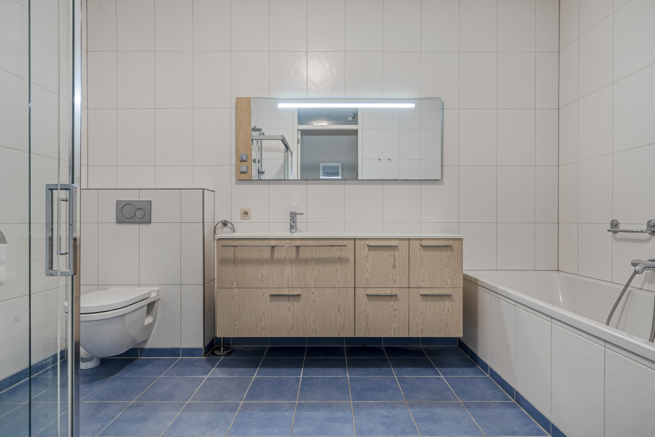 Next to the technical room is the spacious bathroom, fitted with a bathtub, walk-in shower, washbasin with vanity unit and a second toilet. The tiled floor is finished with an anti-slip coating, providing extra safety.