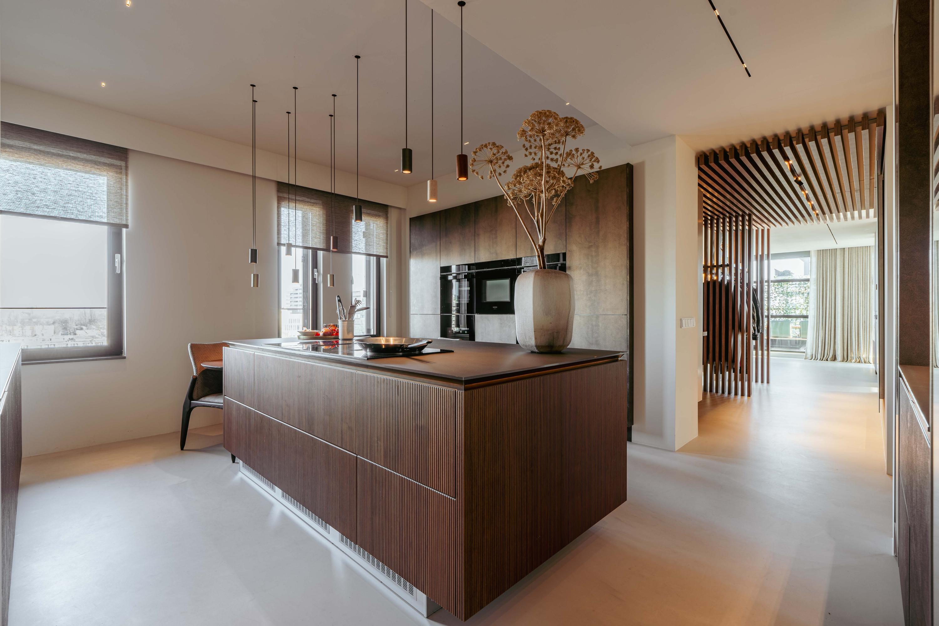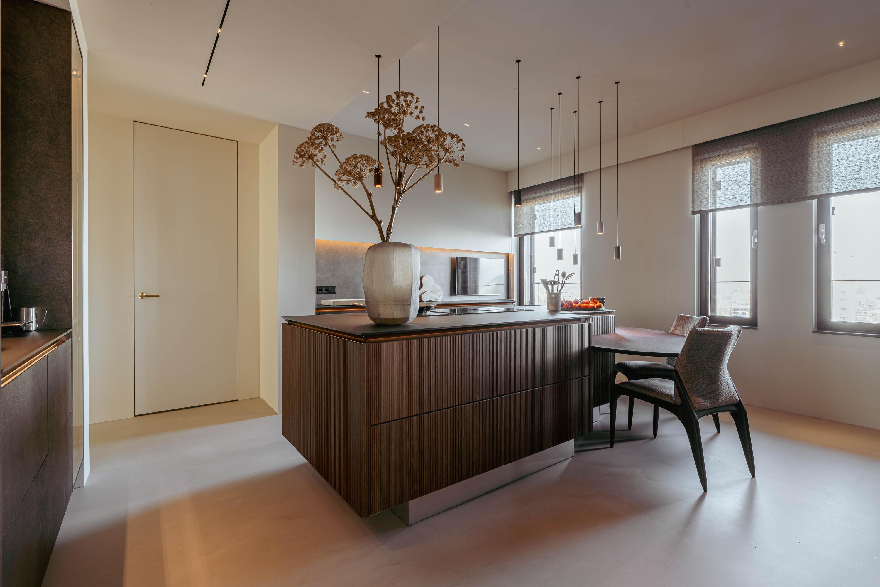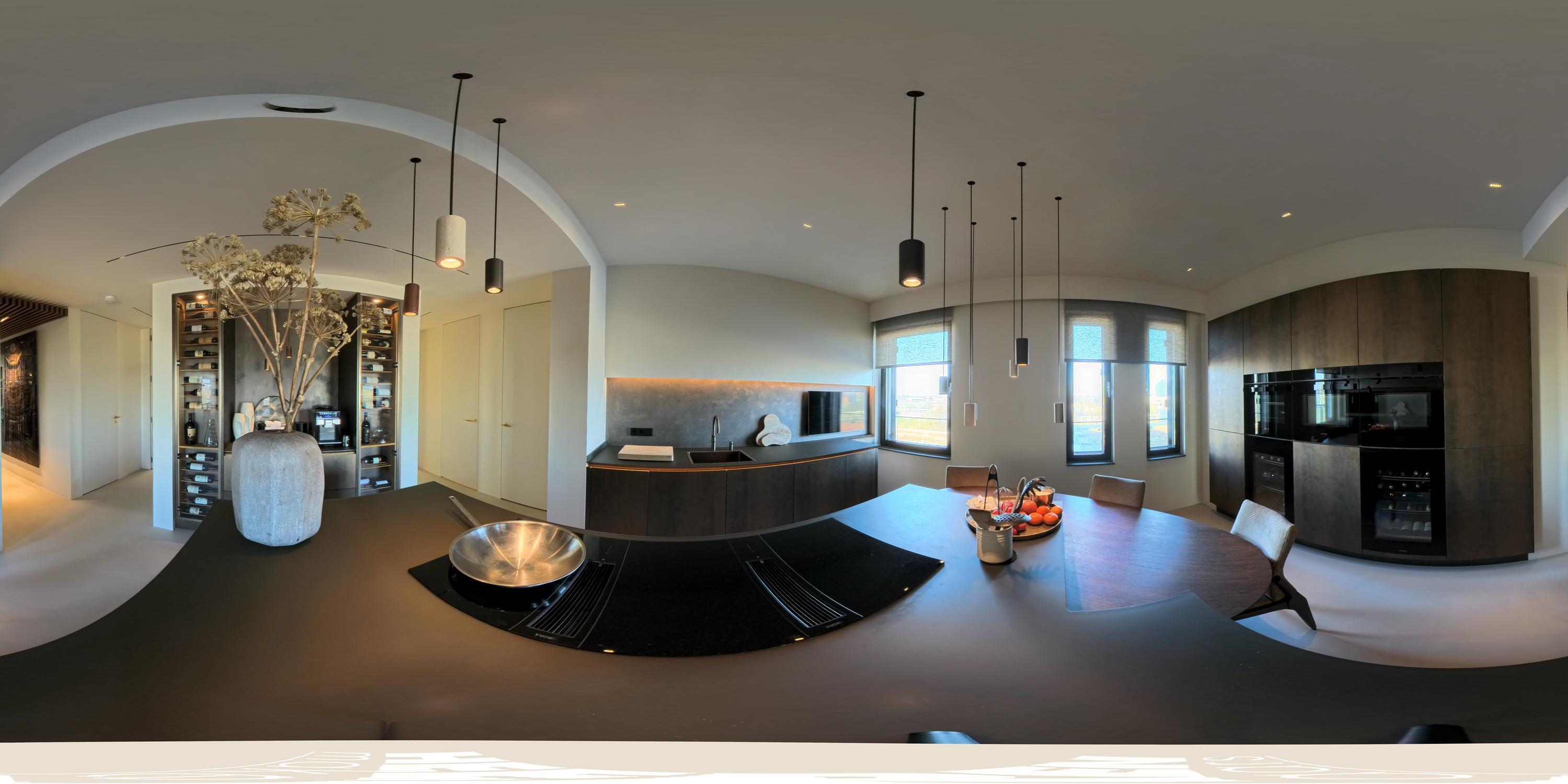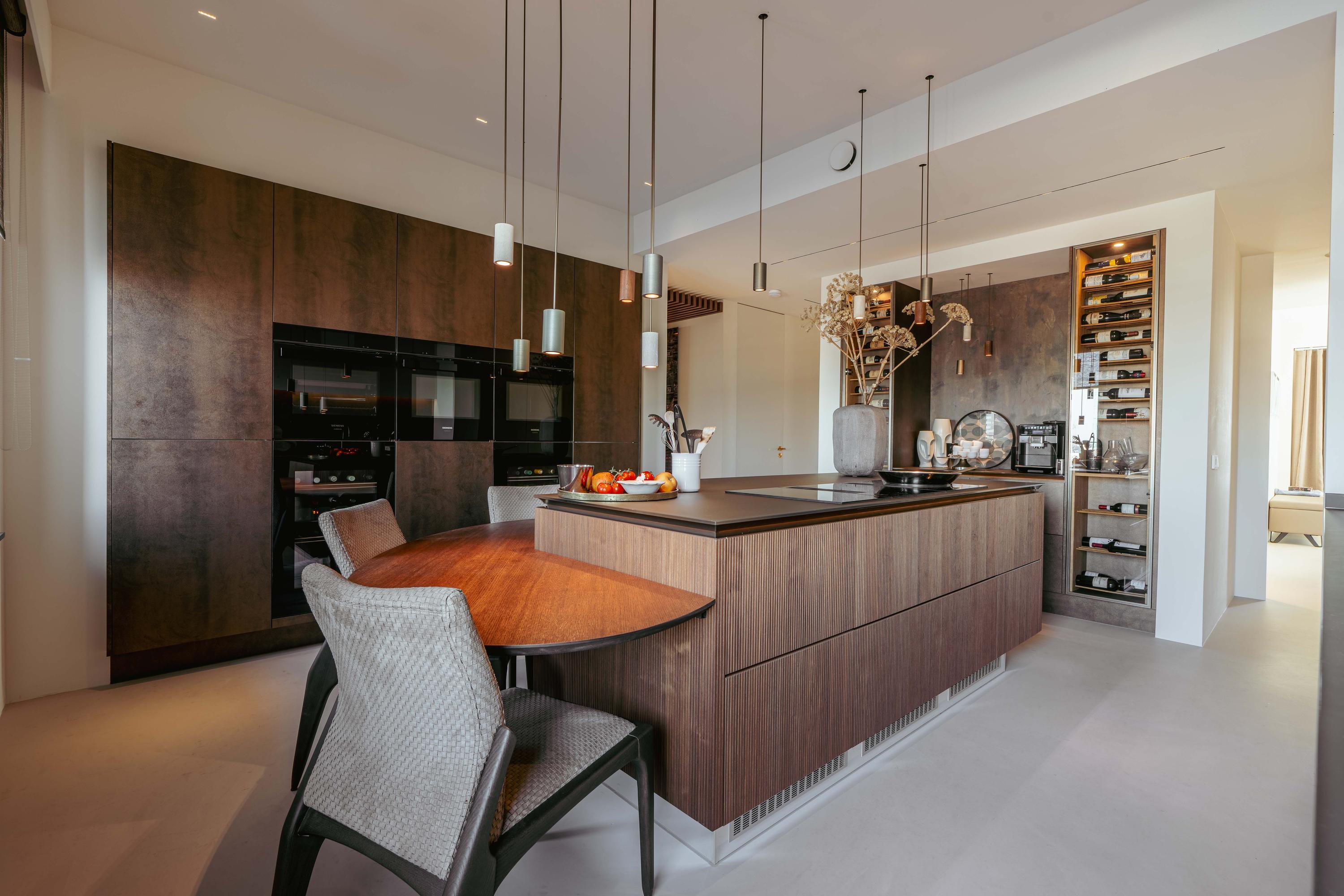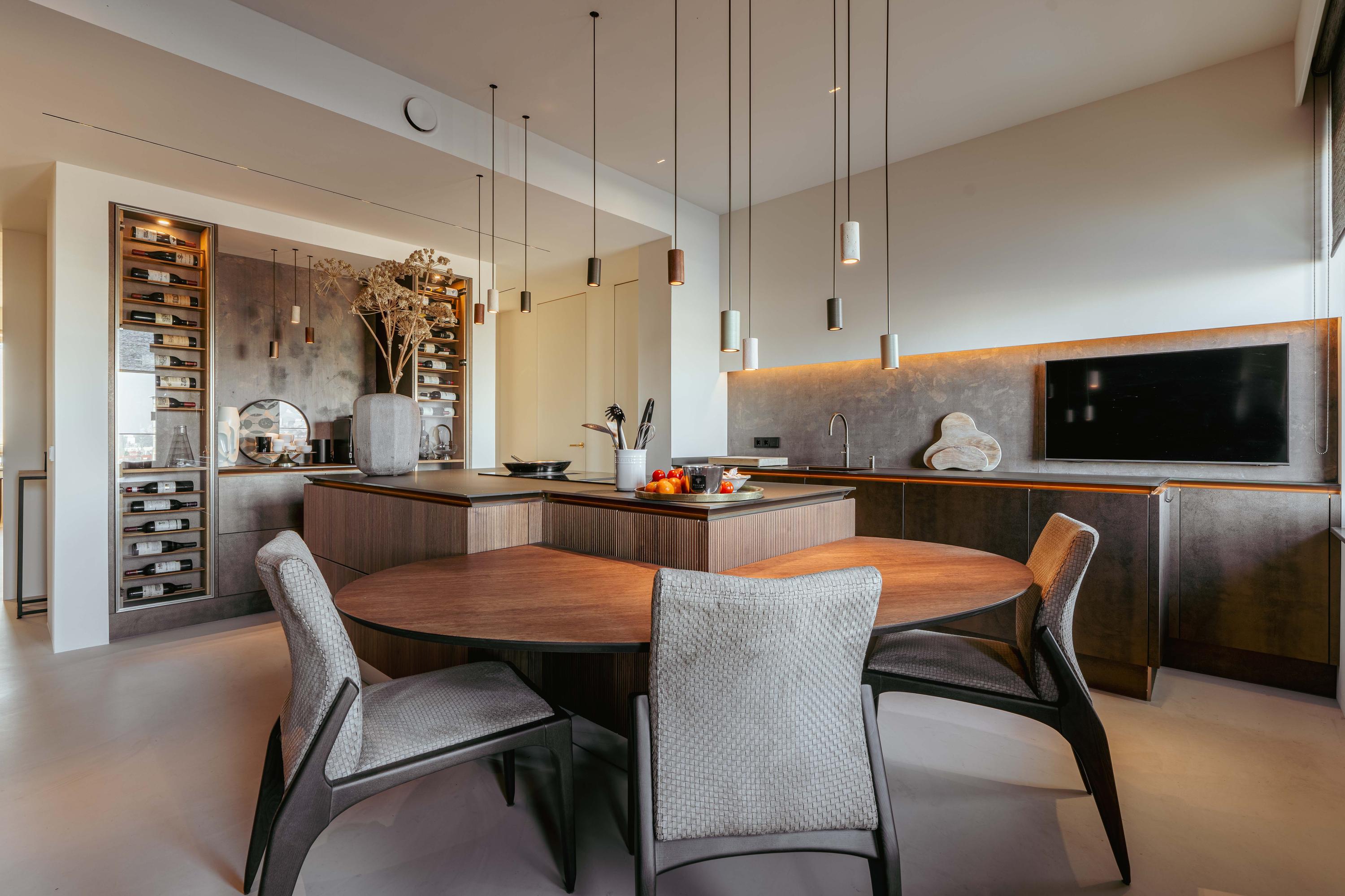 From the central hall, you reach the modern open kitchen, featuring a cooking island with a custom-built dining table, an induction cooktop with an integrated extractor, a dishwasher, multiple climate-controlled cabinets, two ovens and a steam oven, a TV, and a Quooker tap.