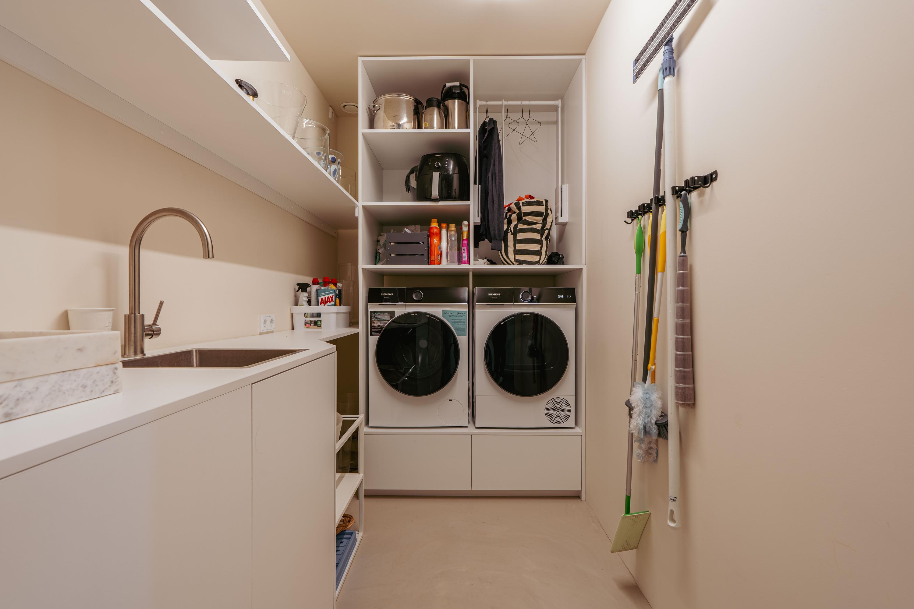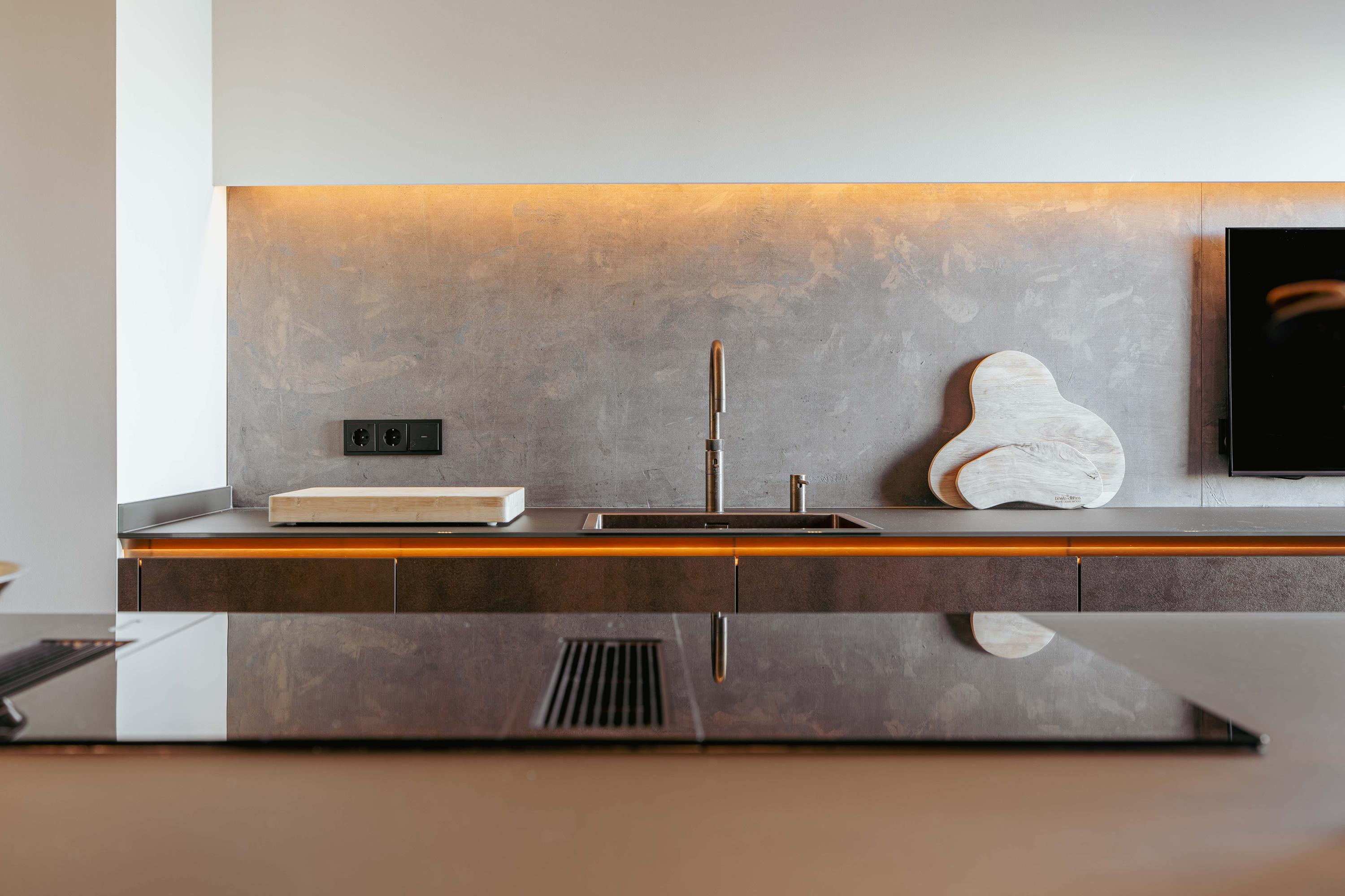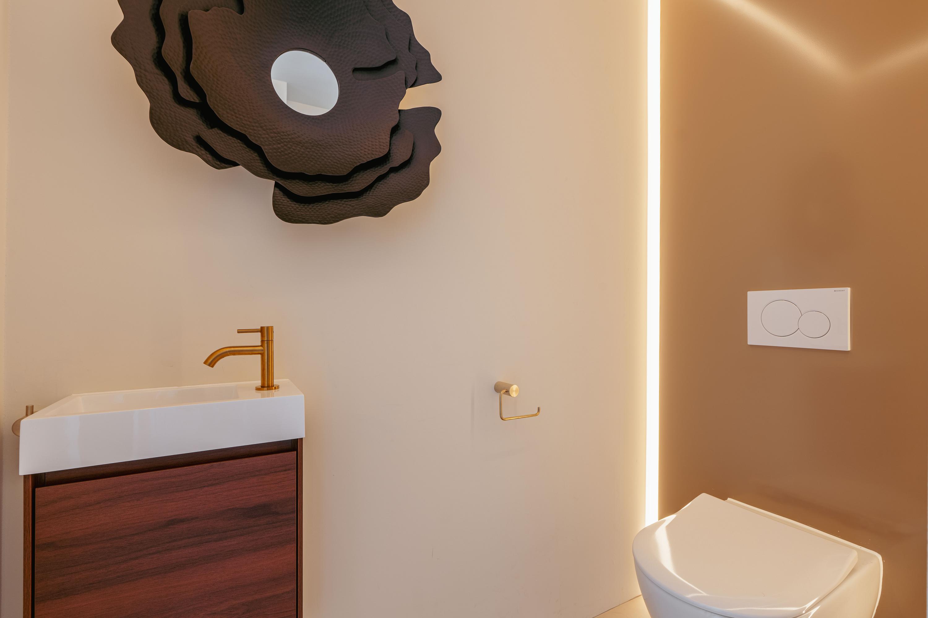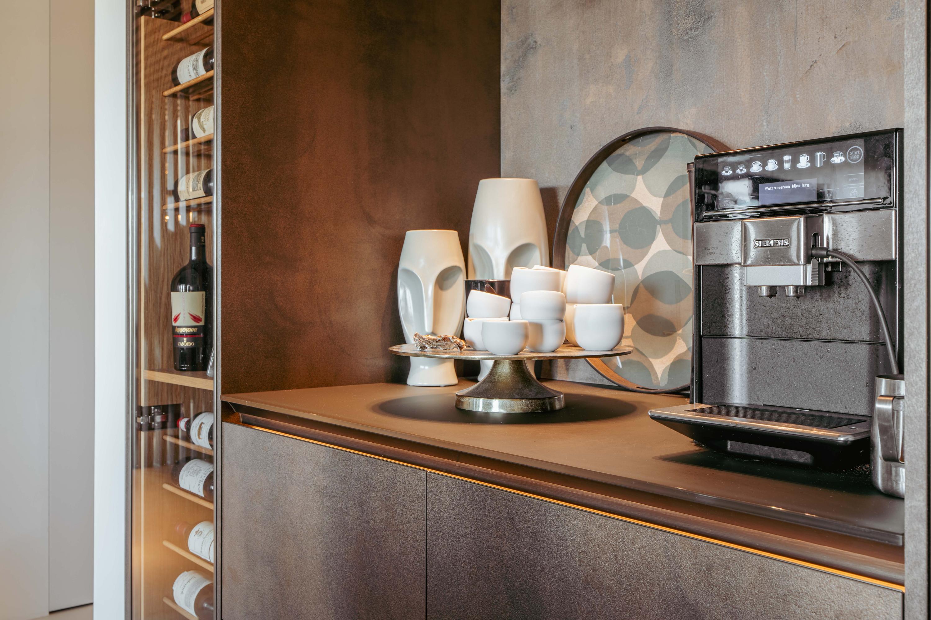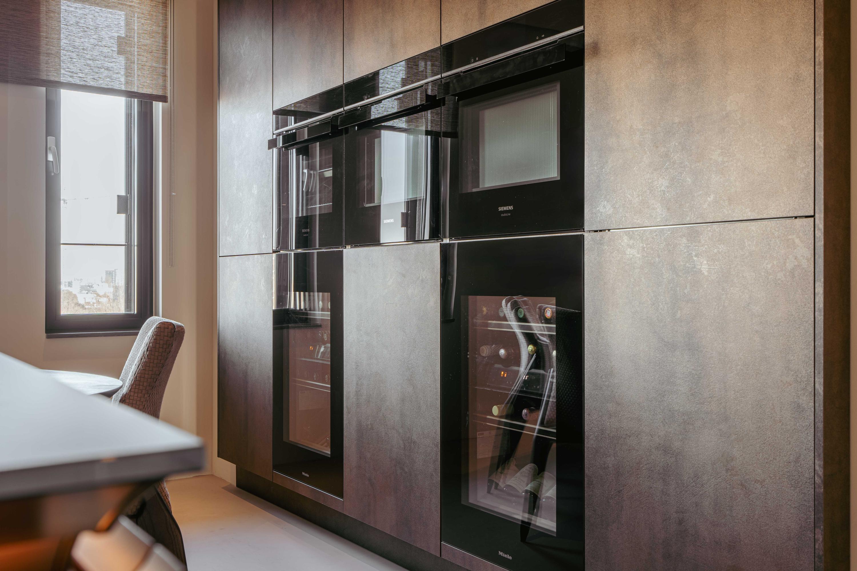 From the central hall, you reach the modern open kitchen, featuring a cooking island with a custom-built dining table, an induction cooktop with an integrated extractor, a dishwasher, multiple climate-controlled cabinets, two ovens and a steam oven, a TV, and a Quooker tap.