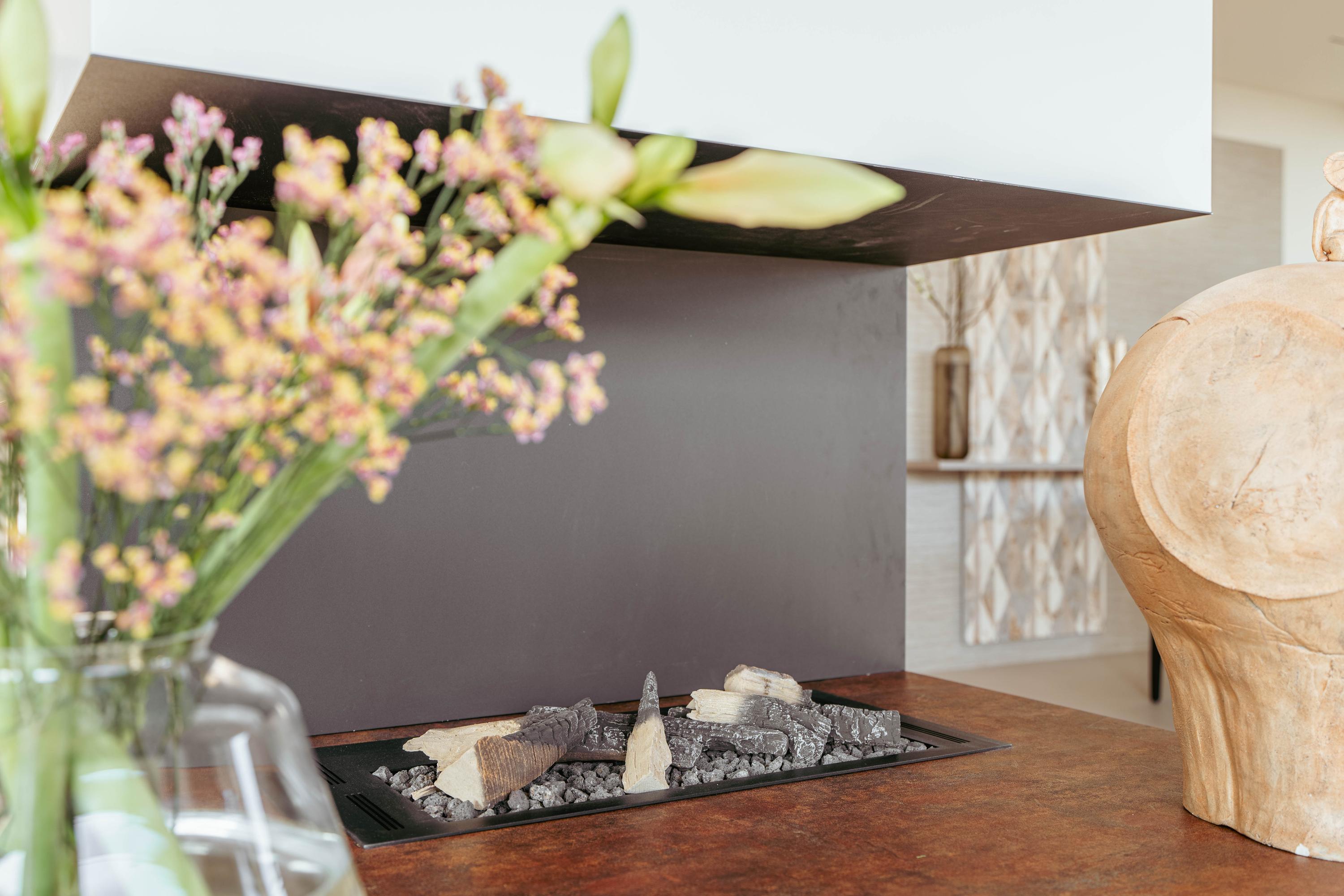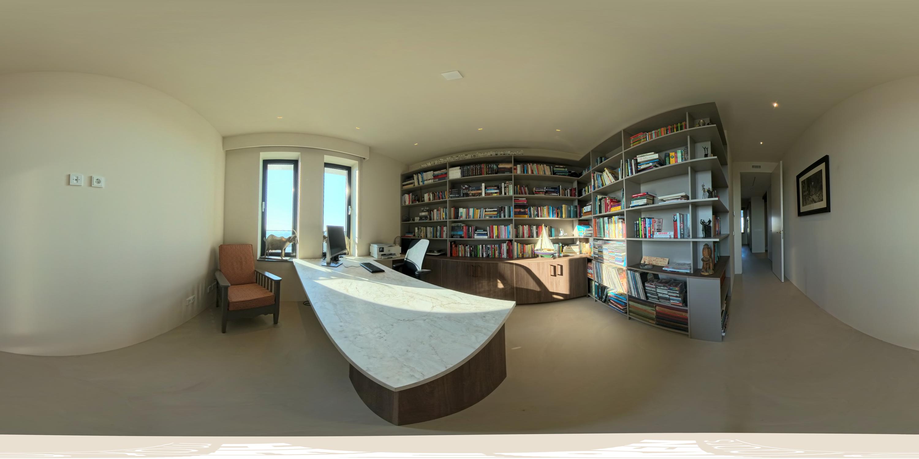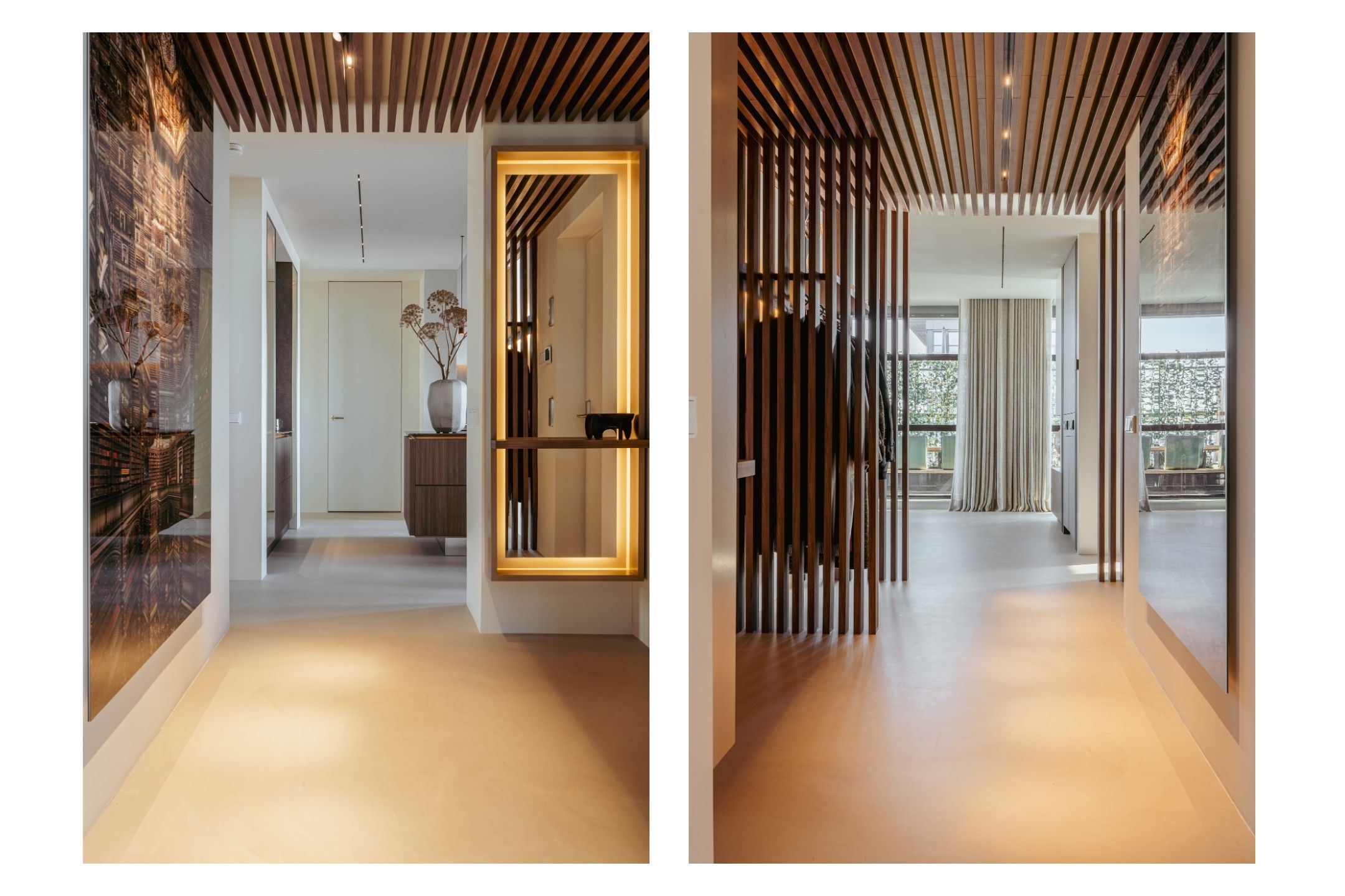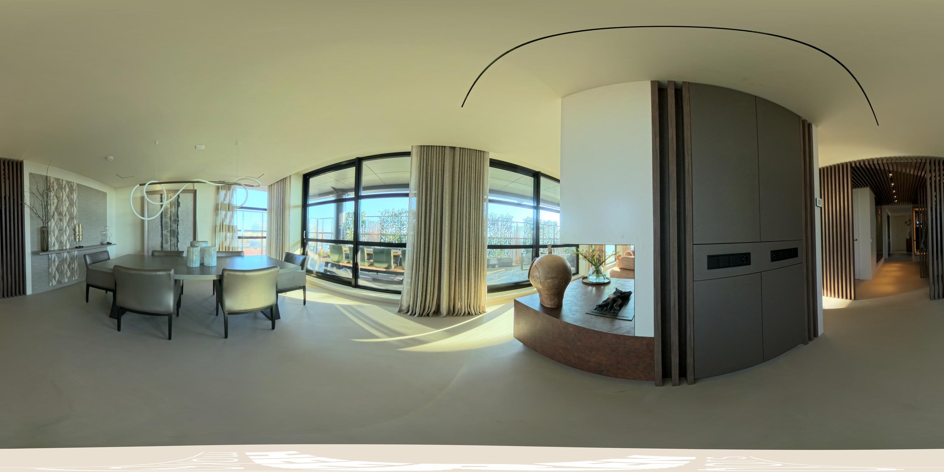 From the hall, you enter the bright and expansive living room, located on the right side of the apartment. The living area is generously designed, with large windows that flood the space with natural light. A striking central feature is the luxury fireplace, accompanied by custom-made floor-to-ceiling cabinets that elegantly separate the living and dining areas.