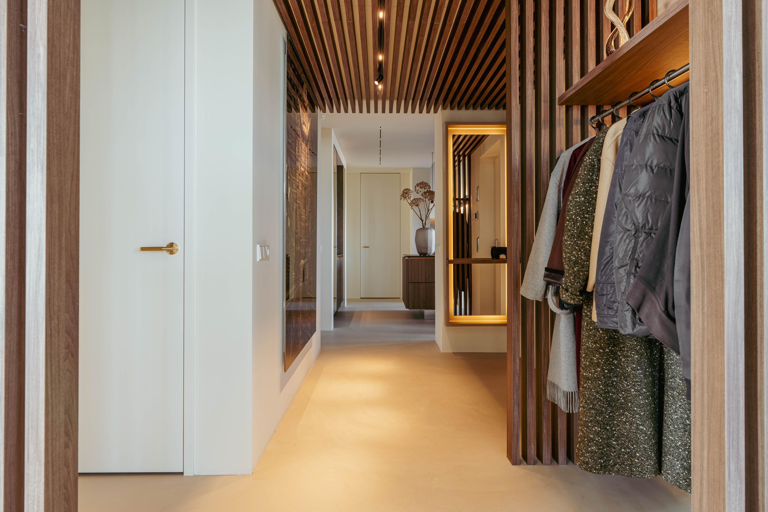 Upon entering, you step directly from the elevator into the spacious entrance hall, which provides access to various areas of the home. The hall includes a wardrobe area, a separate toilet, a technical room, and access to the broad staircase.