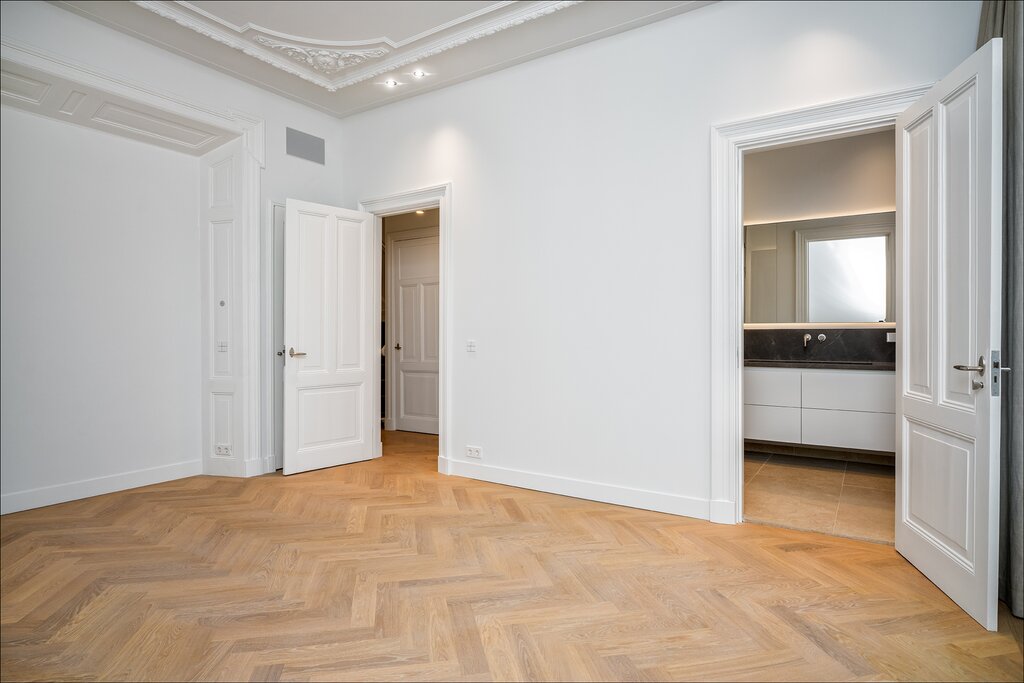 Deze ruime en lichte verdieping heeft ook hier een origineel royaal gedecoreerd plafond. Deze verdieping beschikt over 2 slaapkamers met beide een eigen badkamer