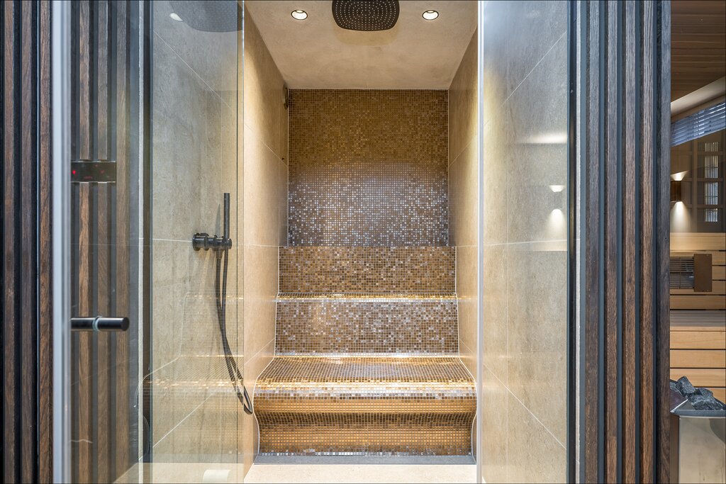 Vanuit de hal is er een open verbinding via een ruime trap naar het souterrain. Hier bevind zich aan de voorzijde de grote sauna met zowel een finse kachel, als een infrarood mogelijkheid. Daarnaast is een grote inloopdouche met een zitje en stoomdouche en daarnaast nog een separaat toilet. De ruime fitnessruimte heeft een separate muziek/entertainment installatie en beschikt over voldoende ruimte voor meerdere fitnessapparaten.