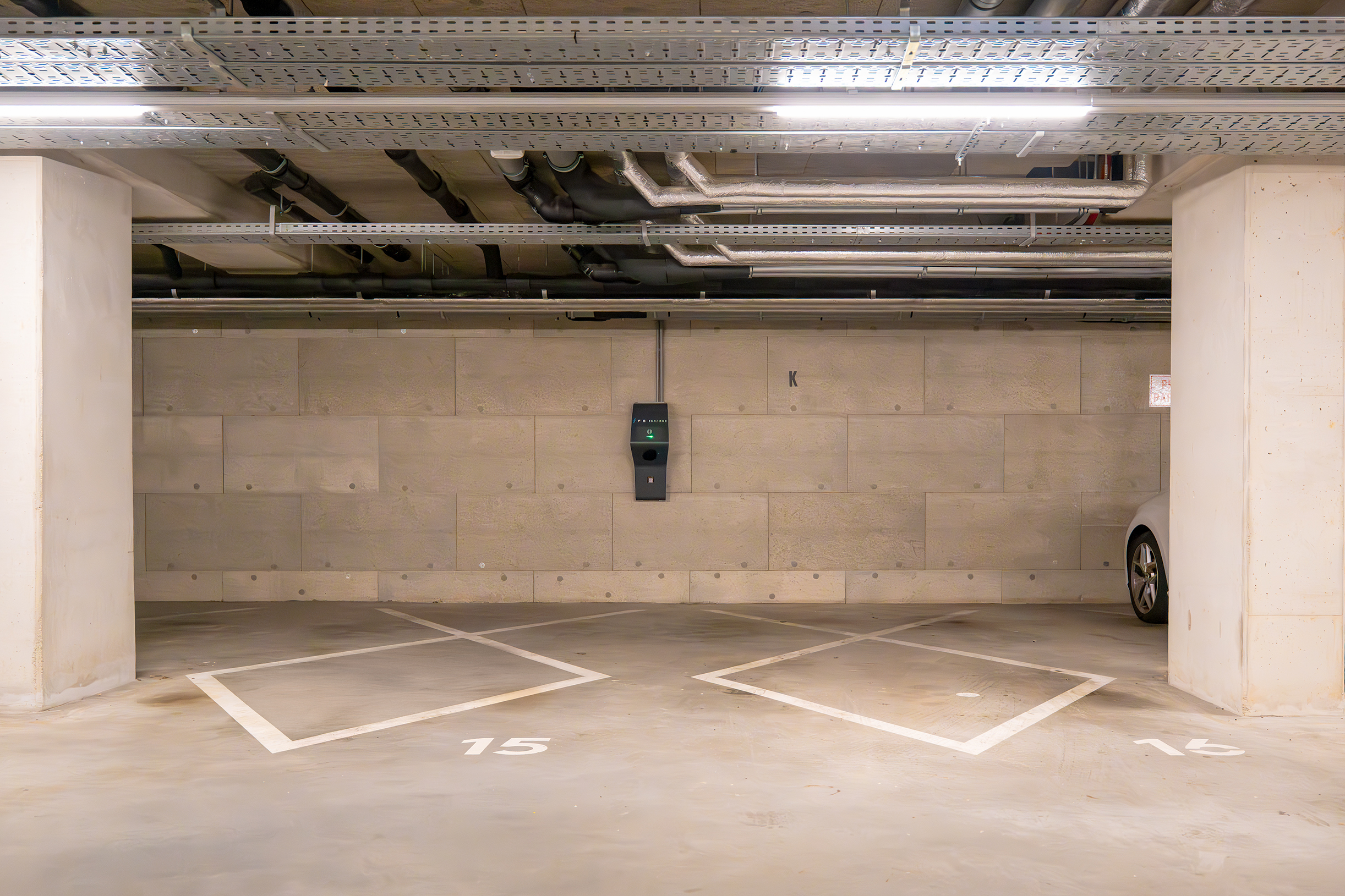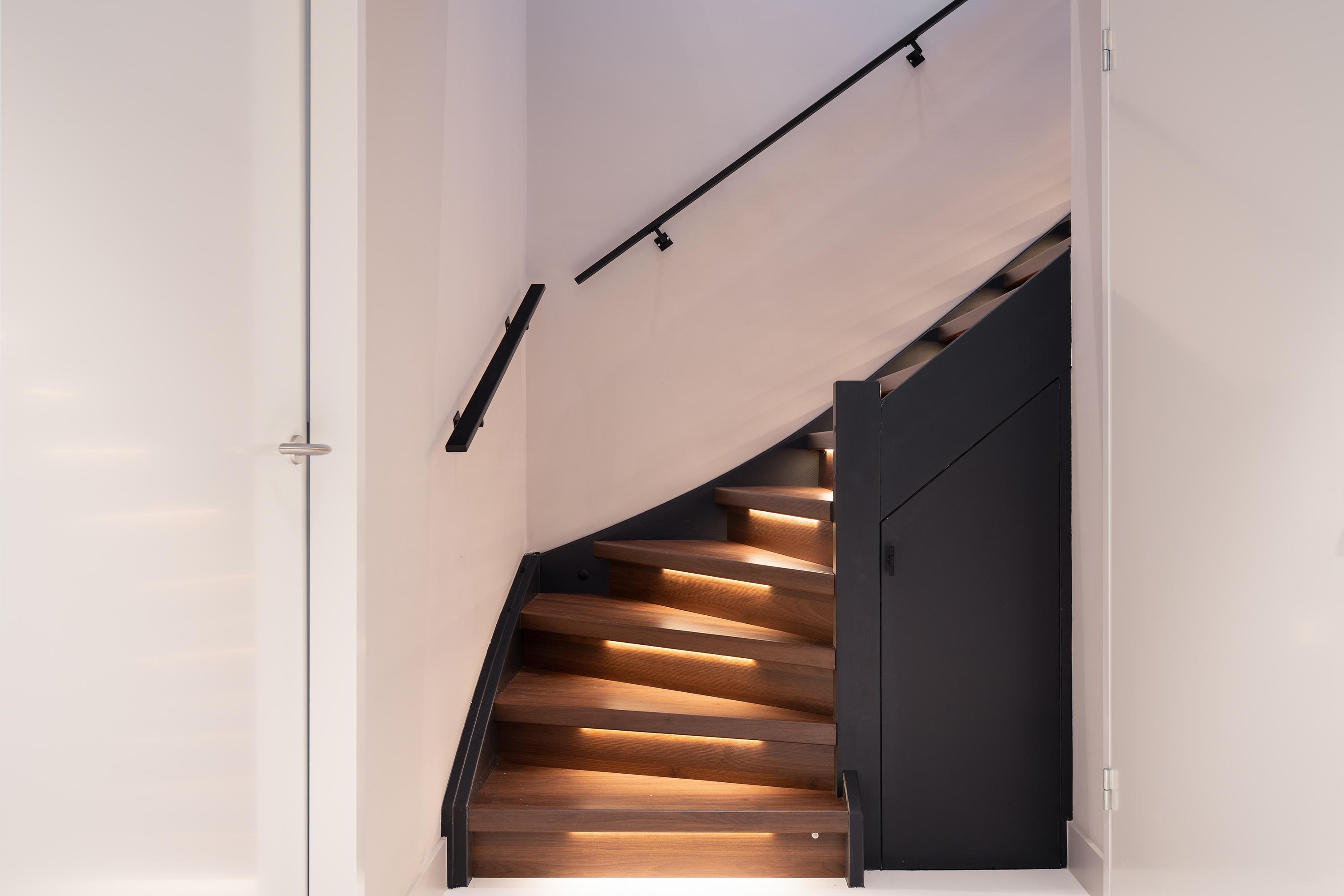 Spacious central hallway, utility room with washer/dryer setup in custom-built cabinetry (both AEG machines available for takeover), master bedroom with a high-end custom wardrobe by De Maatfabriek, second bedroom/guest room, modern bathroom with walk-in shower, second toilet, and washbasin. This level is ideal for sleeping or working, with ample natural light and windows that open in both bedrooms.