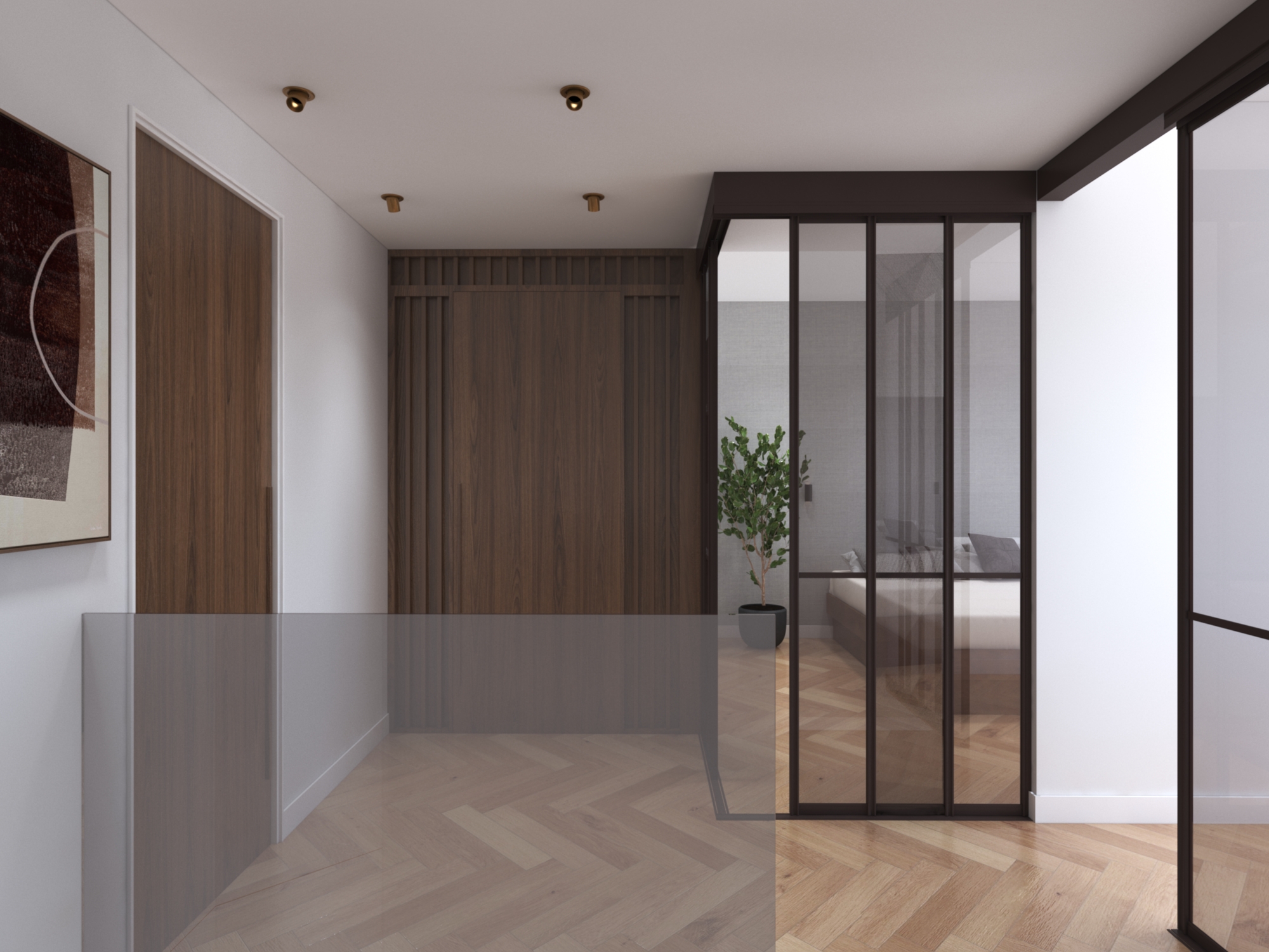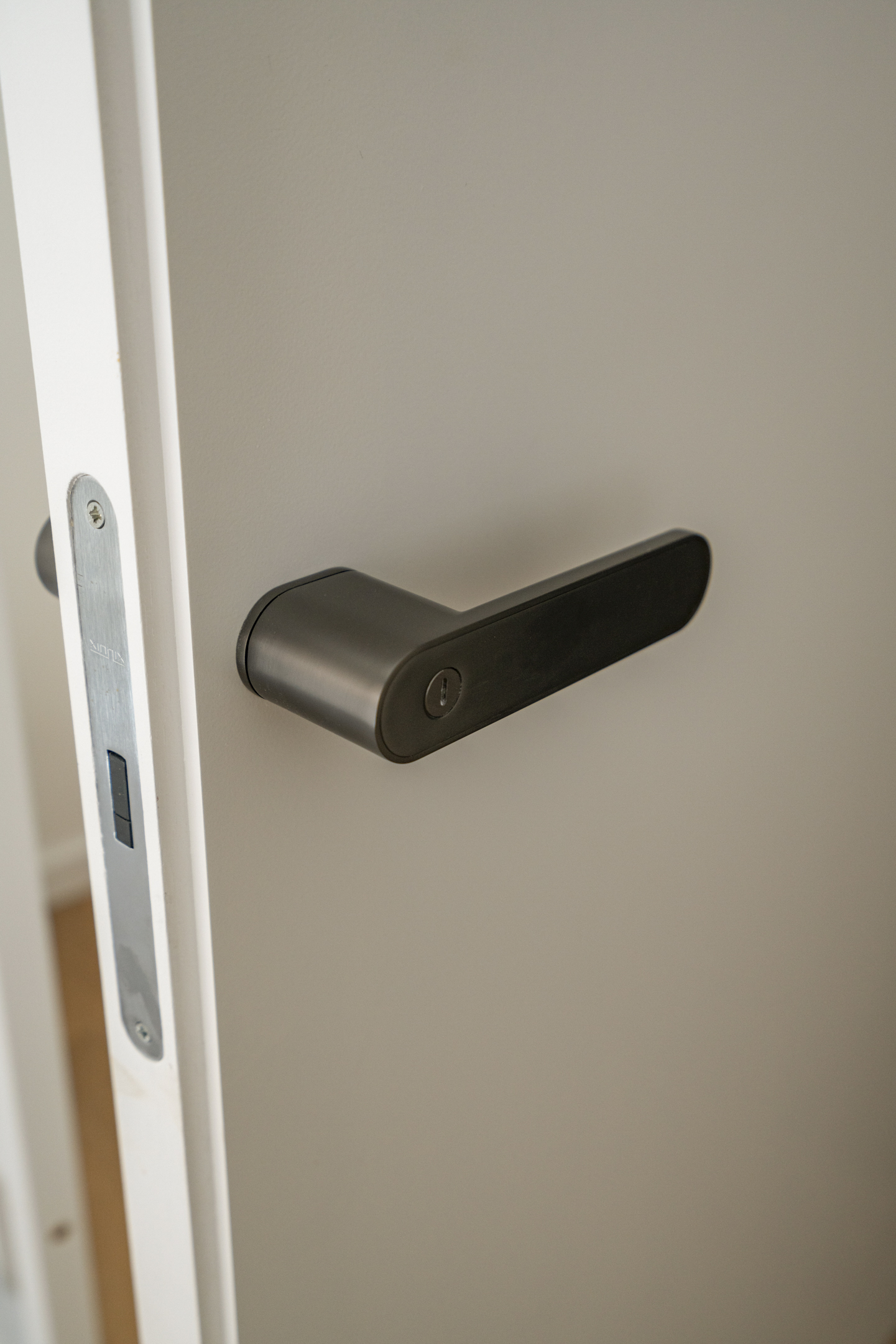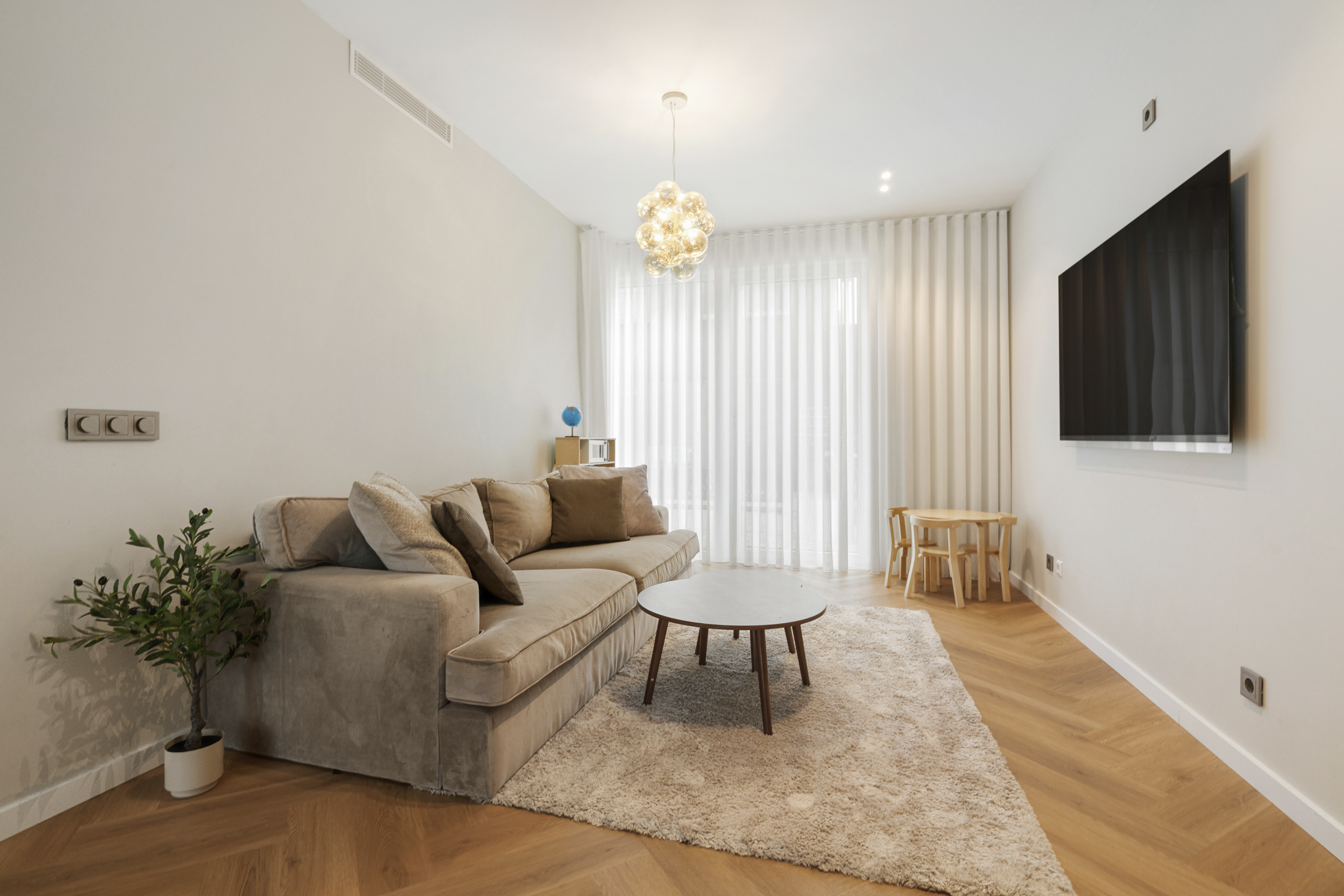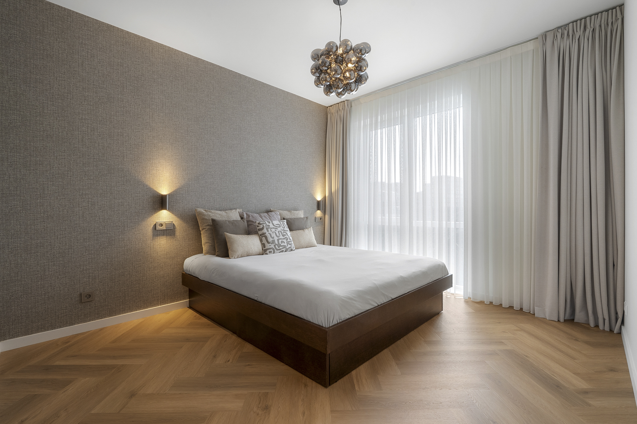 The entrance with cloakroom and luxury toilet leads into the spacious living area. Thanks to high ceilings and large windows, you immediately experience light, air and space. The living room features built-in Daikin air conditioning and a high-end PVC floor that continues throughout the house.