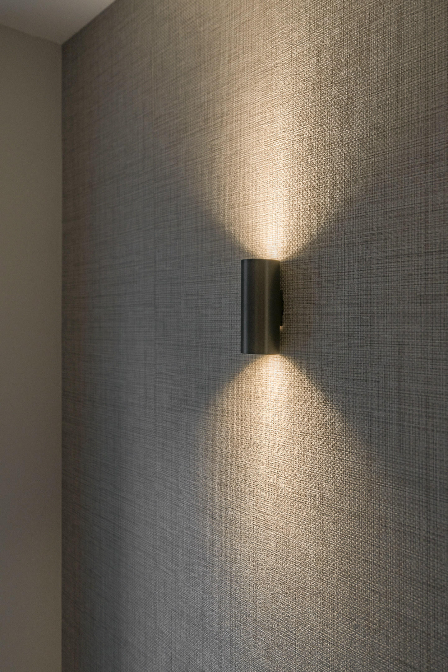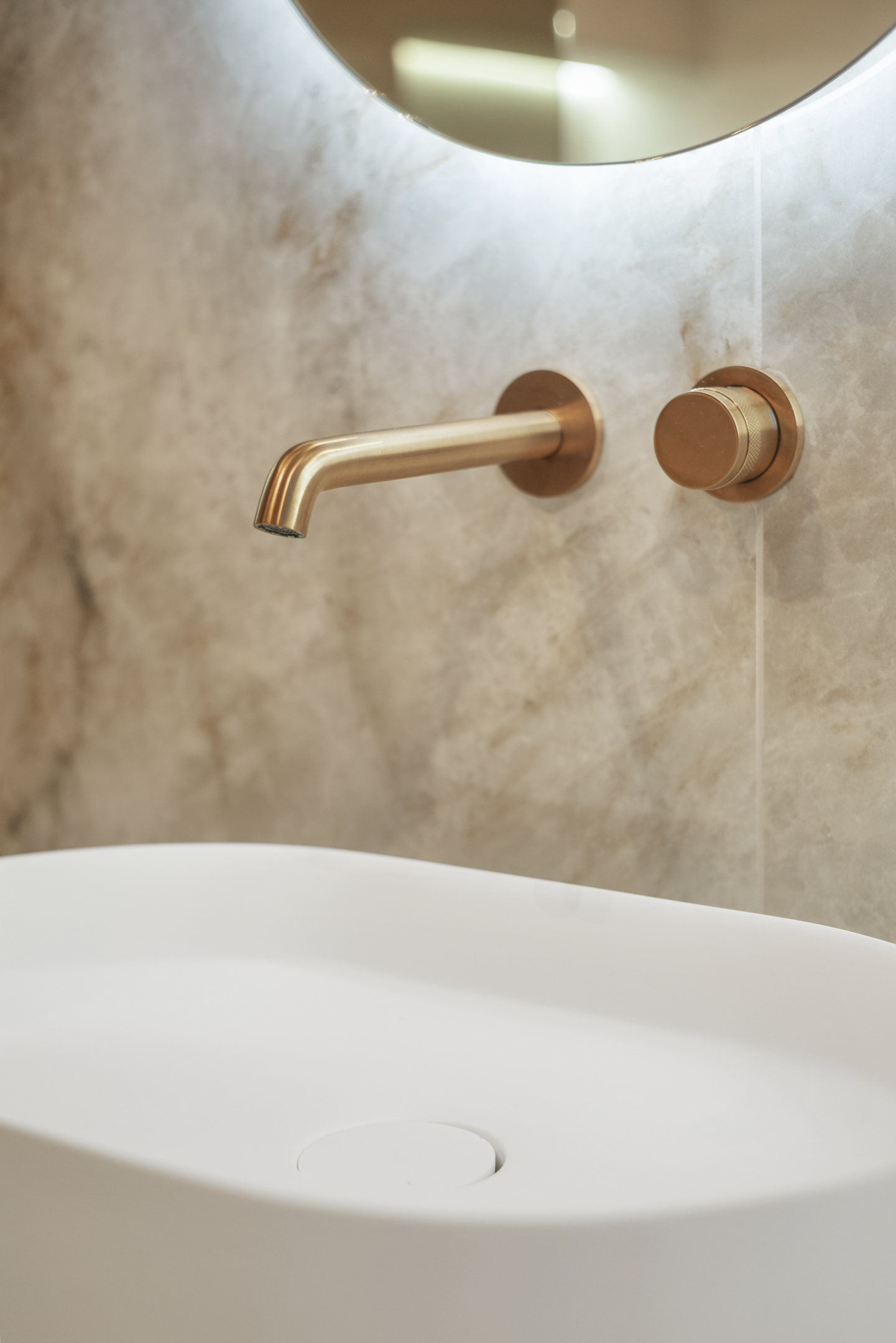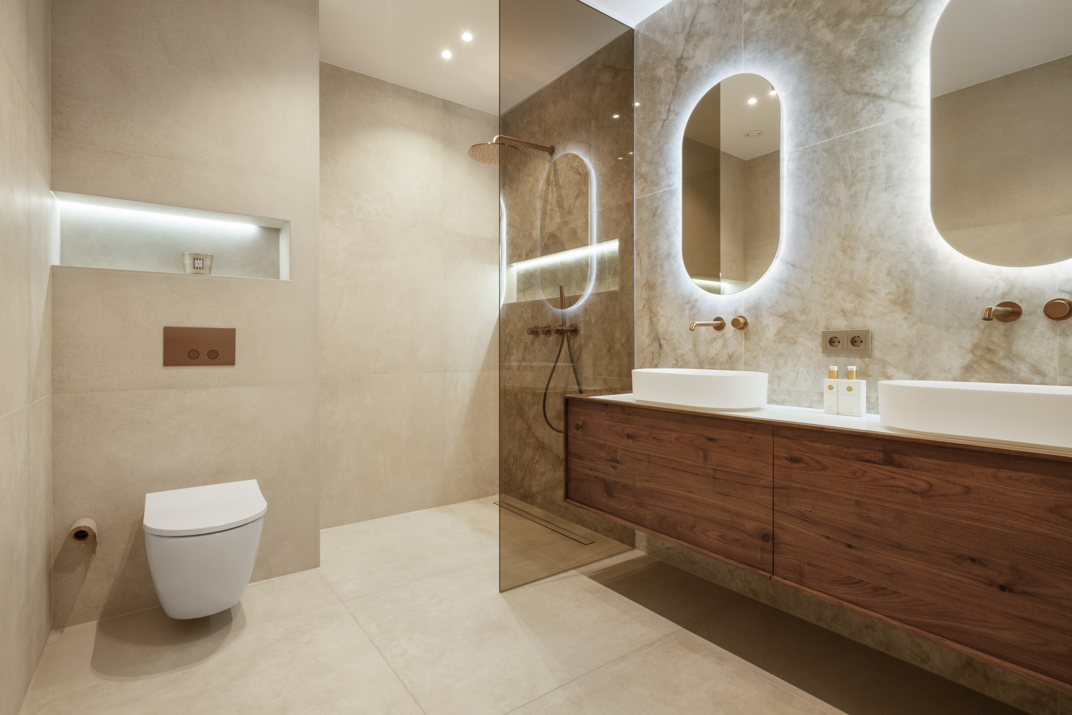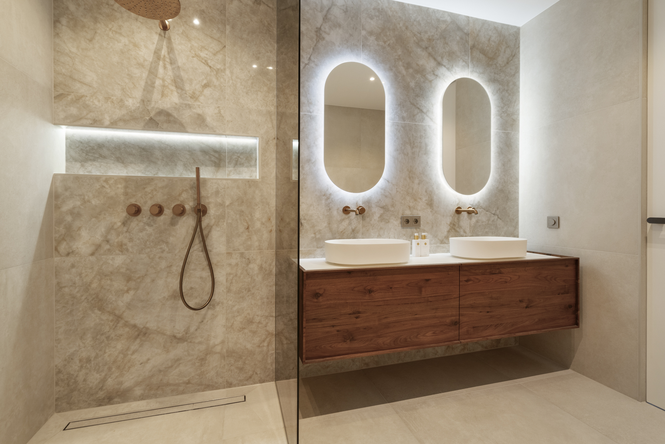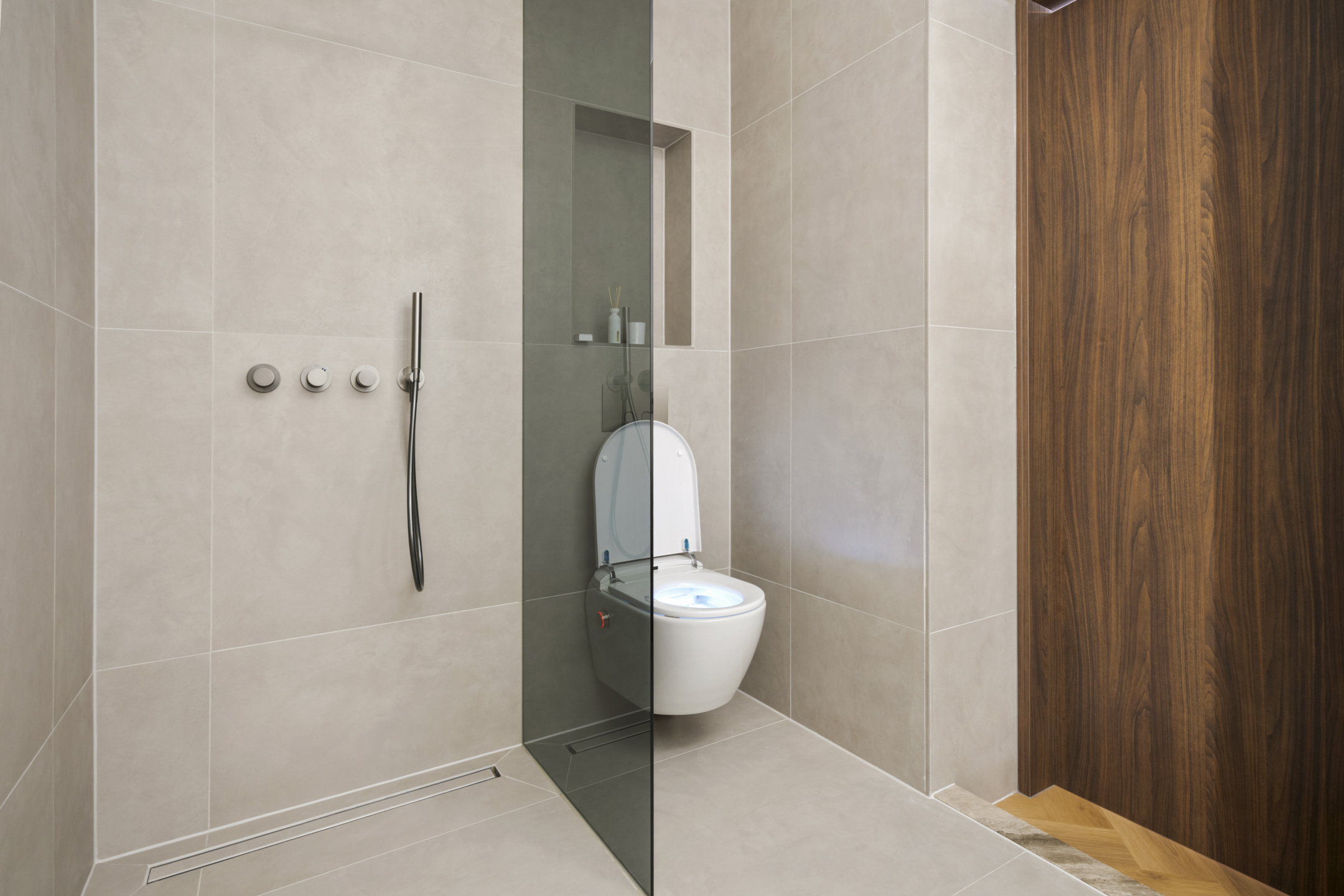 On the first floor there are two spacious bedrooms: one at the front and one at the rear. Between them lies the luxurious and spacious bathroom with a double solid surface sink, American walnut vanity, illuminated and heated mirrors, custom floating shower walls and built-in rain shower with Blaufoss taps (7-year warranty).