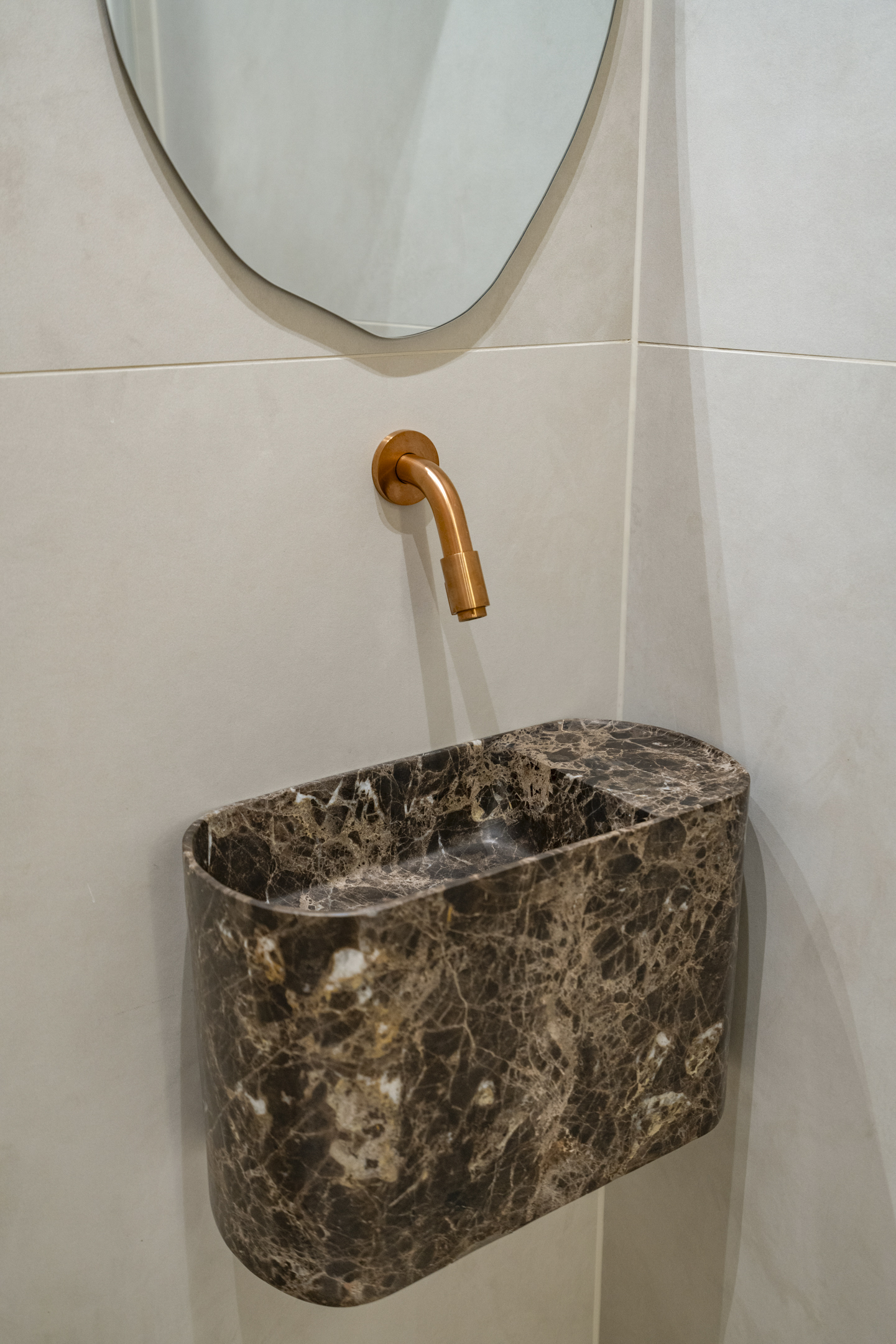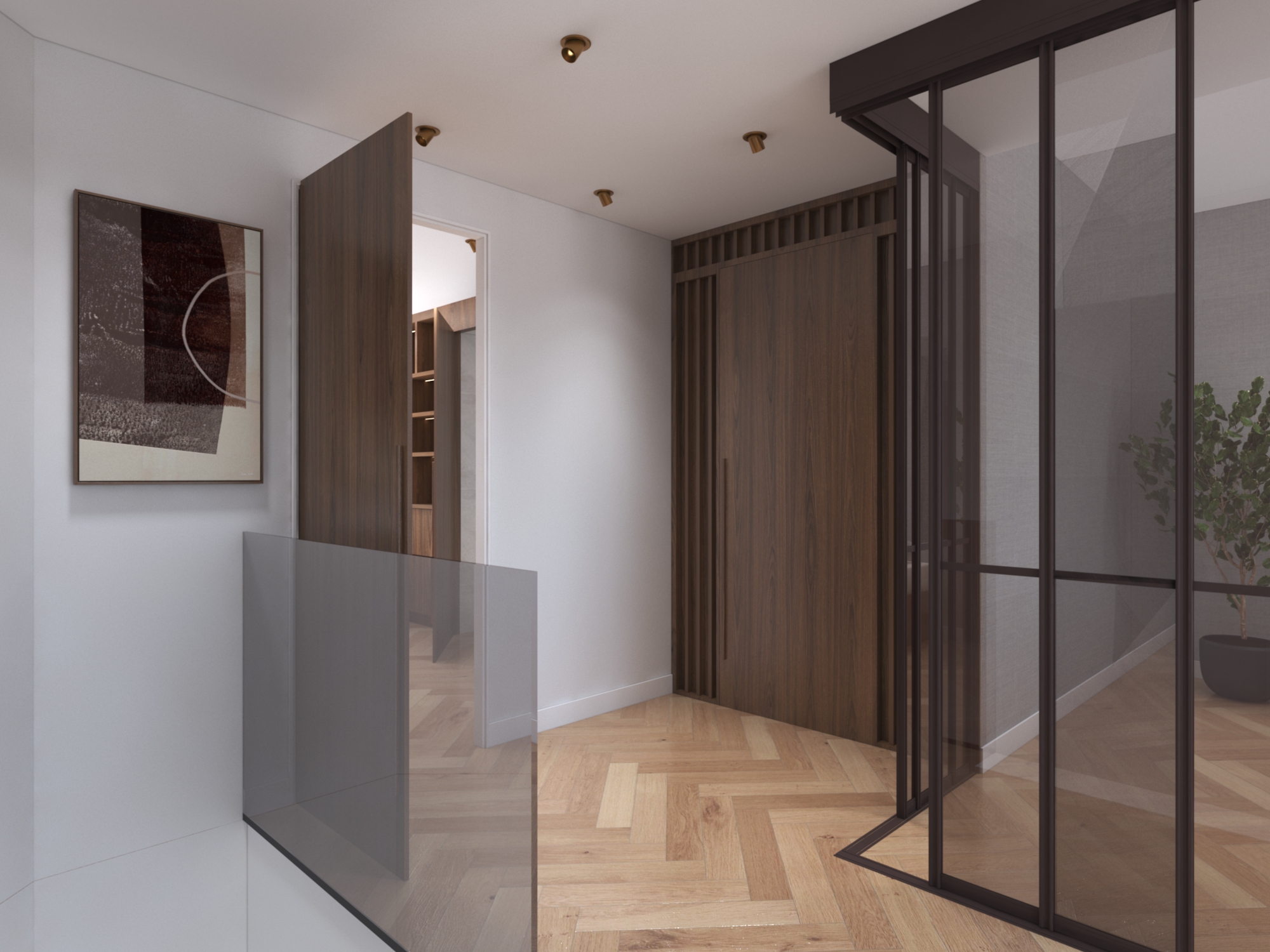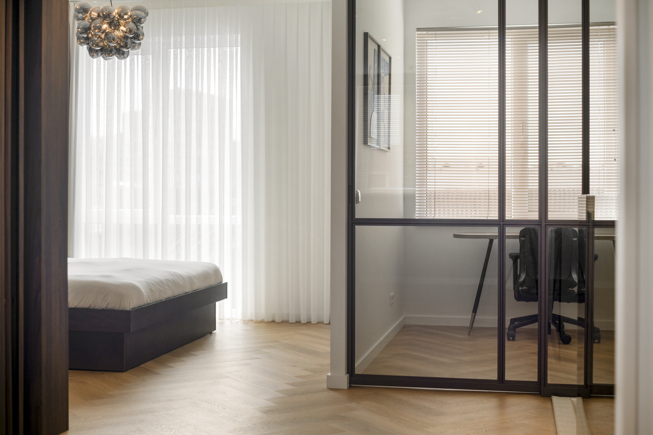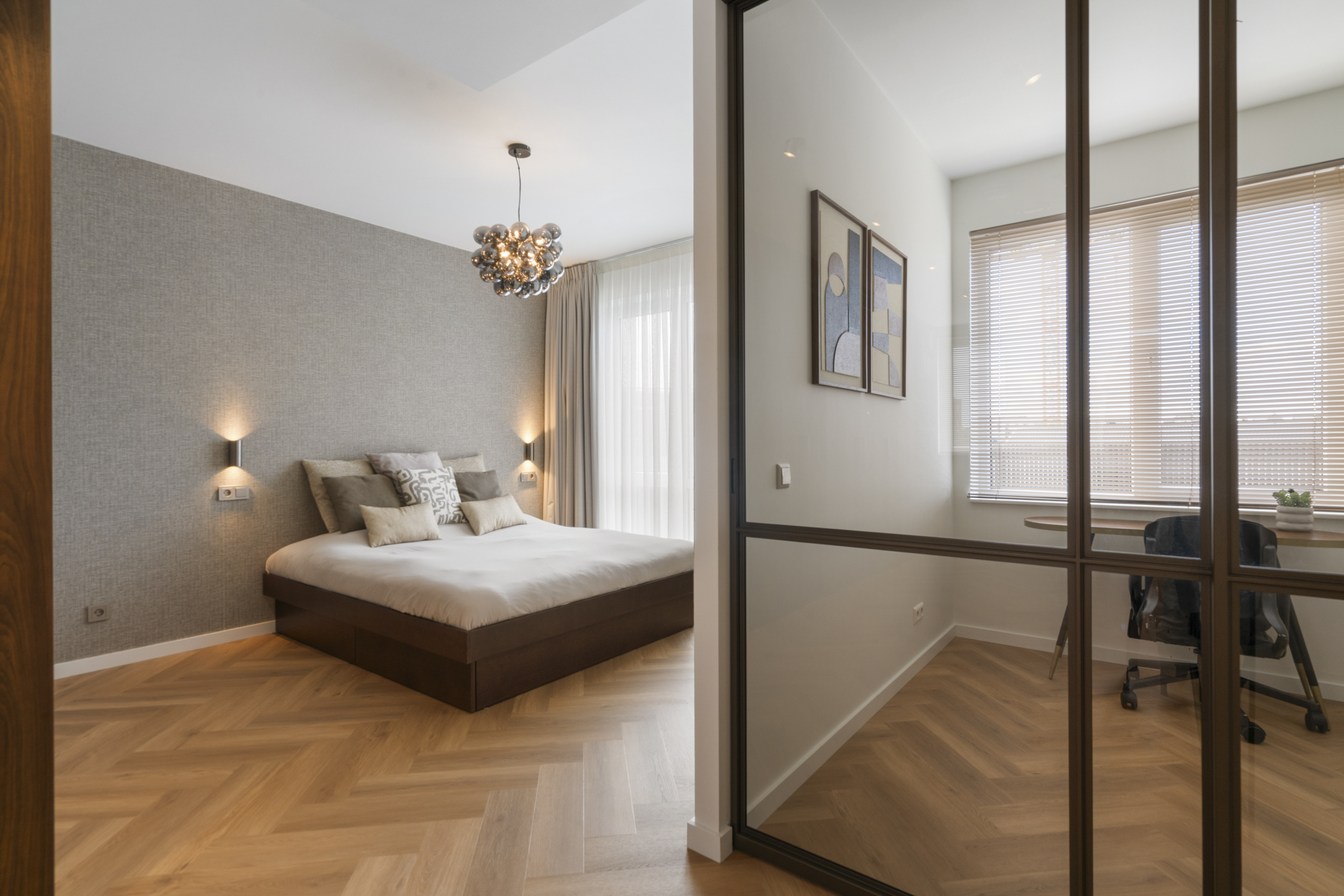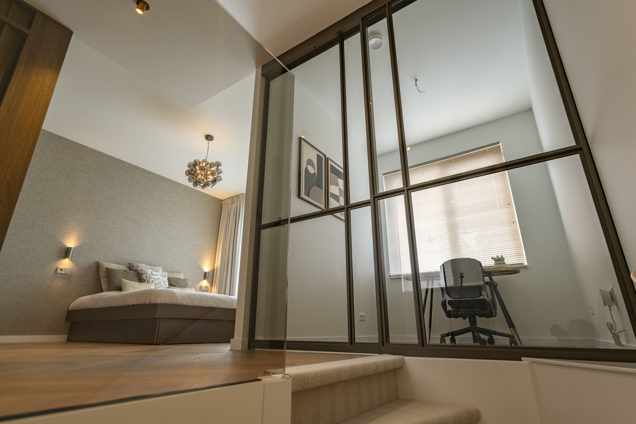 The second floor is a generous open space (designed as a hotel suite for the parents) with a study that can be closed off by a glass steel sliding door by De Rooy (with Frits Jurgens soft-close system). This floor can still be arranged to your own wishes: for example, an extra bedroom or a hobby room. With prepared connections for a pantry and data cabling for a sound system, it is fully future-proof. This floor also has built-in Daikin air conditioning. Custom-made built-in wardrobes provide access to the technical room and the hidden bathroom, featuring a bespoke marble double sink, solid American walnut vanity, illuminated and heated mirrors, floating smoked-glass shower wall, built-in taps and rain shower by Blaufoss (7-year warranty) and a Japanese shower toilet.