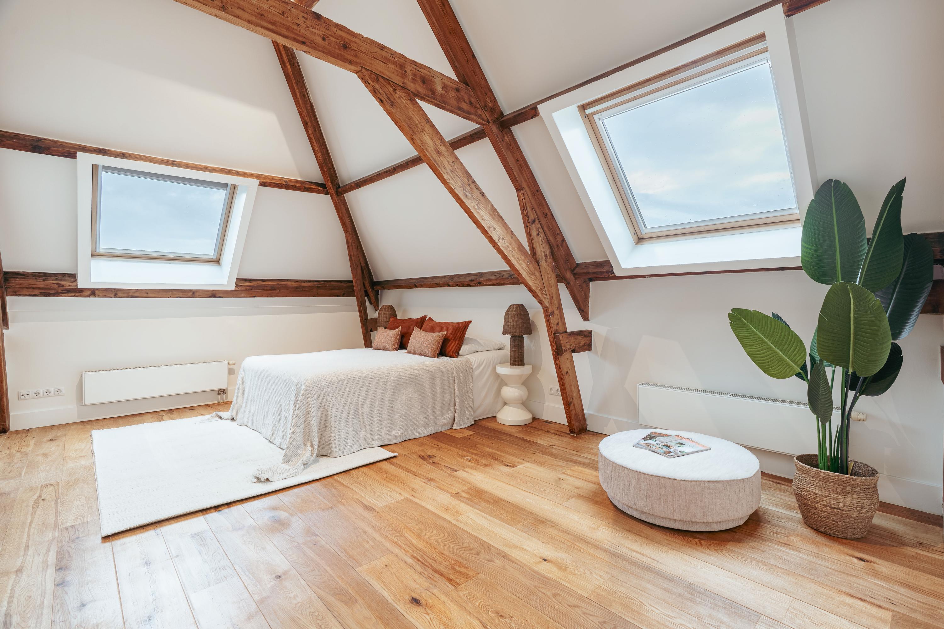 A special and playful feature is the two mezzanines between the rooms — inviting spots for reading or enjoying a cup of coffee. Under these mezzanines are integrated storage cupboards. A small portion of this floor has a ceiling height below 1.5 metres, fitting with the characteristic roof shape. Throughout all rooms, authentic beams remain visible, contributing to the charm of the home.