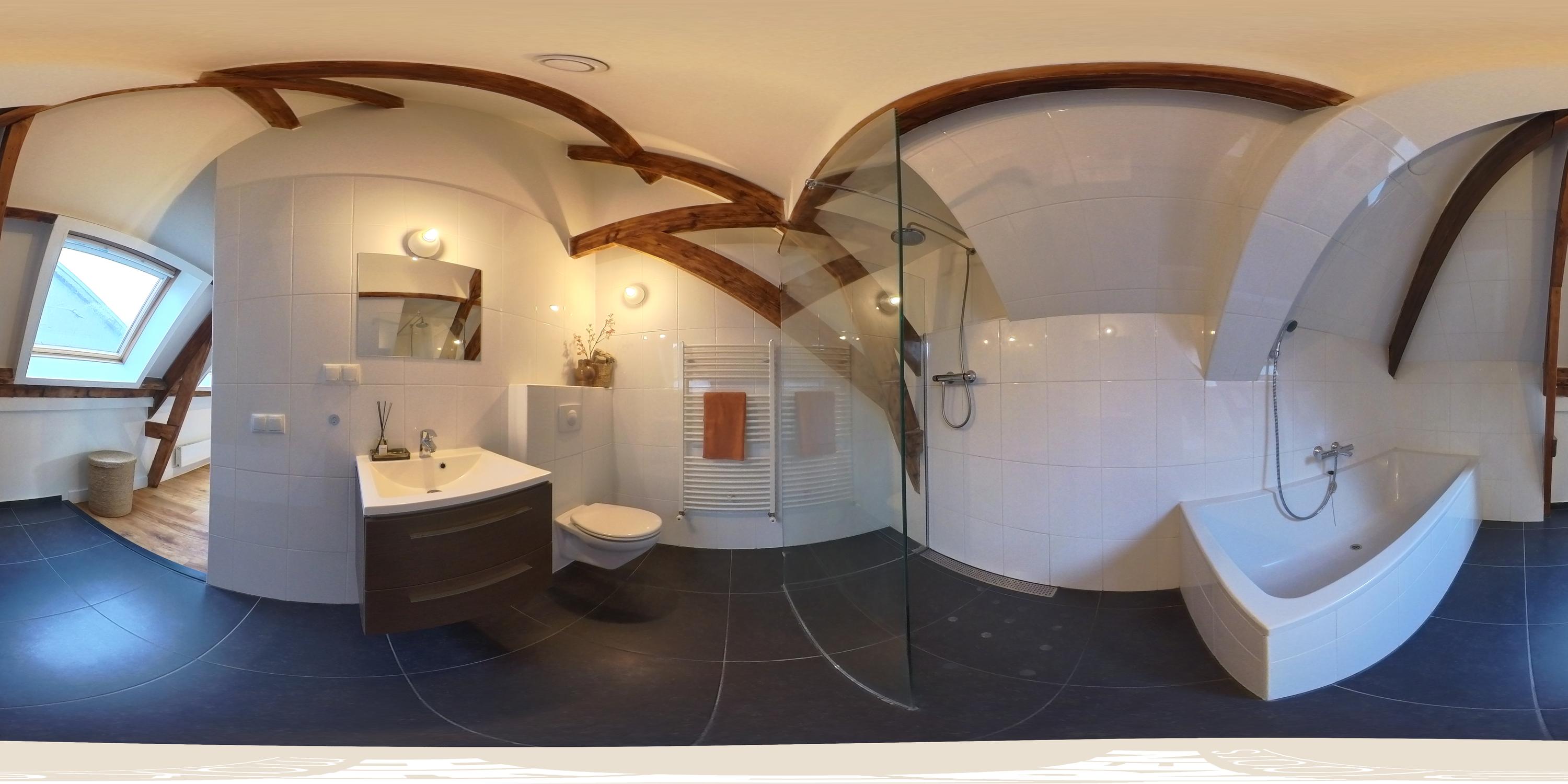 The fourth floor houses the bedrooms and bathrooms. This level offers space for multiple bedrooms, bathrooms and potentially a work or hobby area. At the front are two well-sized bedrooms, while at the rear lies a spacious master bedroom with an adjoining en-suite bathroom equipped with a bathtub, shower, toilet and washbasin. Additionally, on this floor there is a second bathroom with a shower, toilet and washbasin, accessible from the landing. If desired, the two front bedrooms can be combined into one large bedroom by removing the dividing wall.