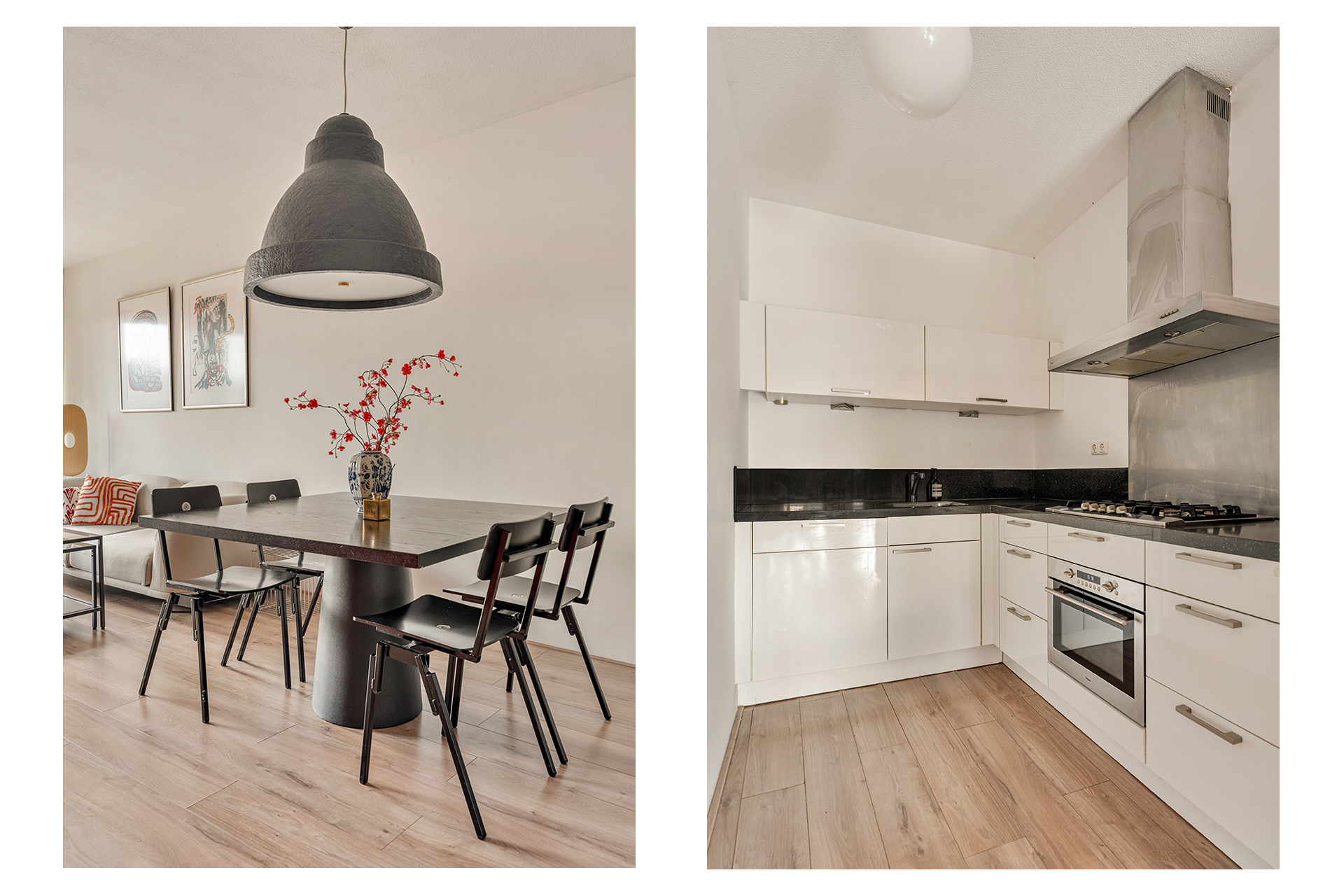 De royale en lichte woonkamer wordt gekenmerkt door grote raampartijen en dubbele openslaande deuren naar het balkon op het zuiden. Hierdoor valt er veel daglicht binnen en heeft u een prachtig uitzicht over de karakteristieke bebouwing van de Westelijke Eilanden. De ruimte biedt comfortabel plaats aan zowel een zit- als eethoek.