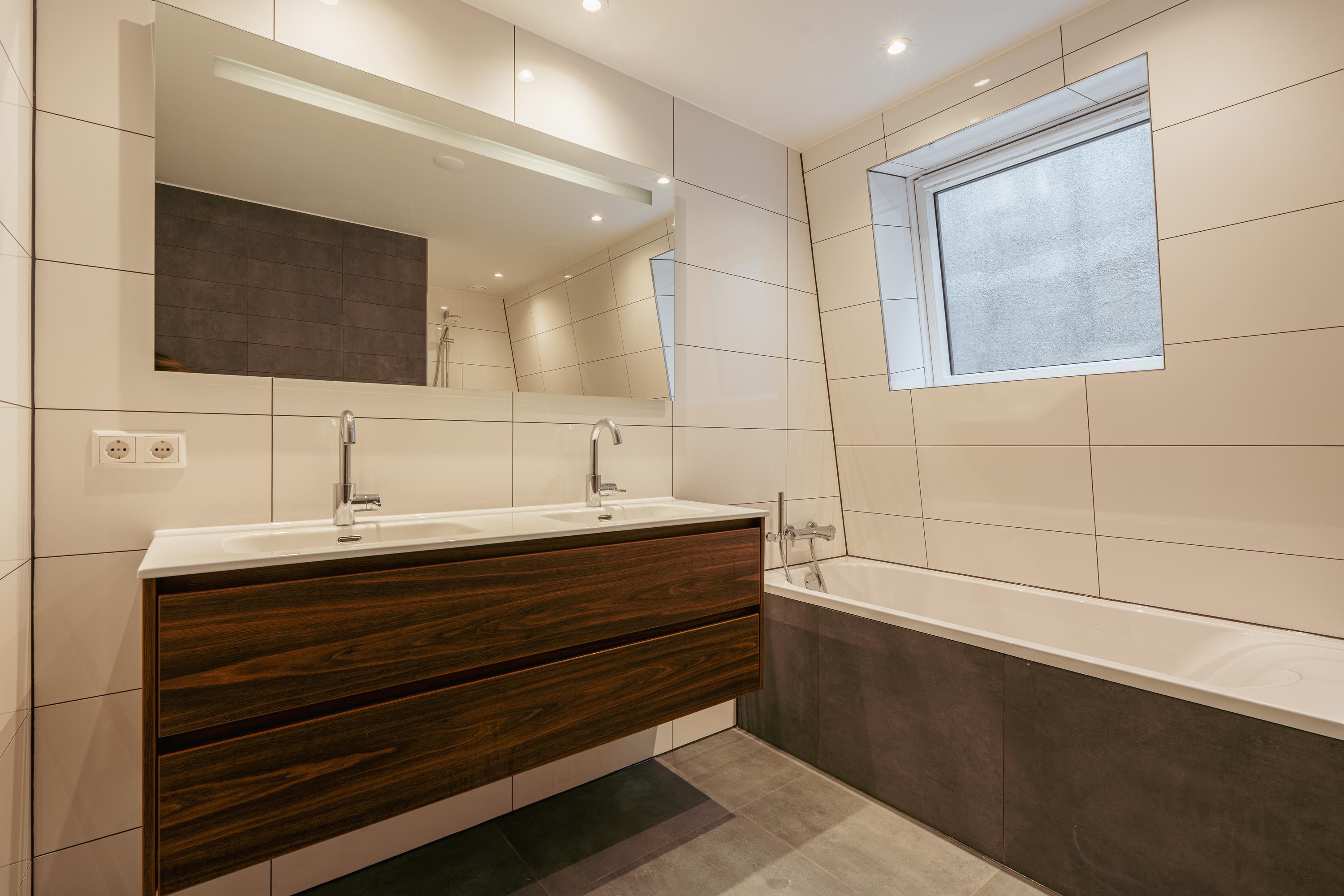 Centrally located on this floor is the modern bathroom, equipped with a double washbasin with vanity unit, a comfortable bathtub, and a spacious walk-in shower.