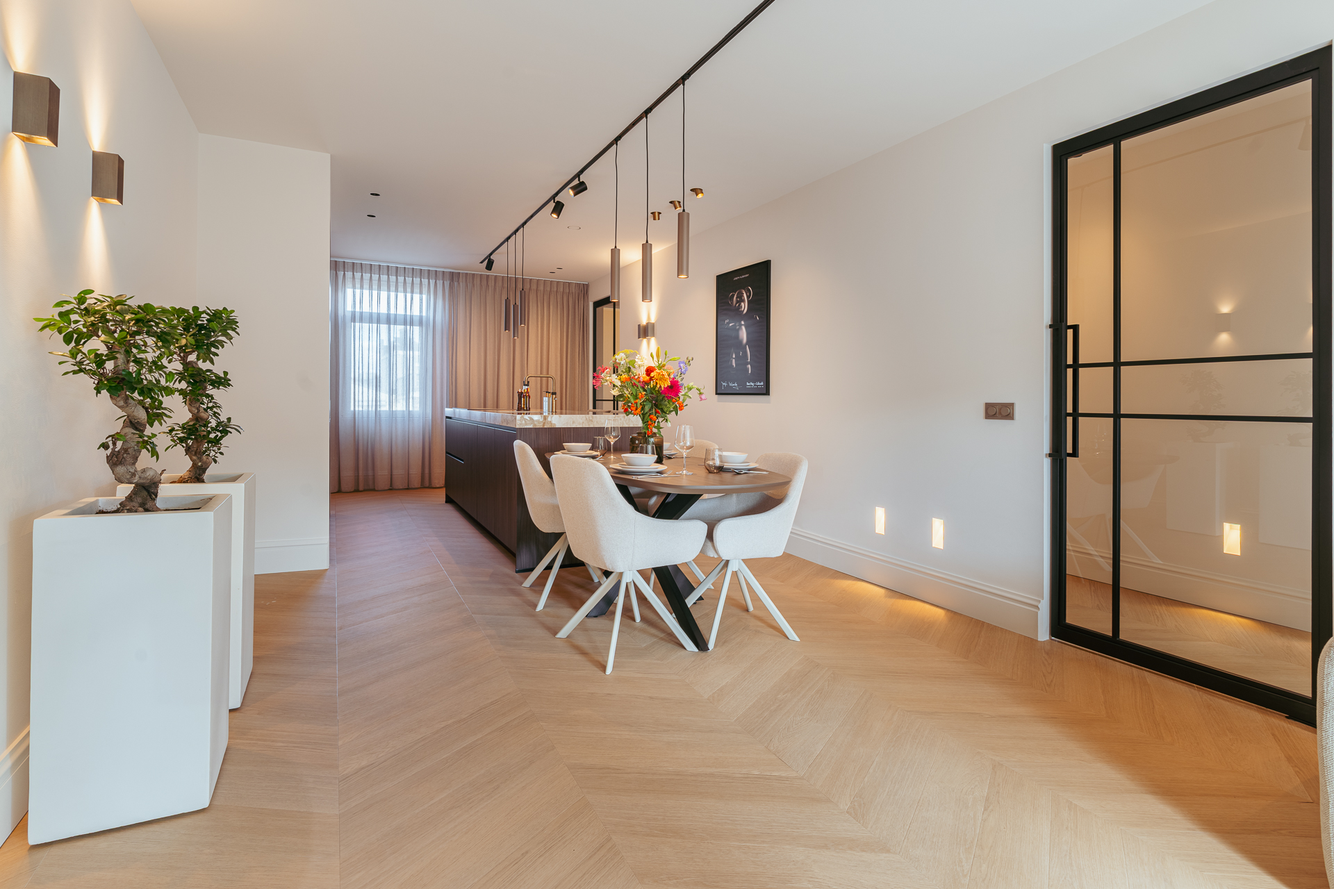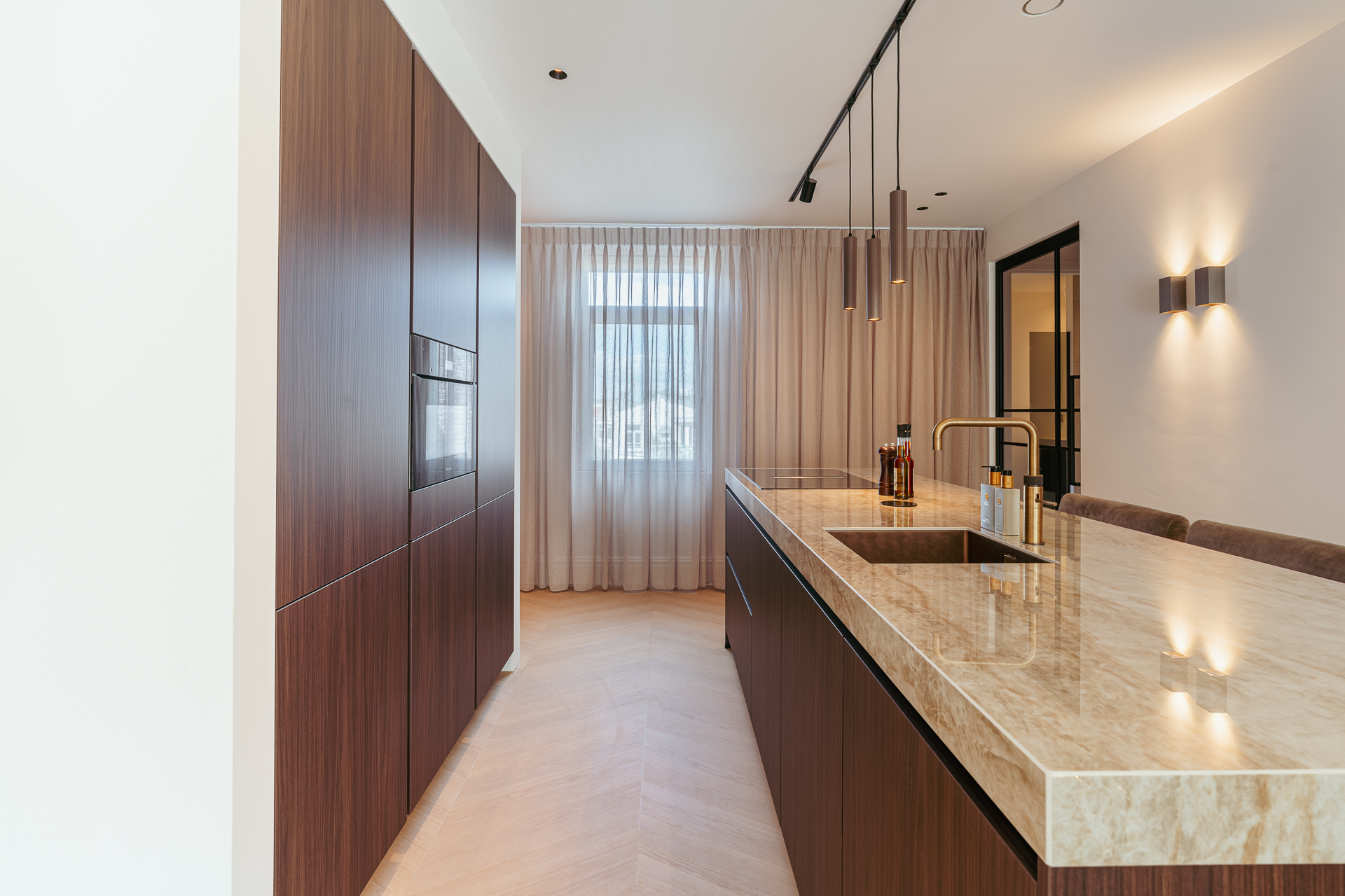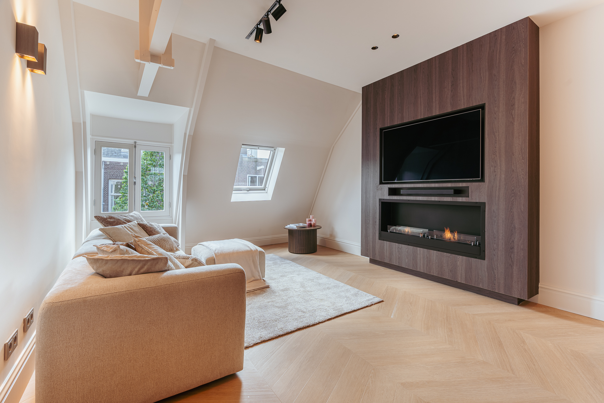 Via the communal staircase, you reach the entrance to the property on the third floor. From your private entrance, a neatly renovated staircase leads up to the apartment on the fourth floor. Upon entering, you immediately notice the warm and stylish ambiance, thanks to carefully chosen materials, atmospheric lighting, and impeccable finishes. The apartment has been renovated to a high and luxurious standard, with great attention to detail. Modern black steel doors combined with classic elements give the home a contemporary yet timeless feel, something that runs consistently throughout the property.