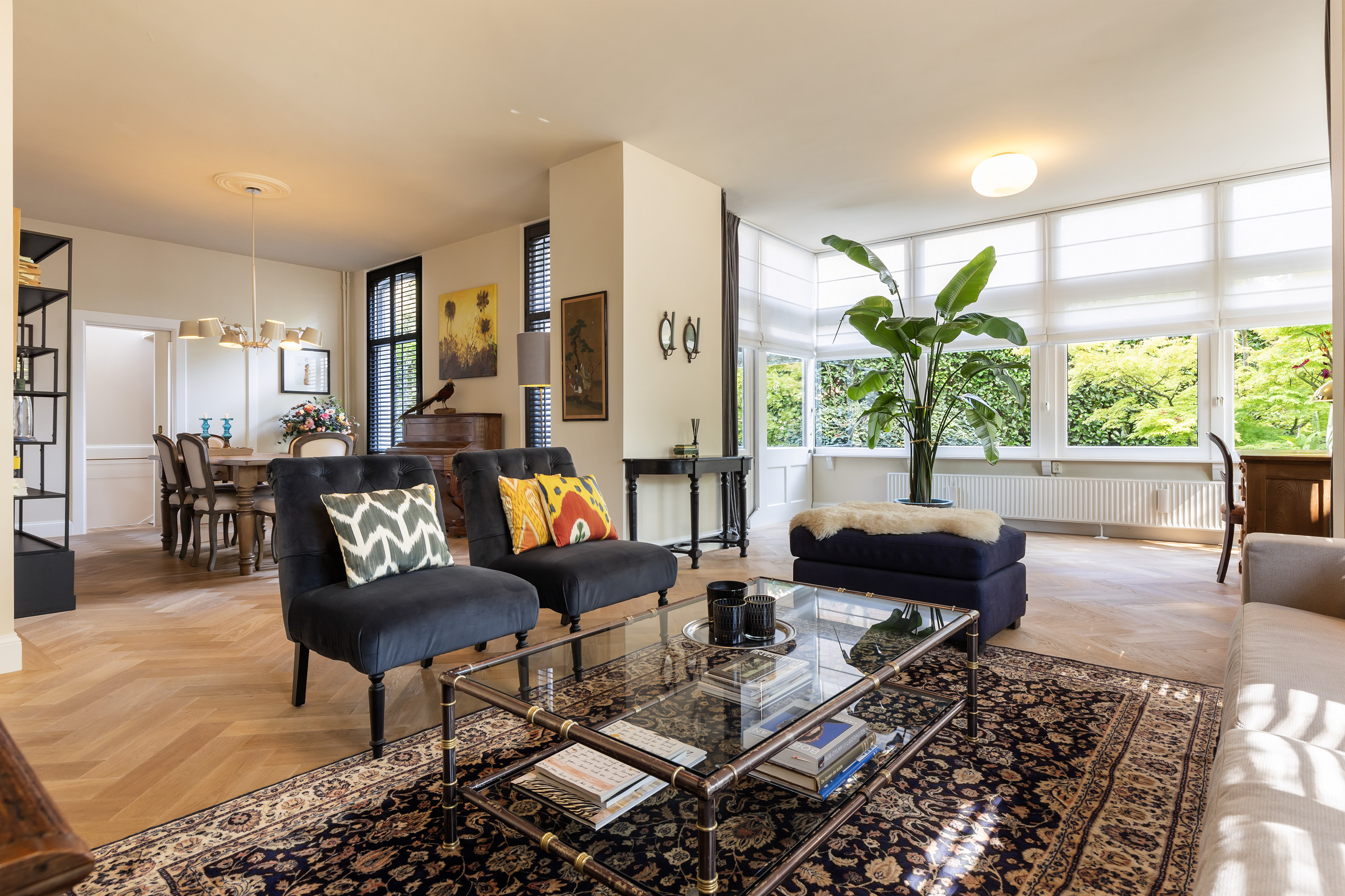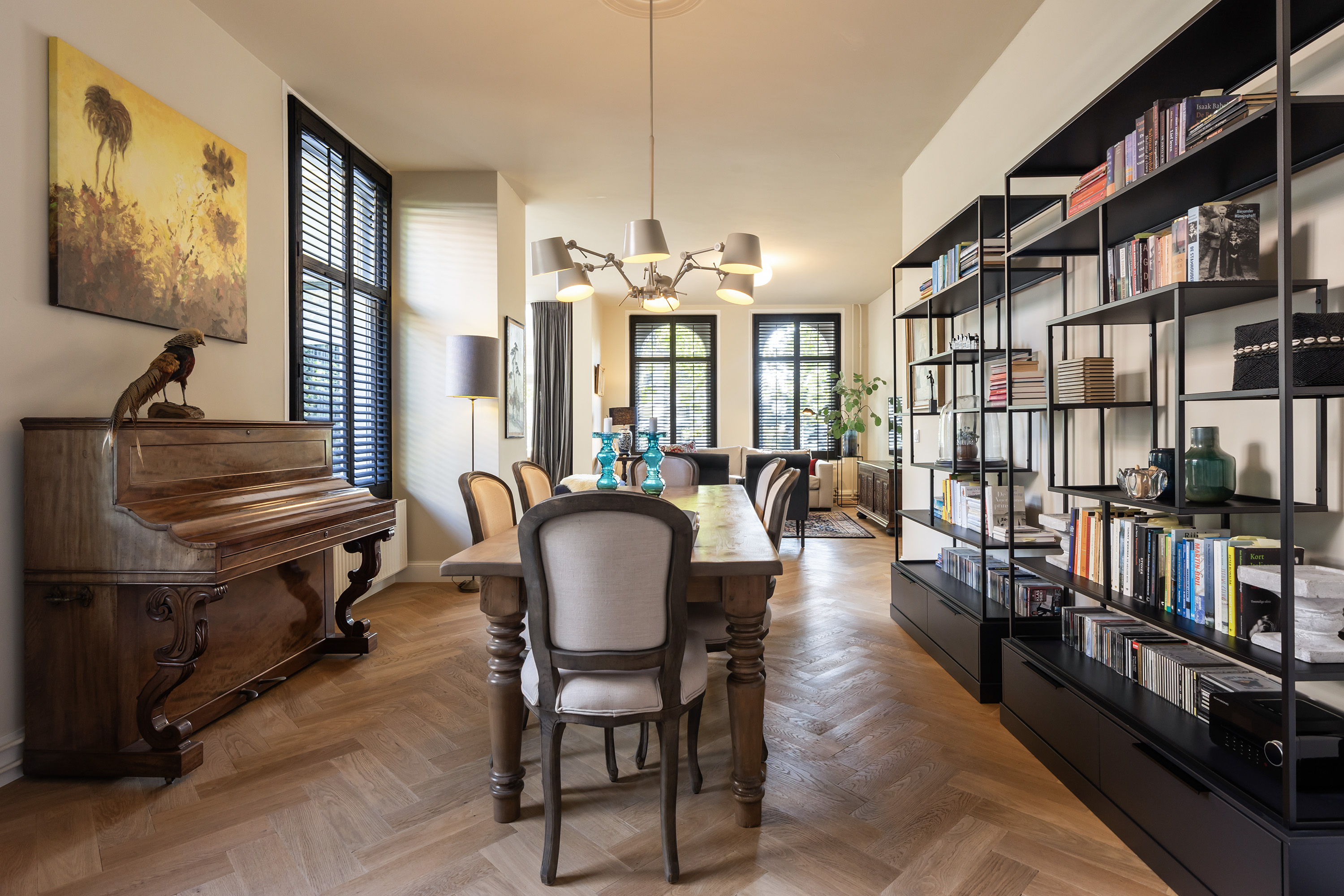 The spacious living room, with high decorative ceilings and large arched windows, exudes elegance and character. The sitting area offers views over the Oranjepark, while the bright conservatory with French doors to the garden provides a perfect spot to unwind. The combination of authentic details and black shutters creates a tasteful balance between light and privacy.
