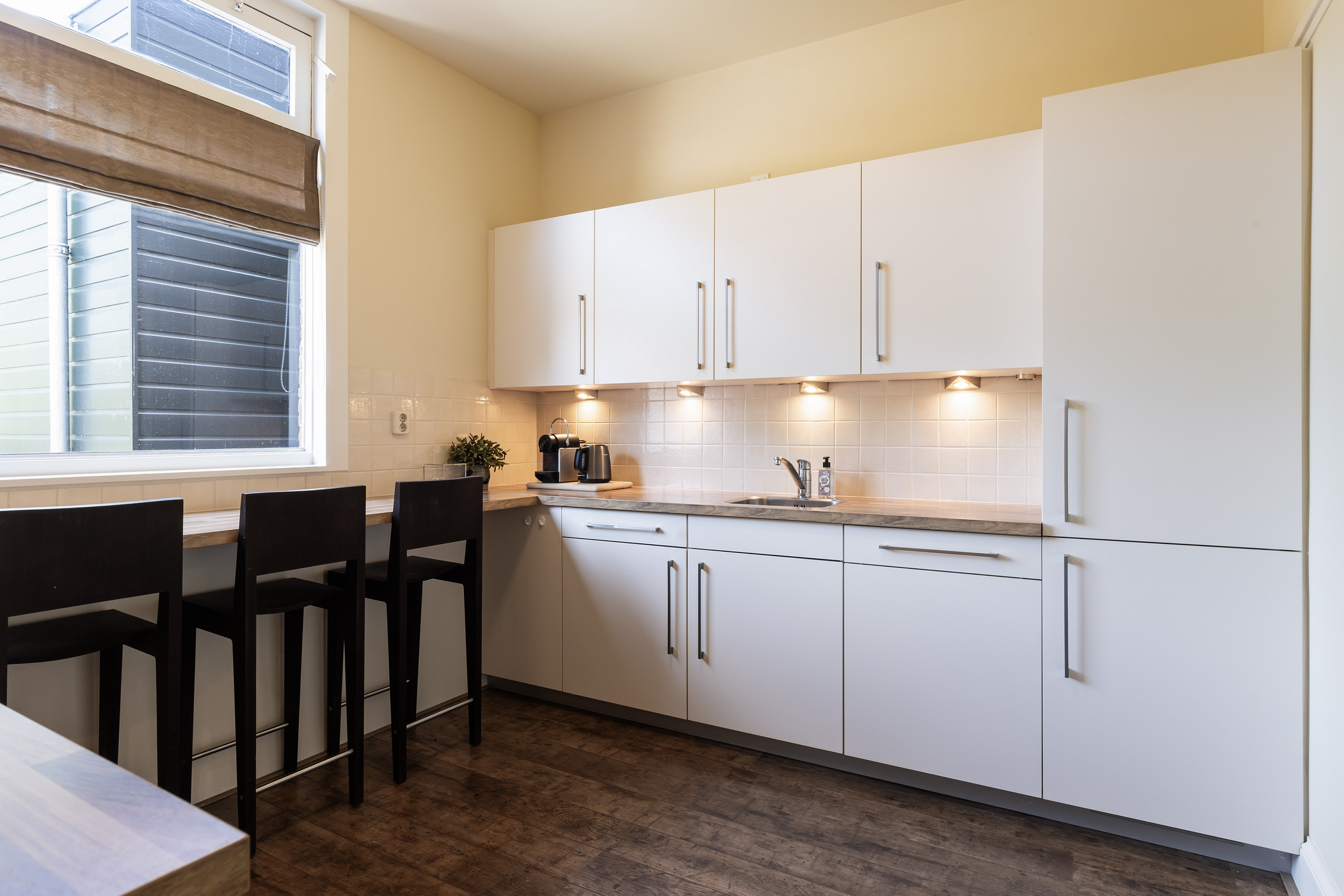 The first floor comprises two generous bedrooms and a modern bathroom. The main bedroom at the front has access to a large roof terrace, offering privacy and a superb view over the Oranjepark. The second bedroom is equally bright and well-proportioned.