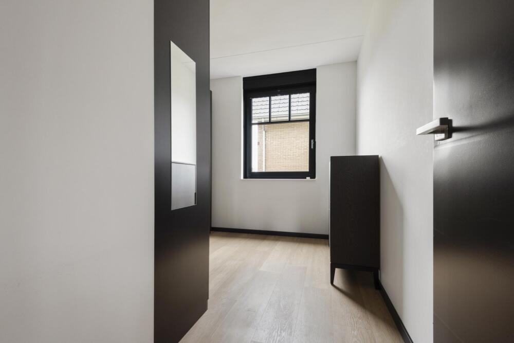 Upon entering, you are welcomed into a spacious hallway with a cloakroom area, a stylish staircase with leather-covered steps and a modern toilet. The ground floor features a sleek PVC floor with underfloor heating and cooling. From the hallway, you have a direct view of the large backyard, which immediately gives a sense of openness.