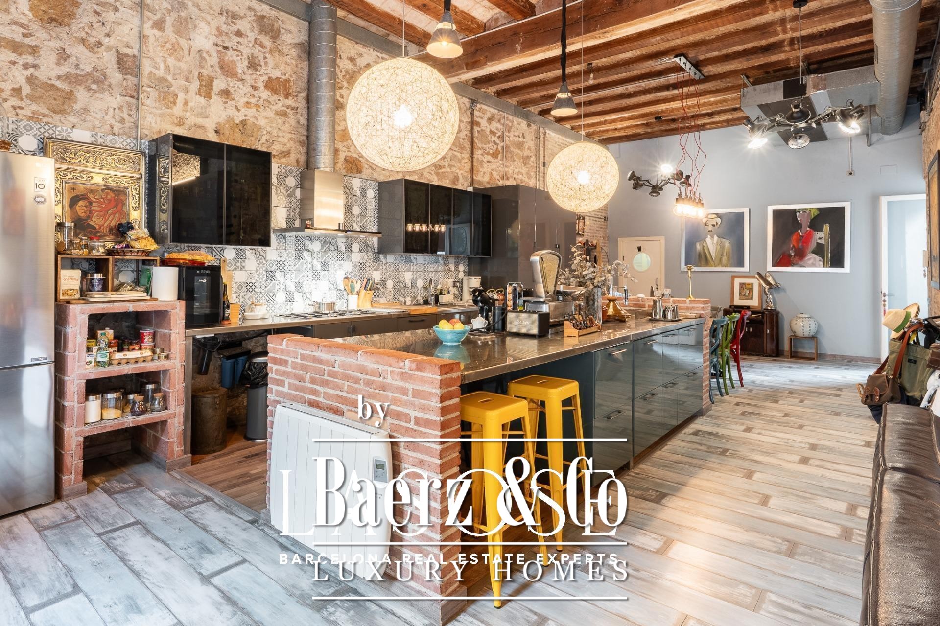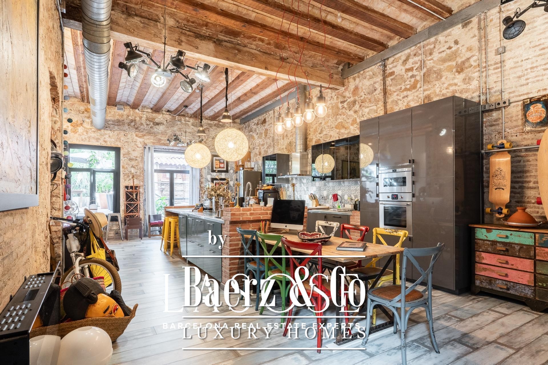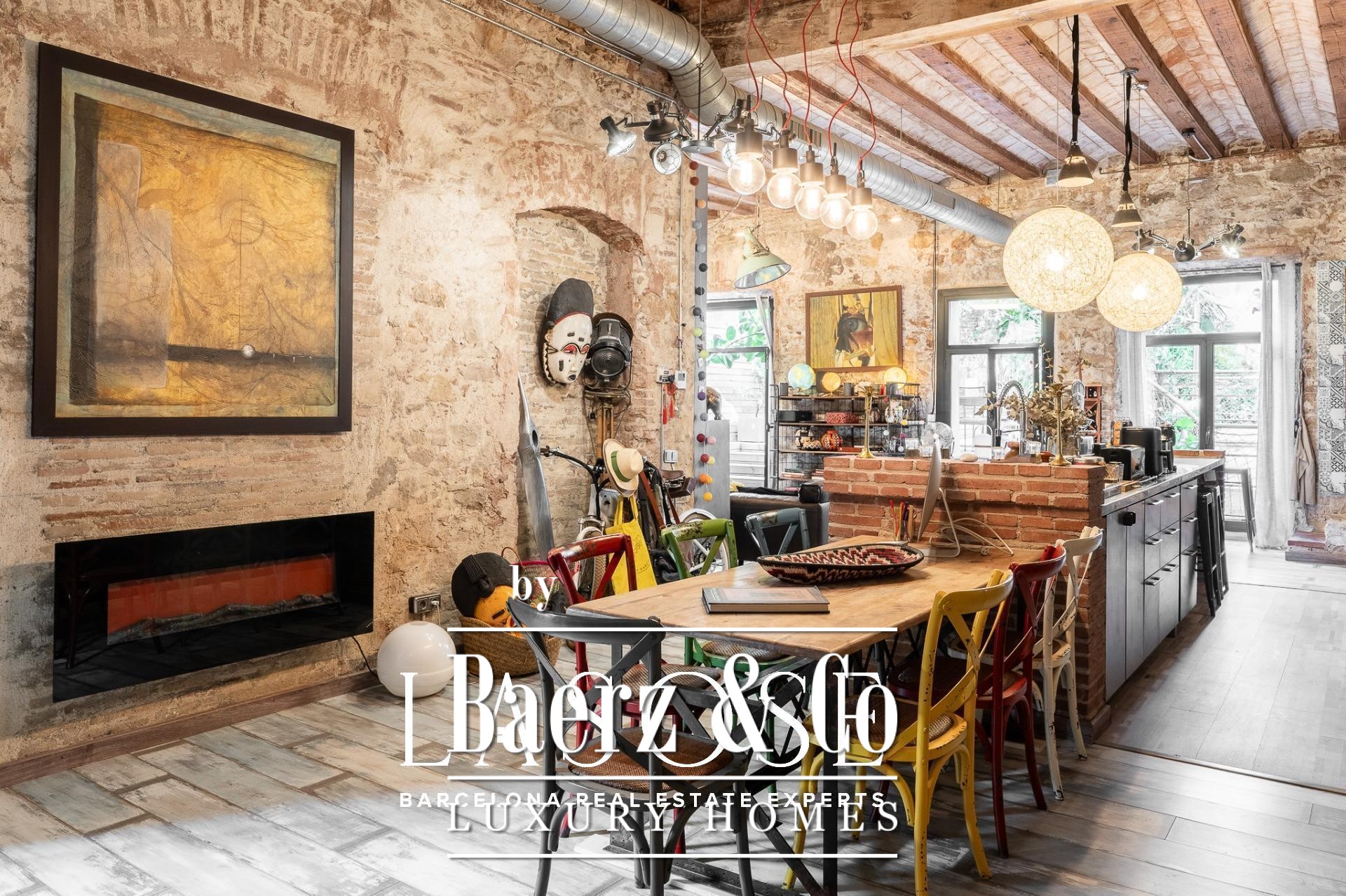 Upon entry, a corridor with floor-to-ceiling windows fills the space with natural light and frames serene views of an interior patio. Three double bedrooms, each with private bathroom, are positioned for privacy and tranquility. A large multifunctional room offers flexibility for work or leisure. The day area is defined by its soaring five-meter ceilings, original brickwork, and decorative tile. The open kitchen flows seamlessly into a living room warmed by a wood fireplace.