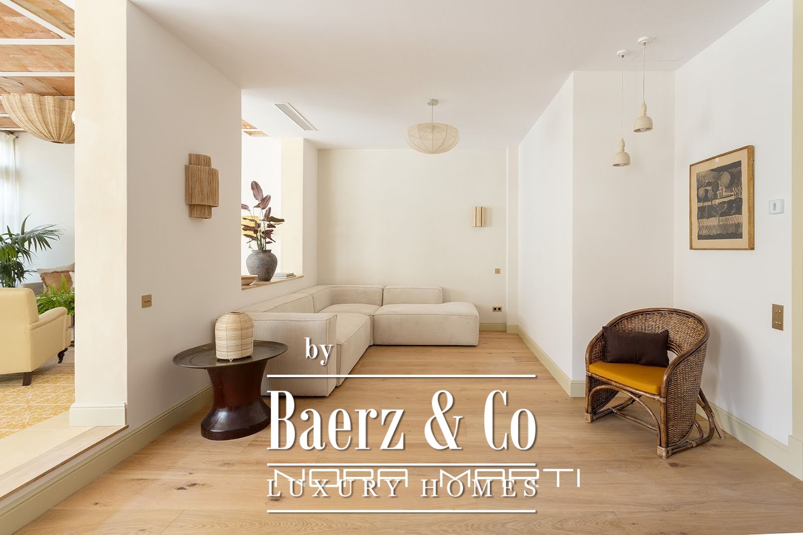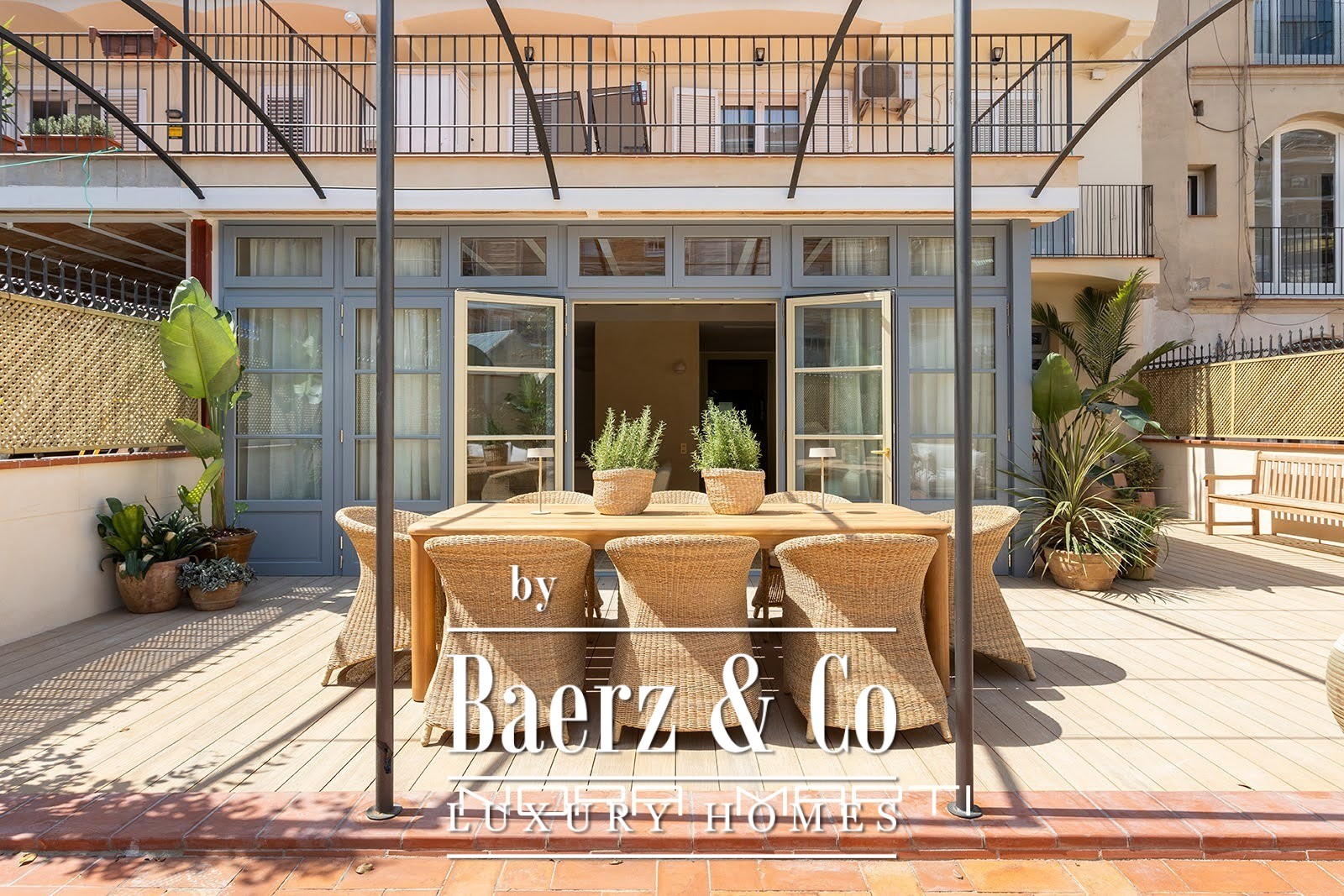 The luxurious renovation focuses on quality and detail while preserving the building's original features and charm. A Catalan vaulted ceiling is visible throughout the apartment, enhancing the feeling of spaciousness and light. The ceiling transforms the living room into a truly exceptional space, featuring handcrafted local tiles and floor-to-ceiling windows that open onto a tranquil terrace; this room is unique and the heart of the living area.